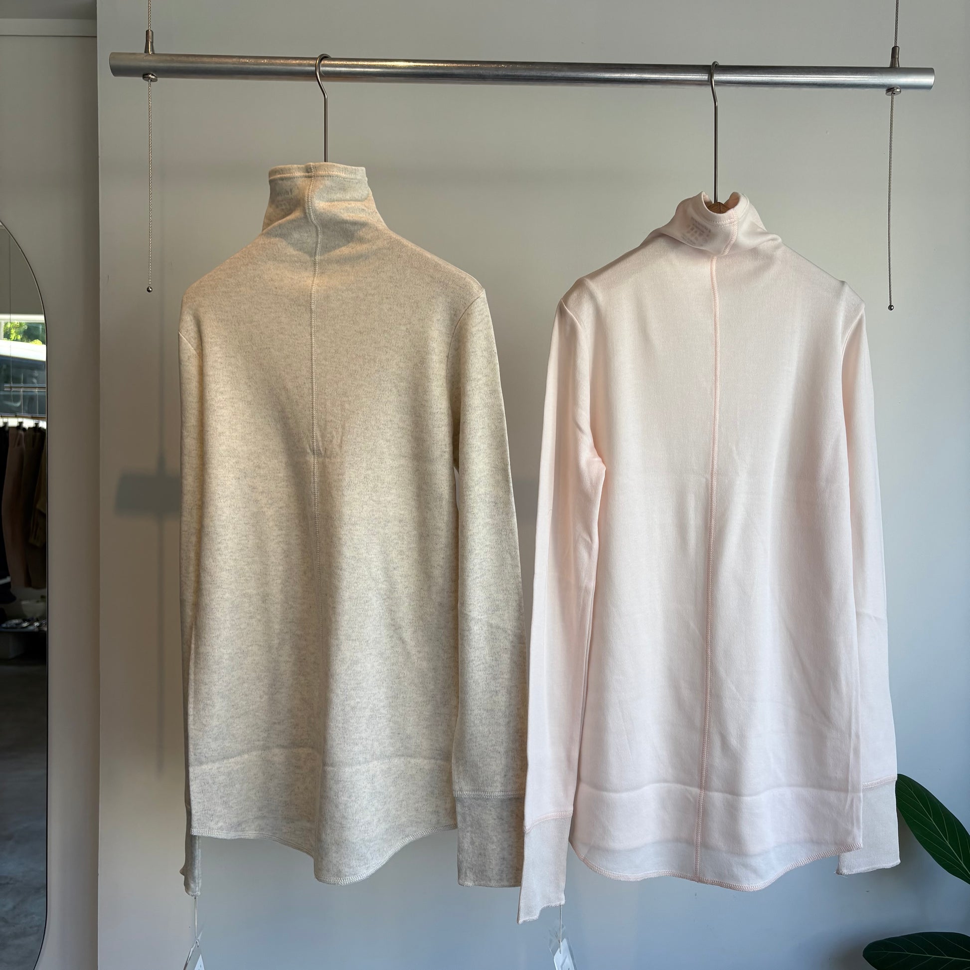ネックの前面にあたる部分は同素材・異ゲージのリブニットが配されている独特のパターンで、締め付けられることなくフィットするハイネックに。