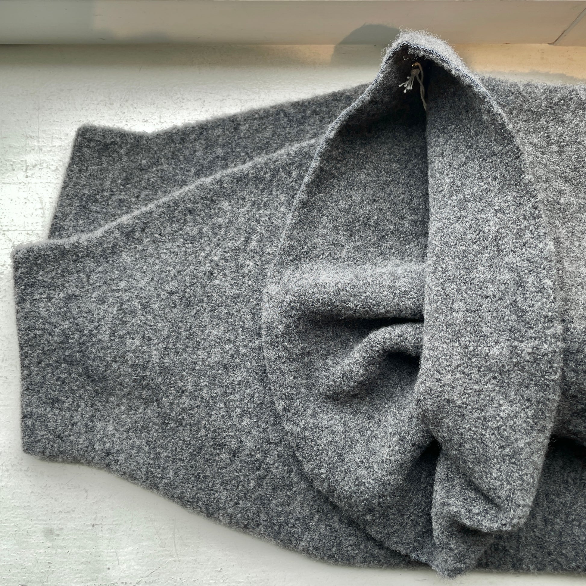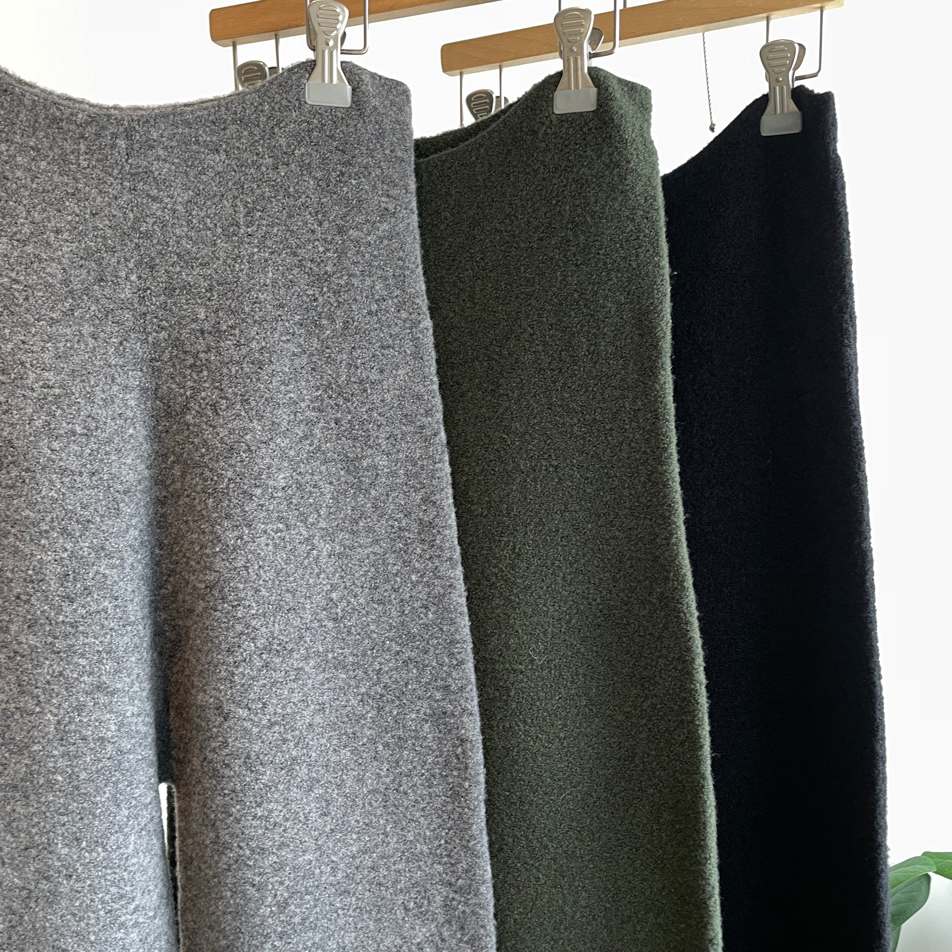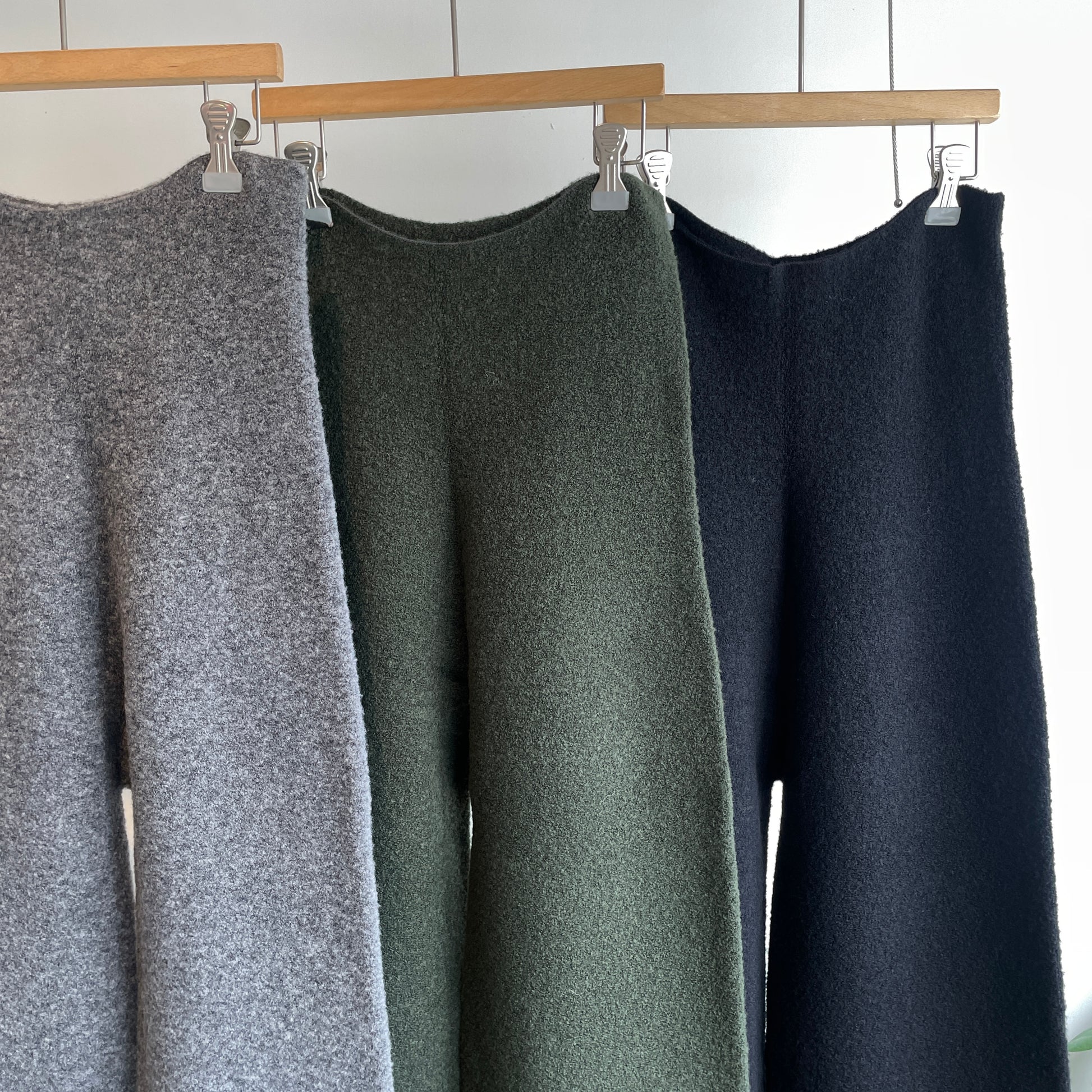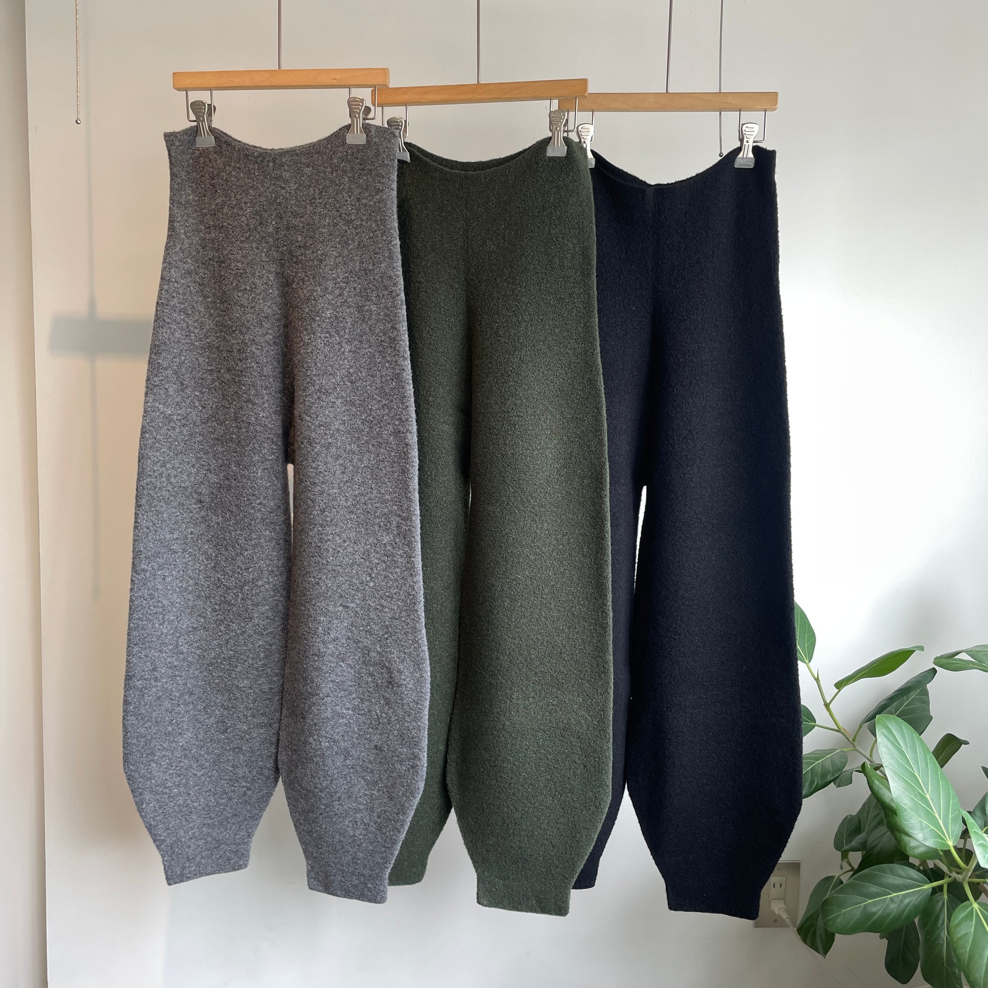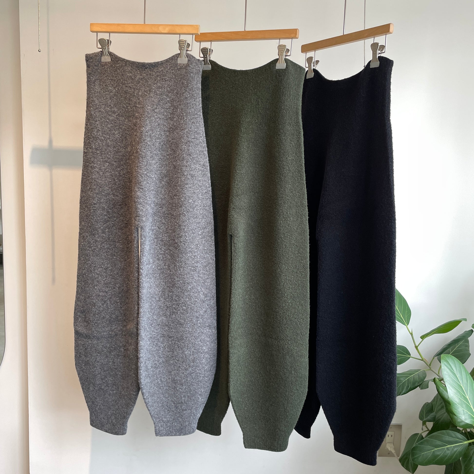 ギュッとストレッチしたブークレのあたたか味が、⾝体を包み込む腹巻きタイプのニットパンツ。