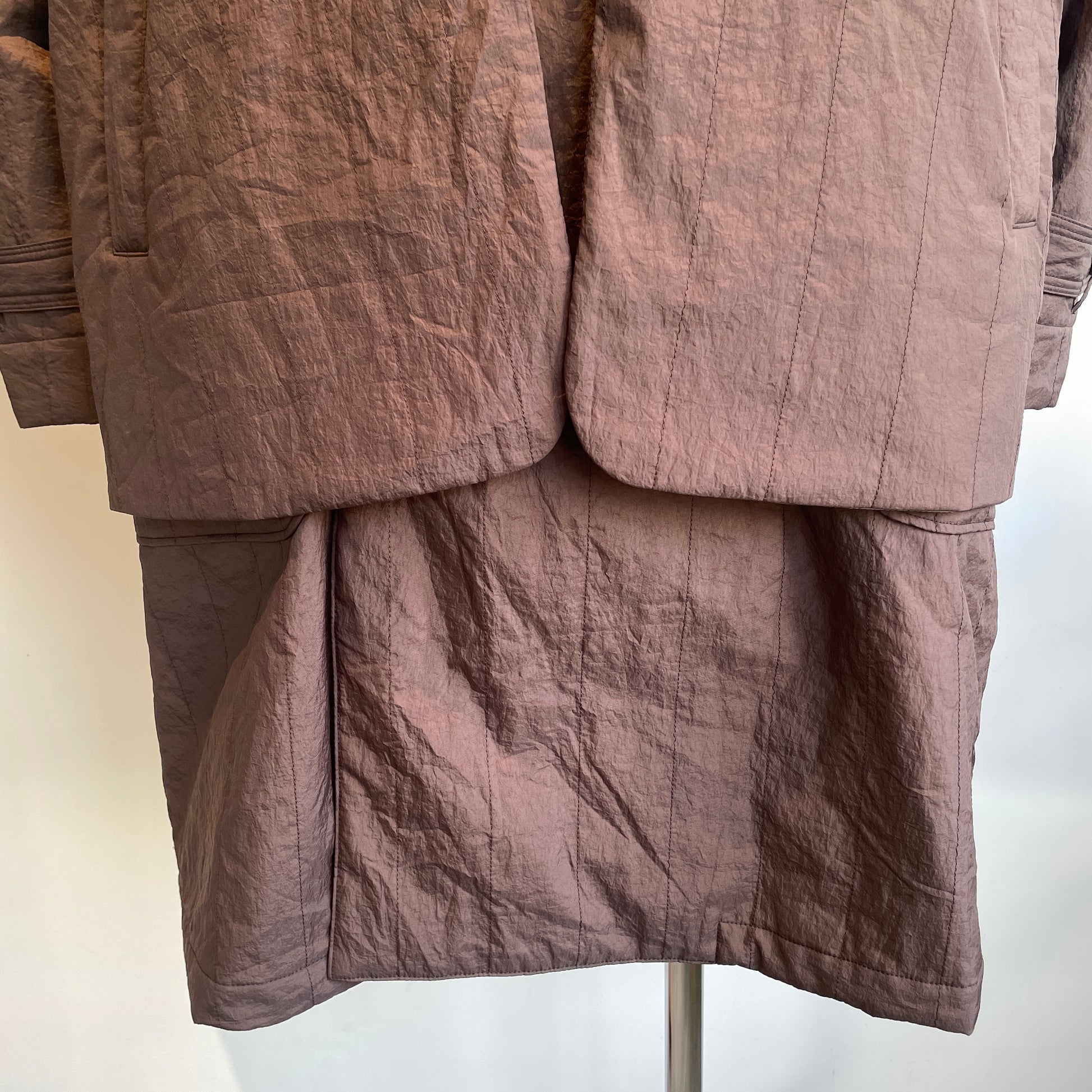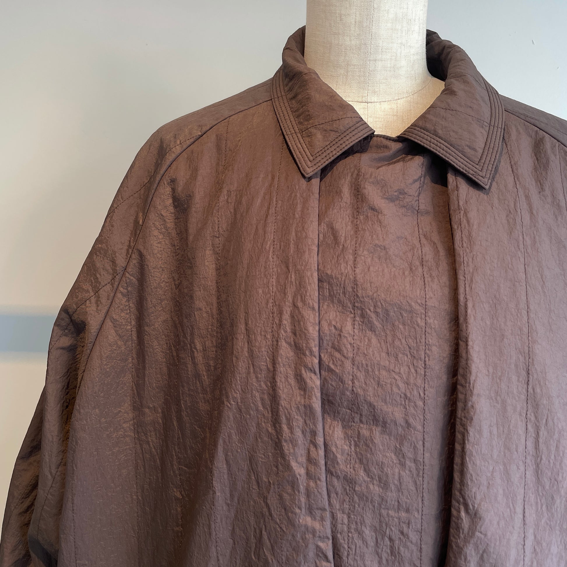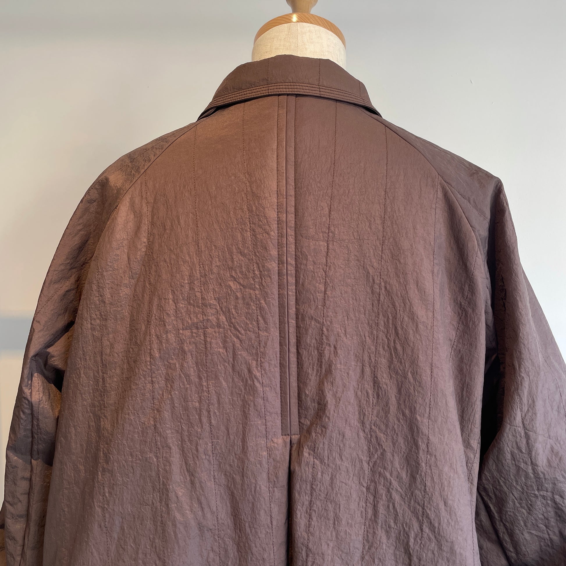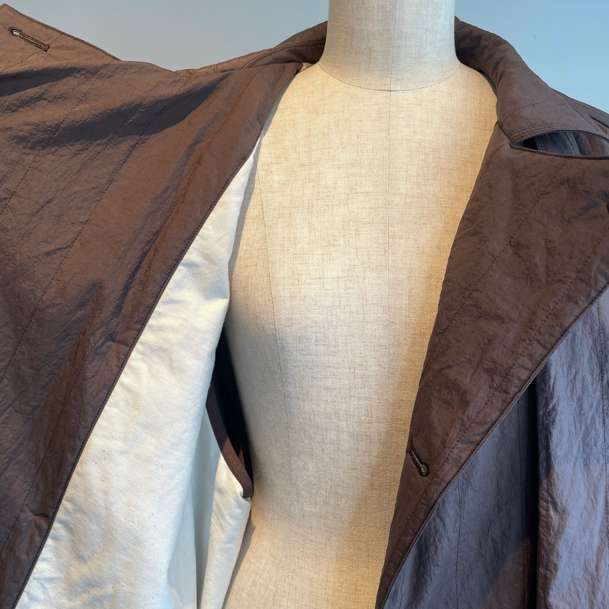 不織布を挟んでキルティングしたあとに、東炊きという加工機に投入し、長時間攪拌して風合いを出しているため、ステッチ部分に独特な凹凸感があります。絶妙な柔らかい風合いにより、ナイロンの硬さが和らぎ、生地の表面変化を楽しめるかと思います。