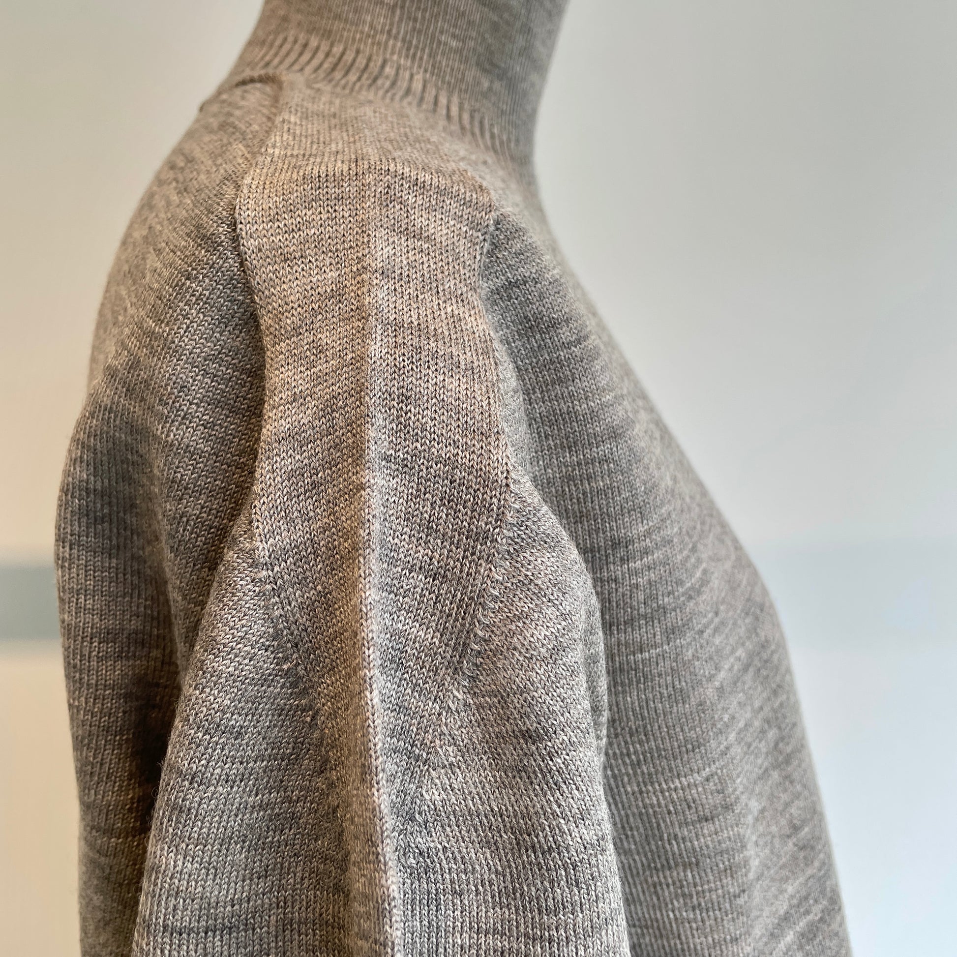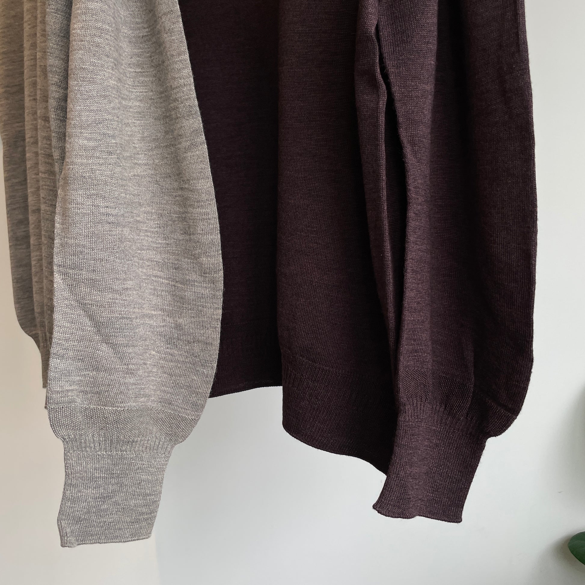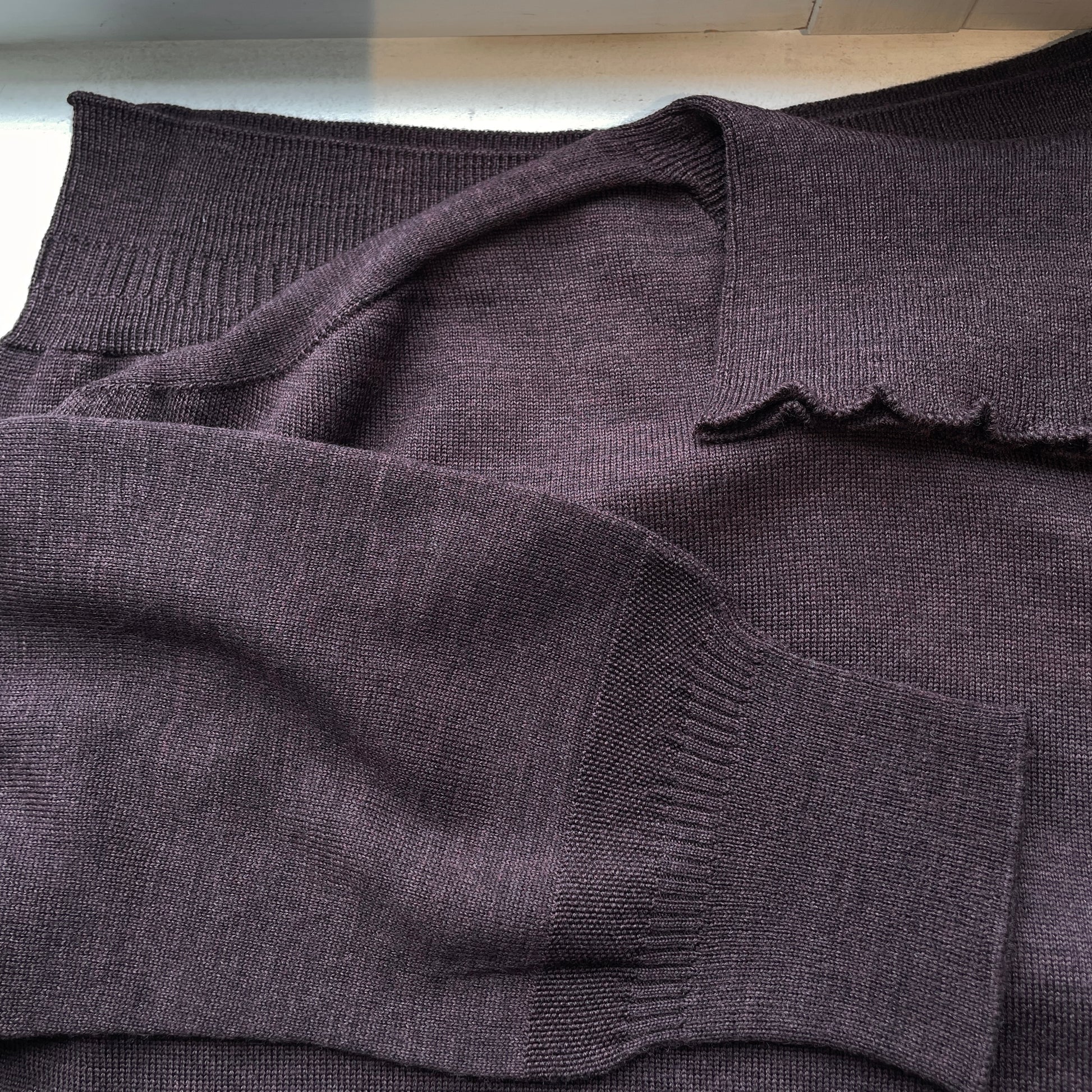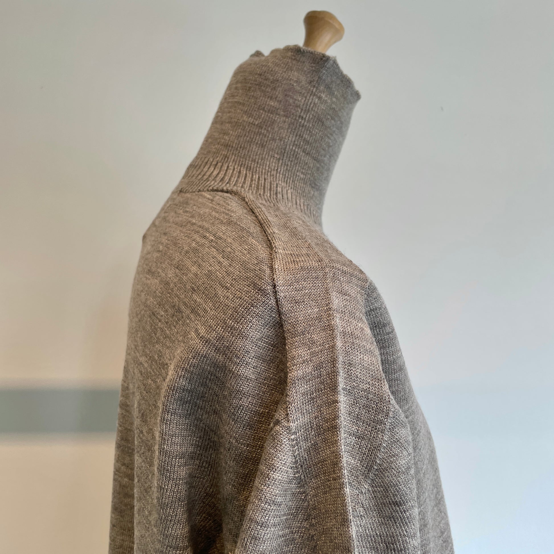 その特徴を活かして、袖に立体的な傾斜とカーブを付けて前振りのデザインにしており着た際や平置きの際に、昔のジャケット袖のようになっています。布帛だと手を下ろした際に負荷がかかり、着心地が良くないですが、ニットだと伸縮がある為問題ありません。