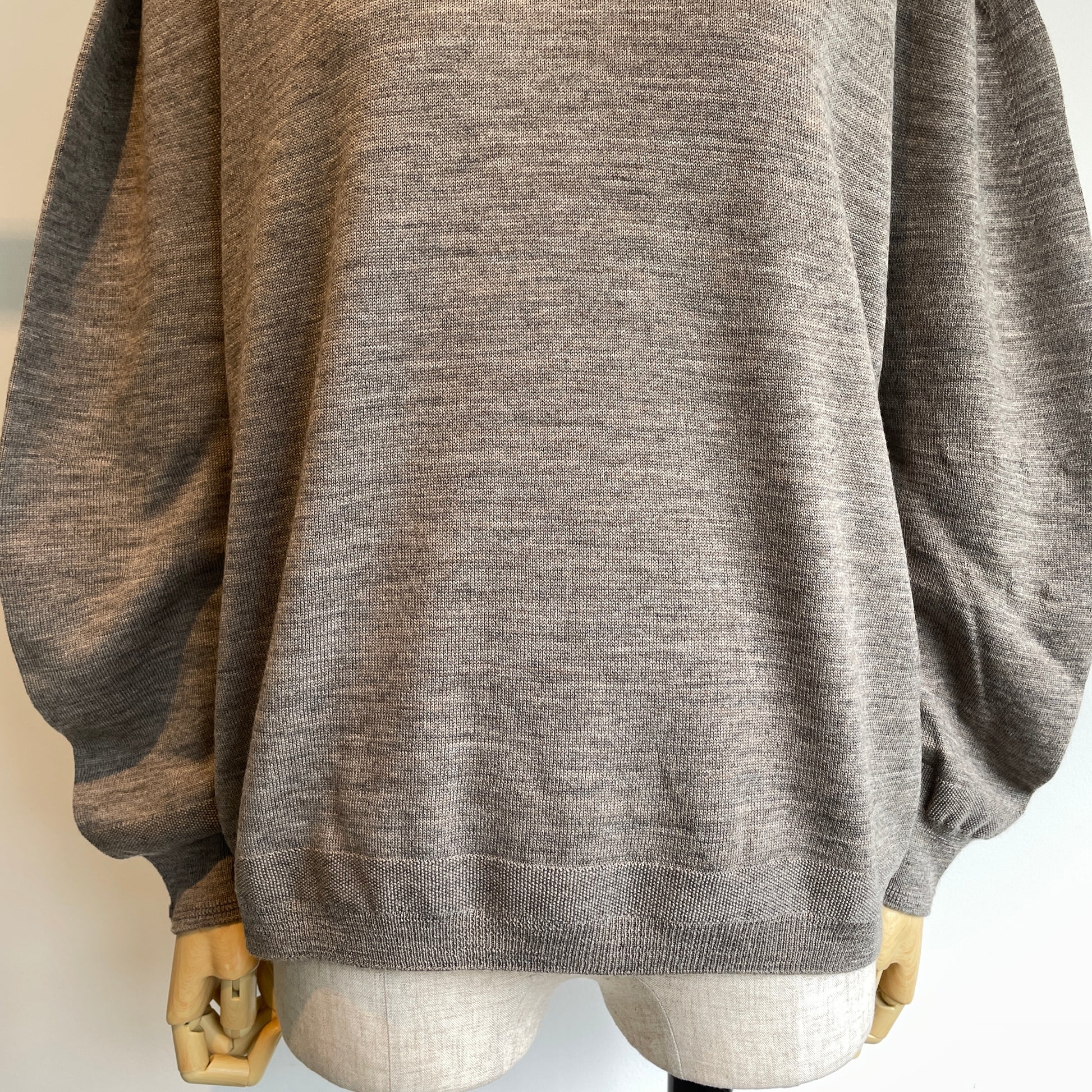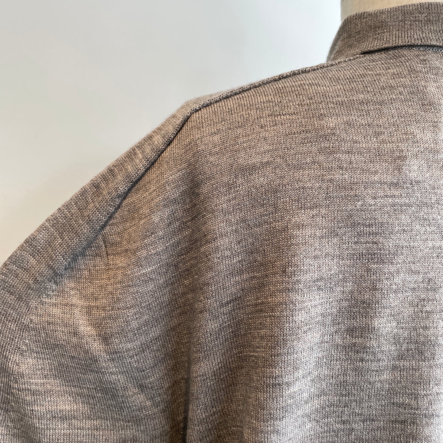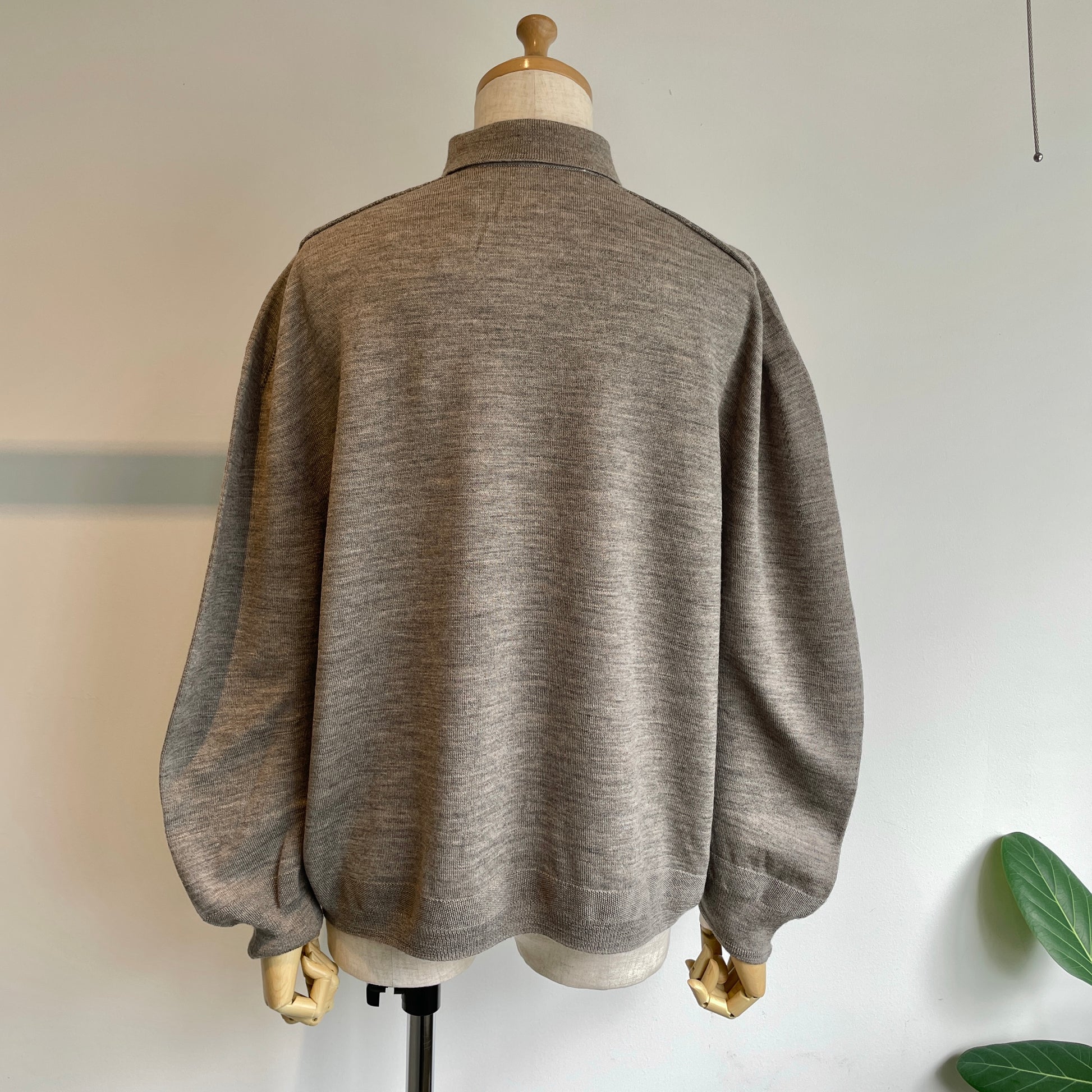 その特徴を活かして、袖に立体的な傾斜とカーブを付けて前振りのデザインにしており着た際や平置きの際に、昔のジャケット袖のようになっています。布帛だと手を下ろした際に負荷がかかり、着心地が良くないですが、ニットだと伸縮がある為問題ありません。