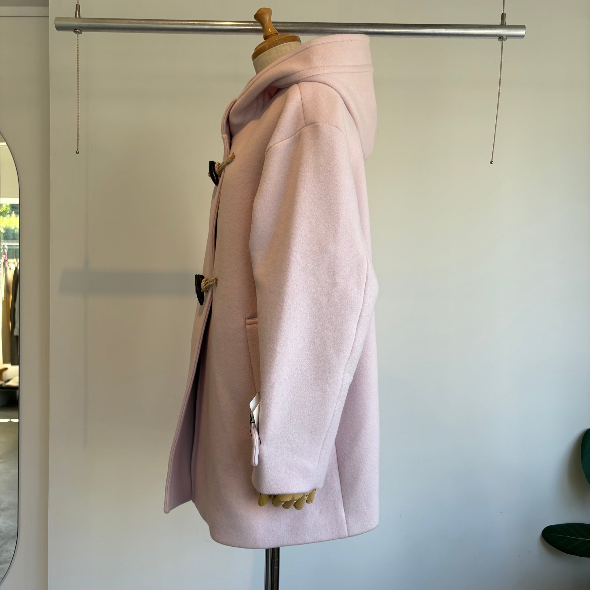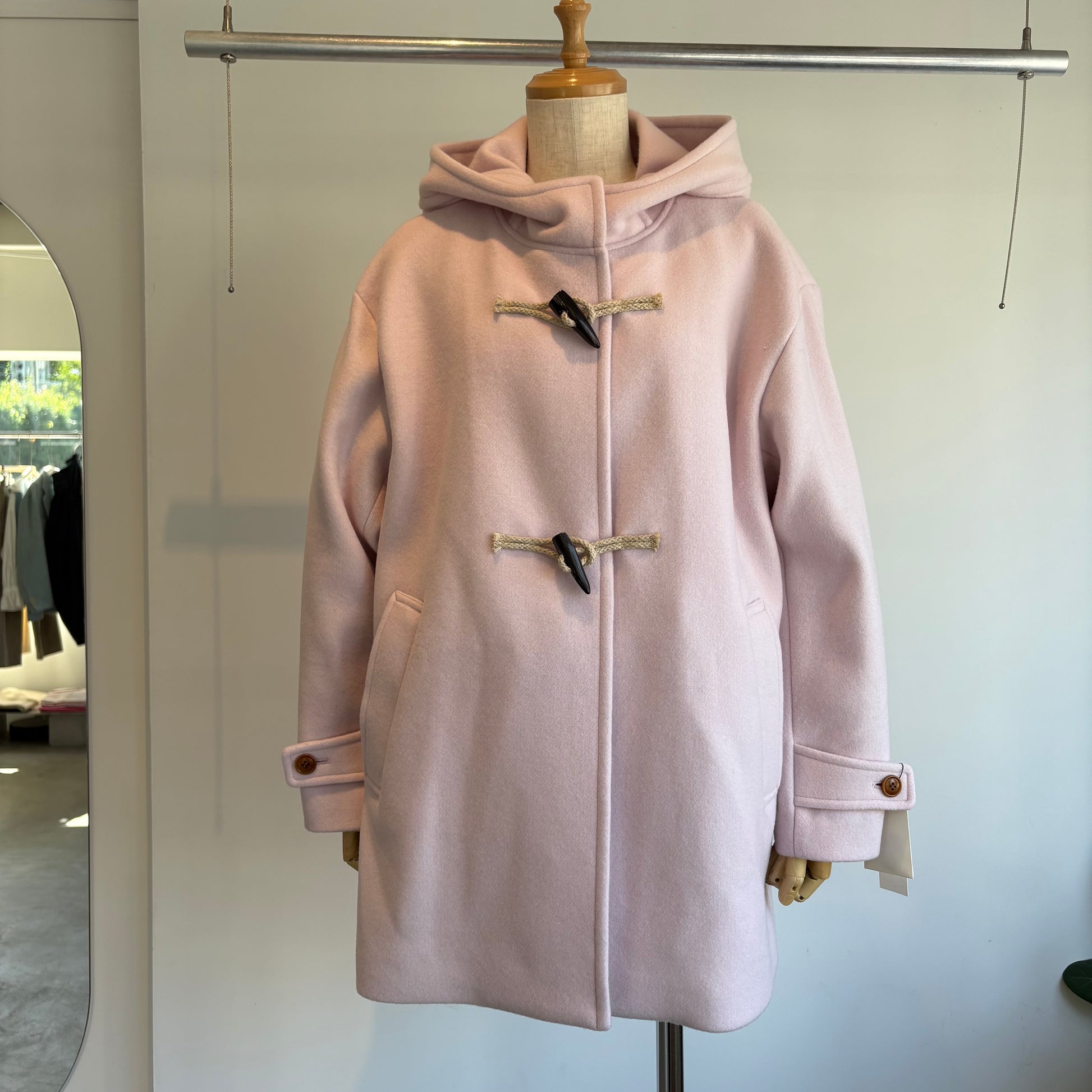 着丈の長さもちょうど良いので、パンツもスカートもワンピースにも。何にでも合わせやすいダッフルコートです。