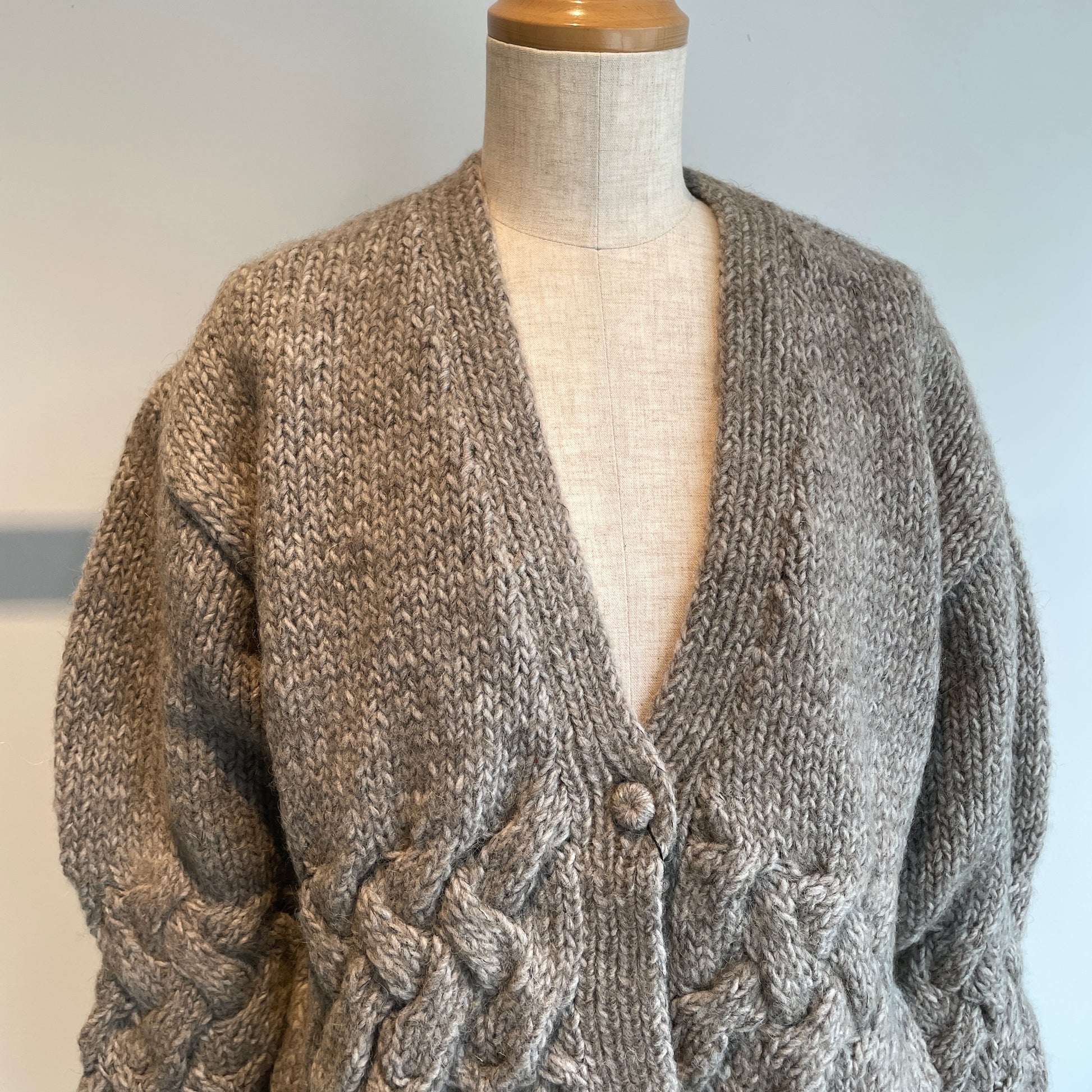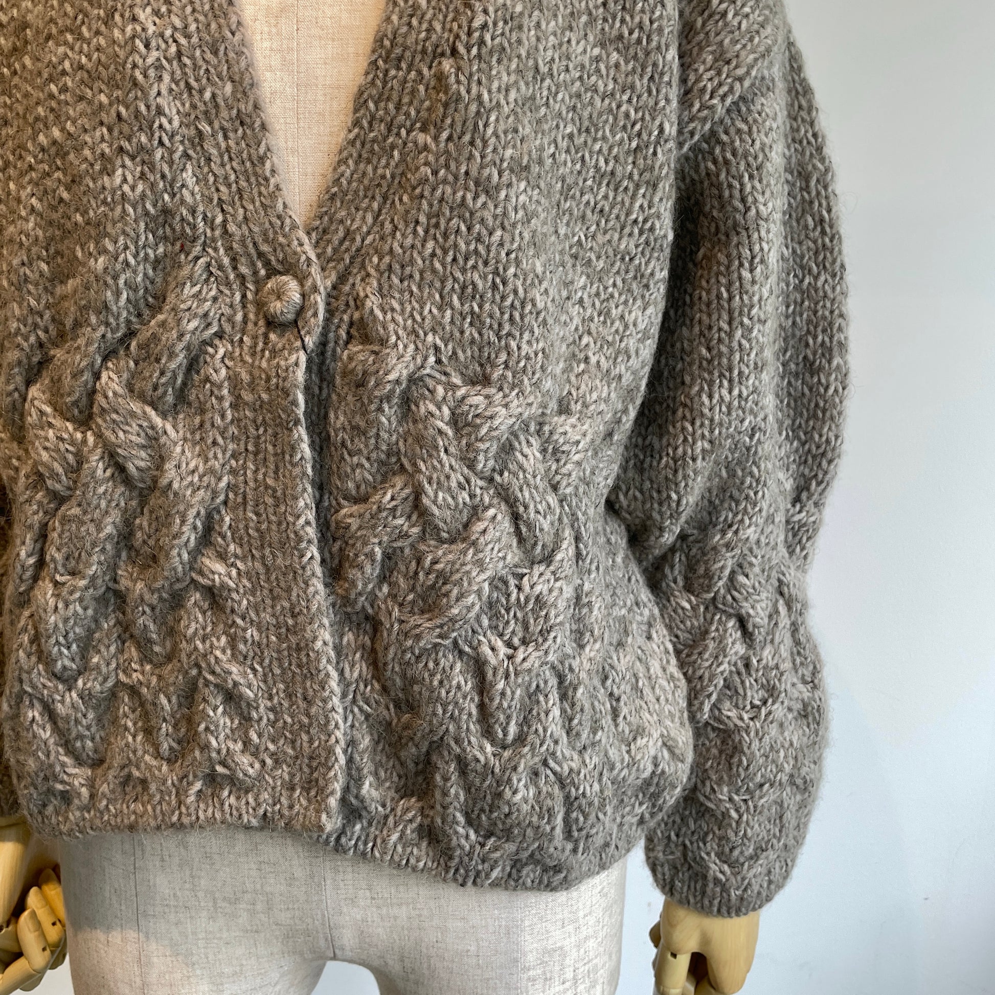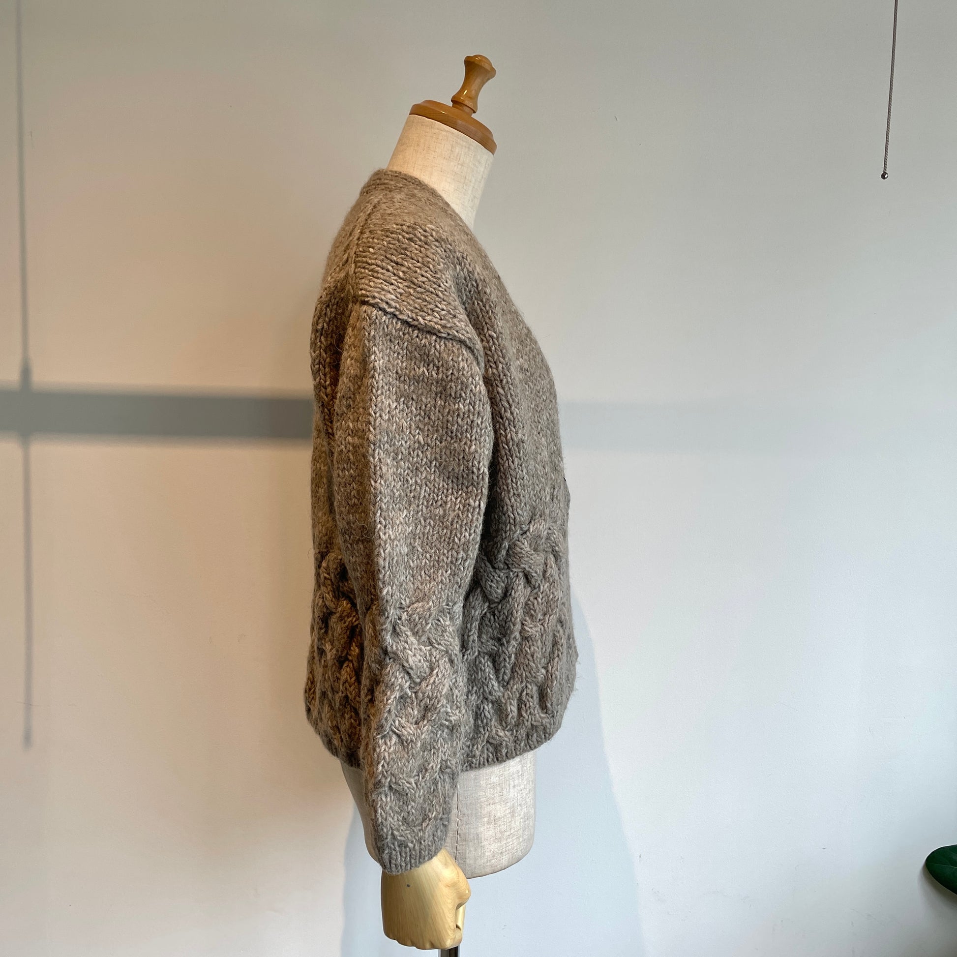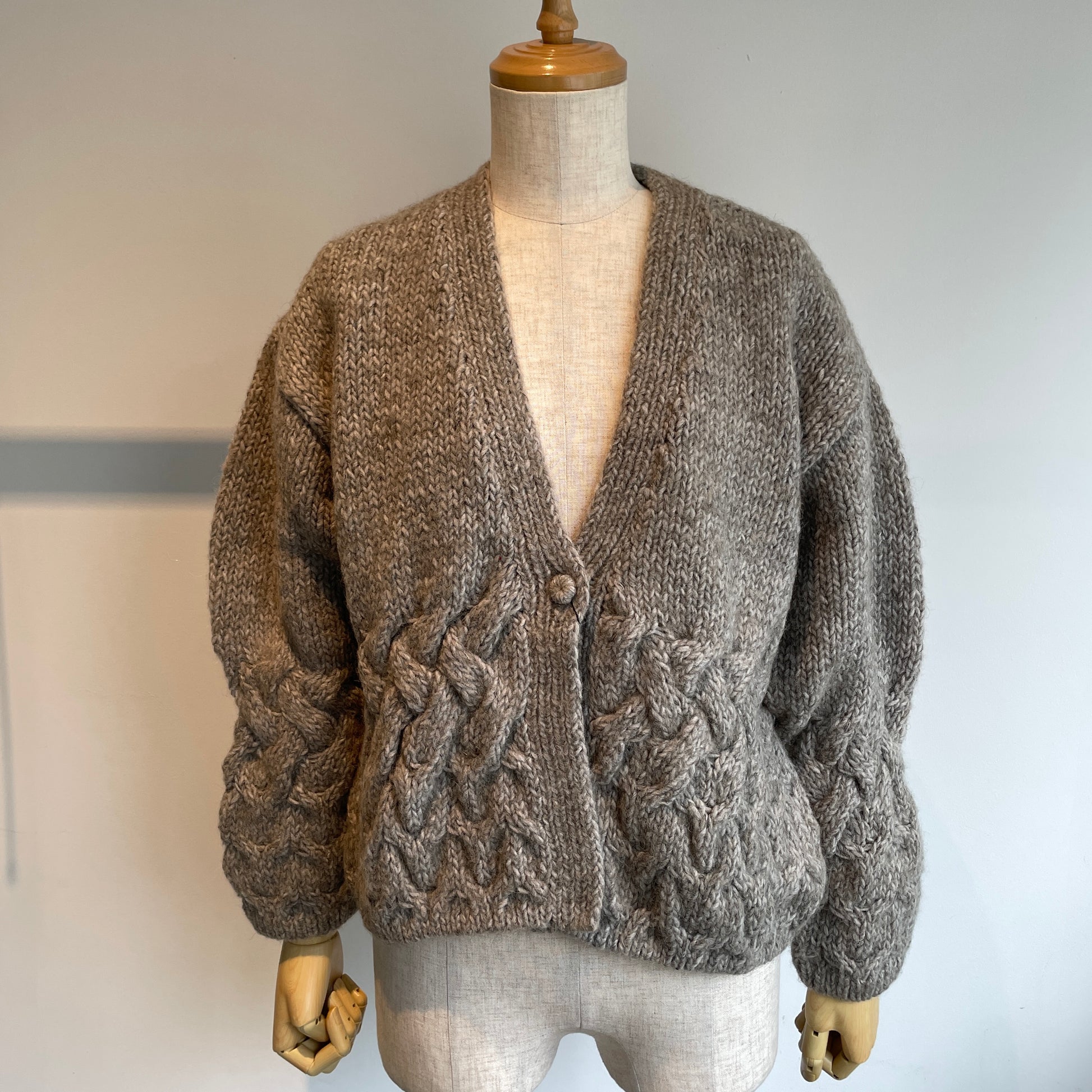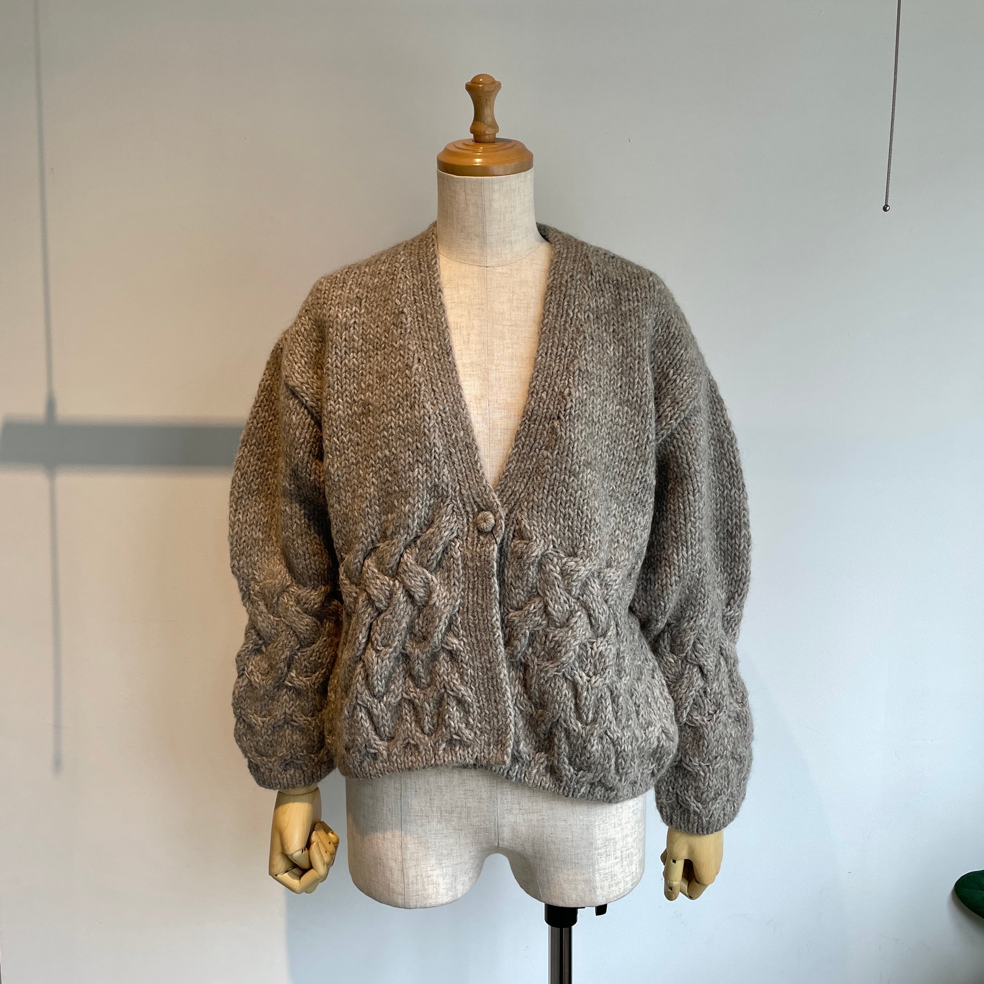 編み地、くるみボタンも可愛い、暖かくて軽いカーディガンです。