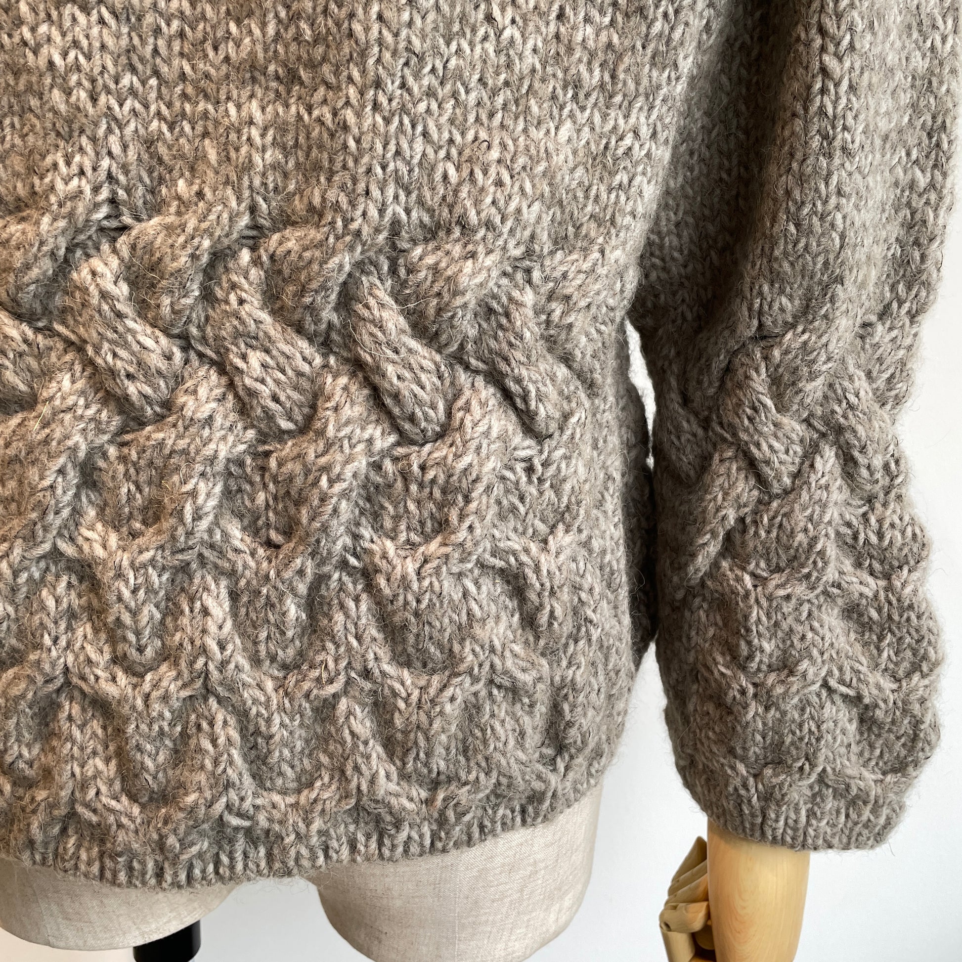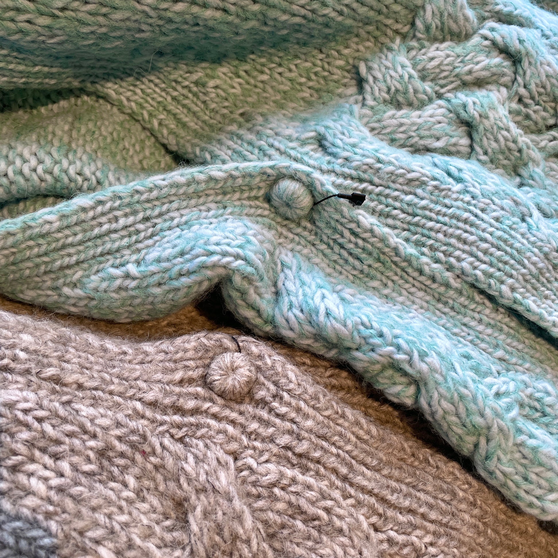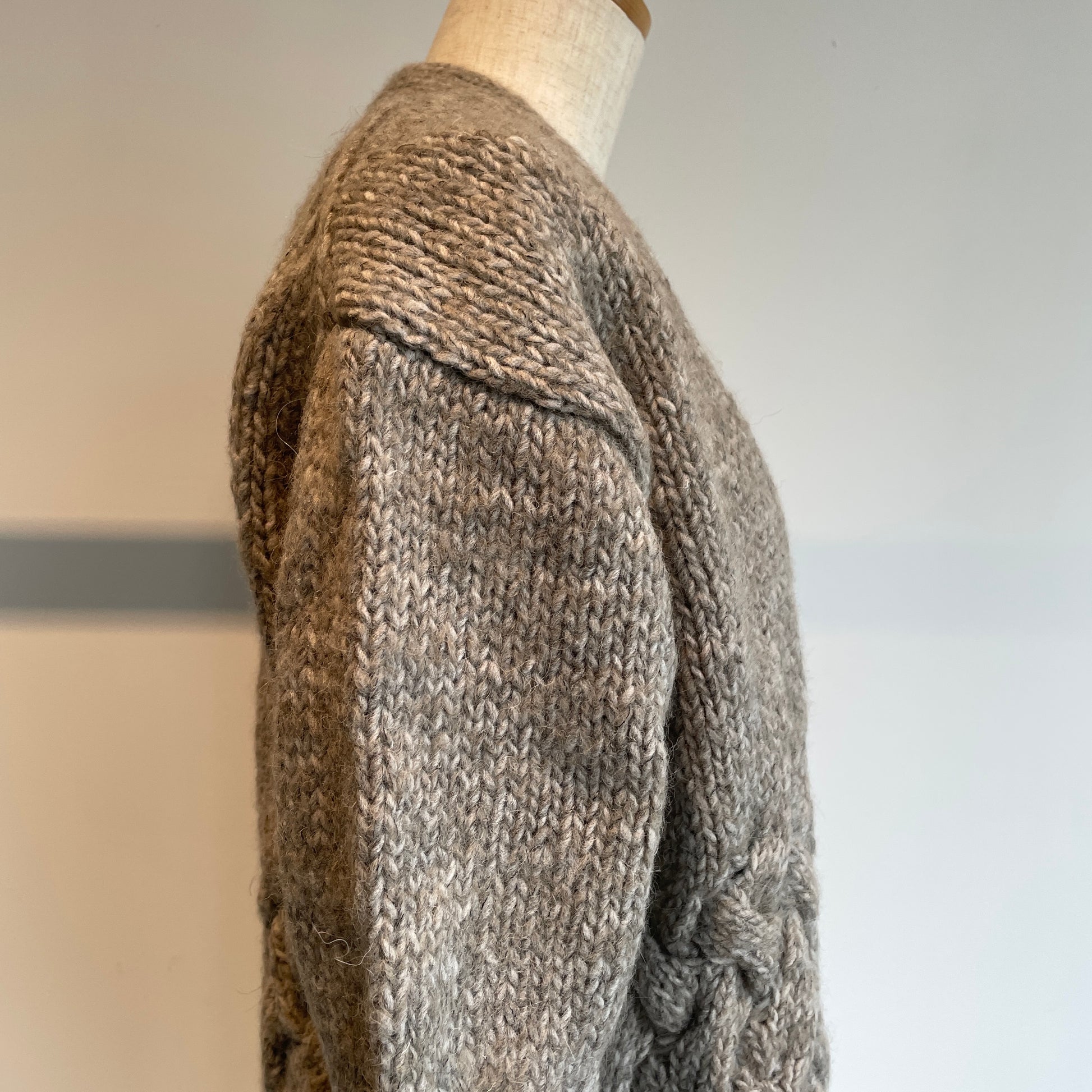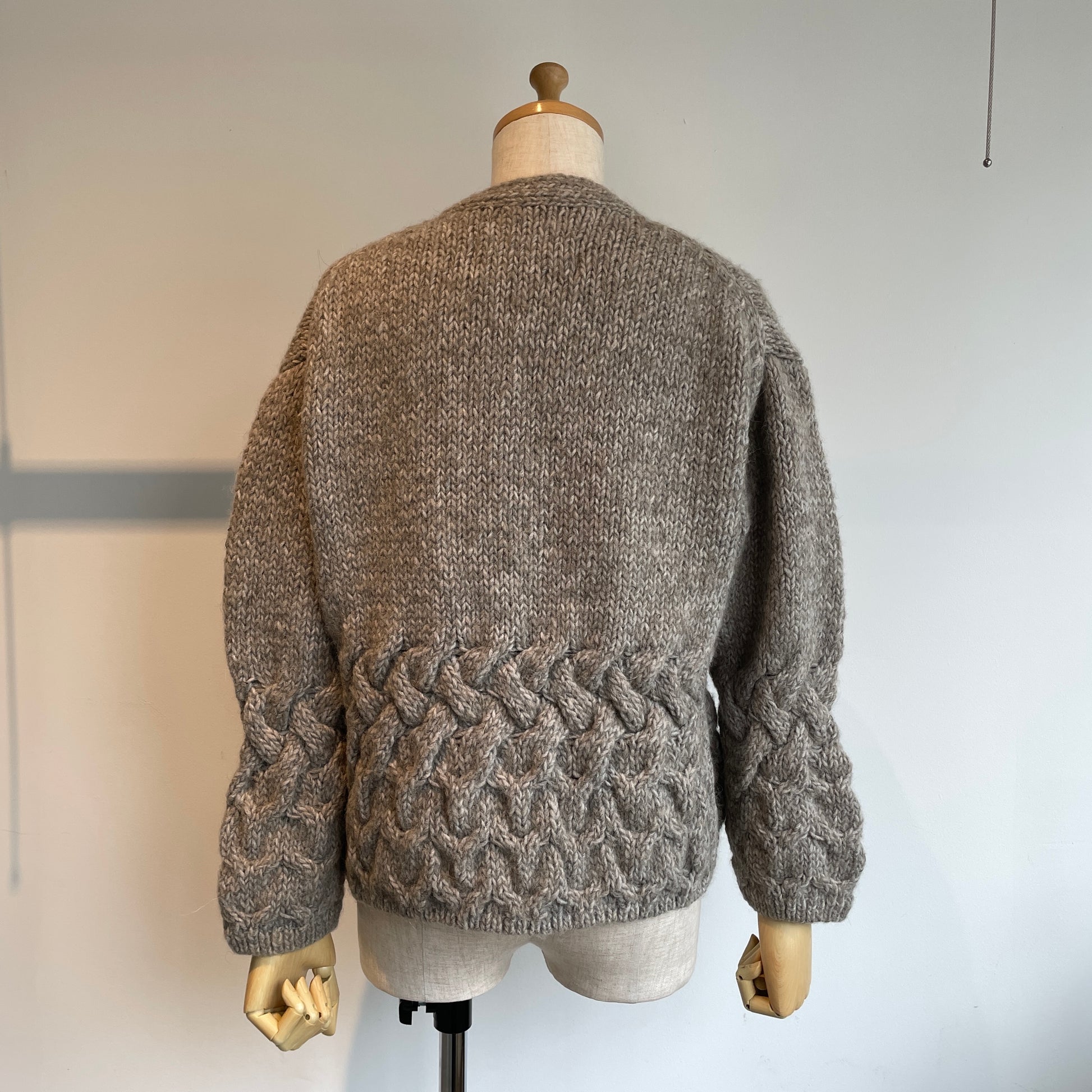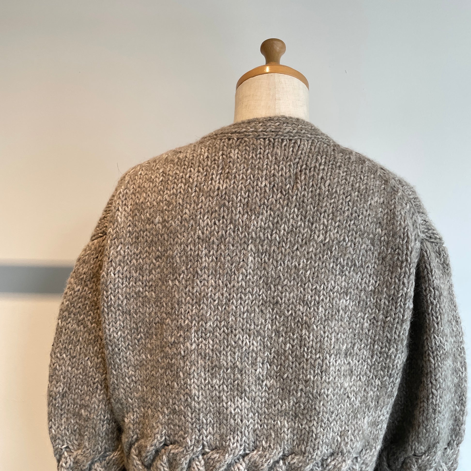 編み地、くるみボタンも可愛い、暖かくて軽いカーディガンです。