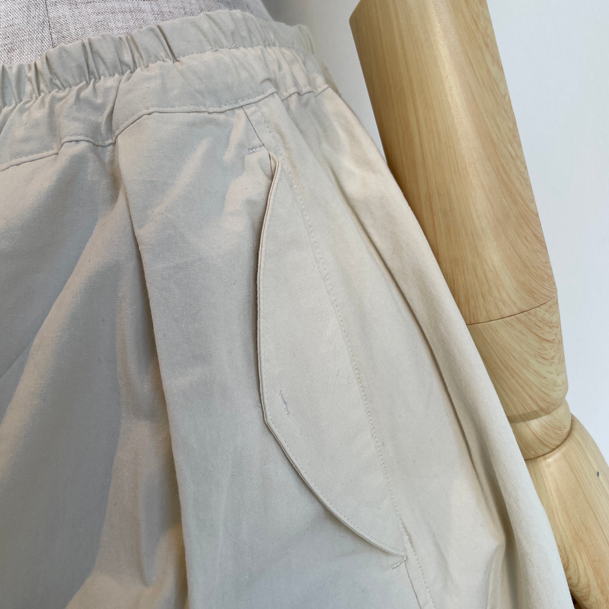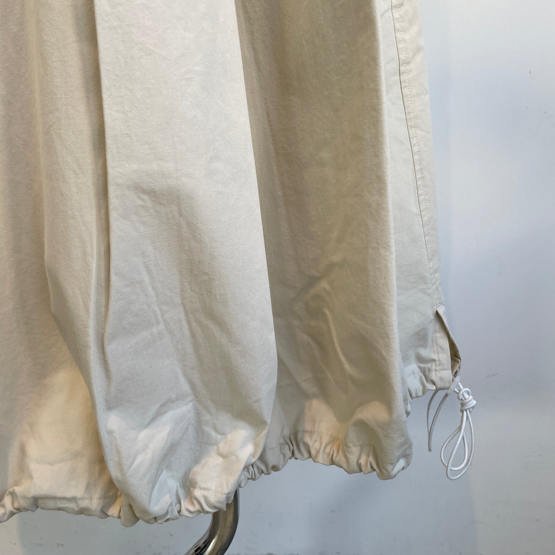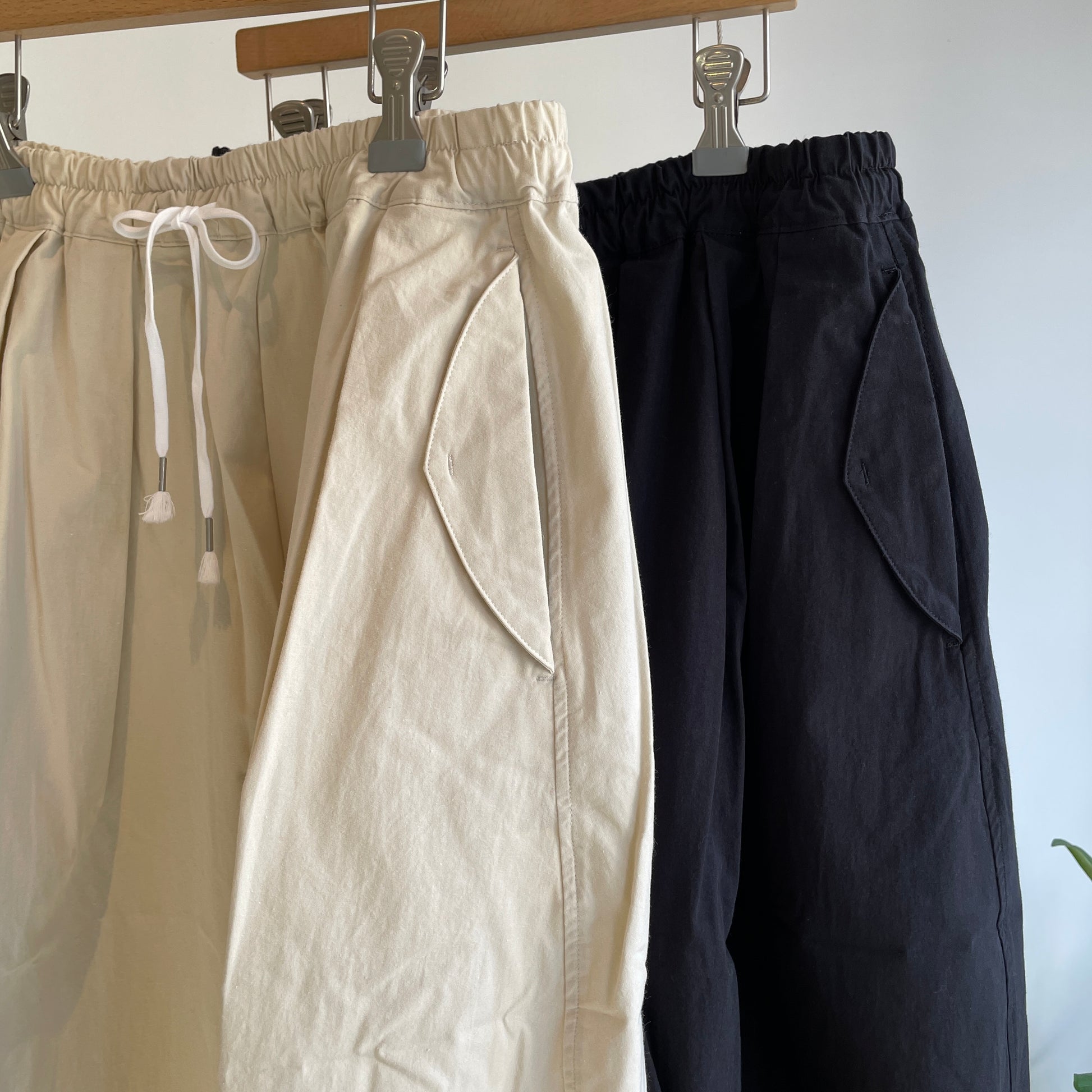 裾のドローコードで絞り調整をしながら、丸みを出して履いていただけます。