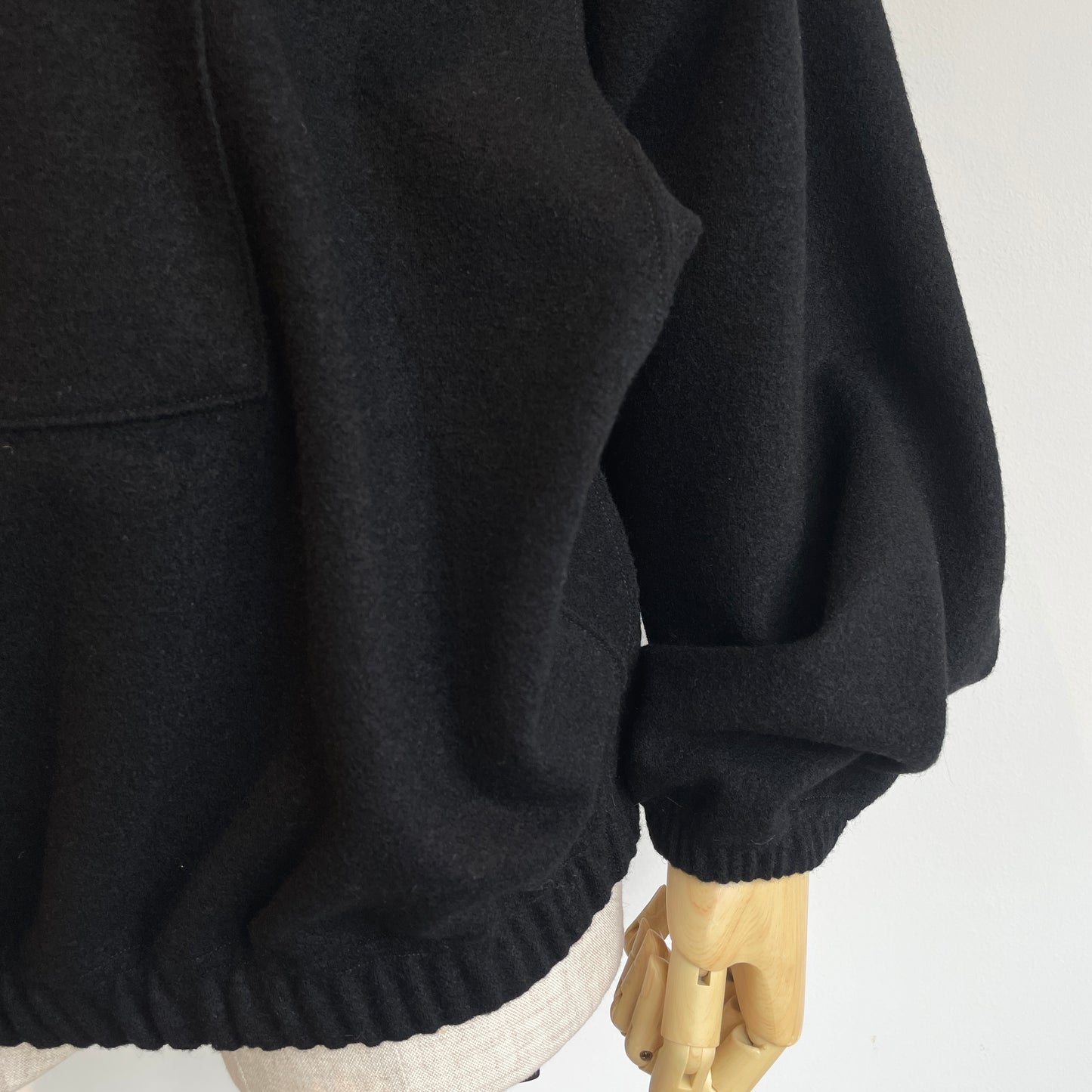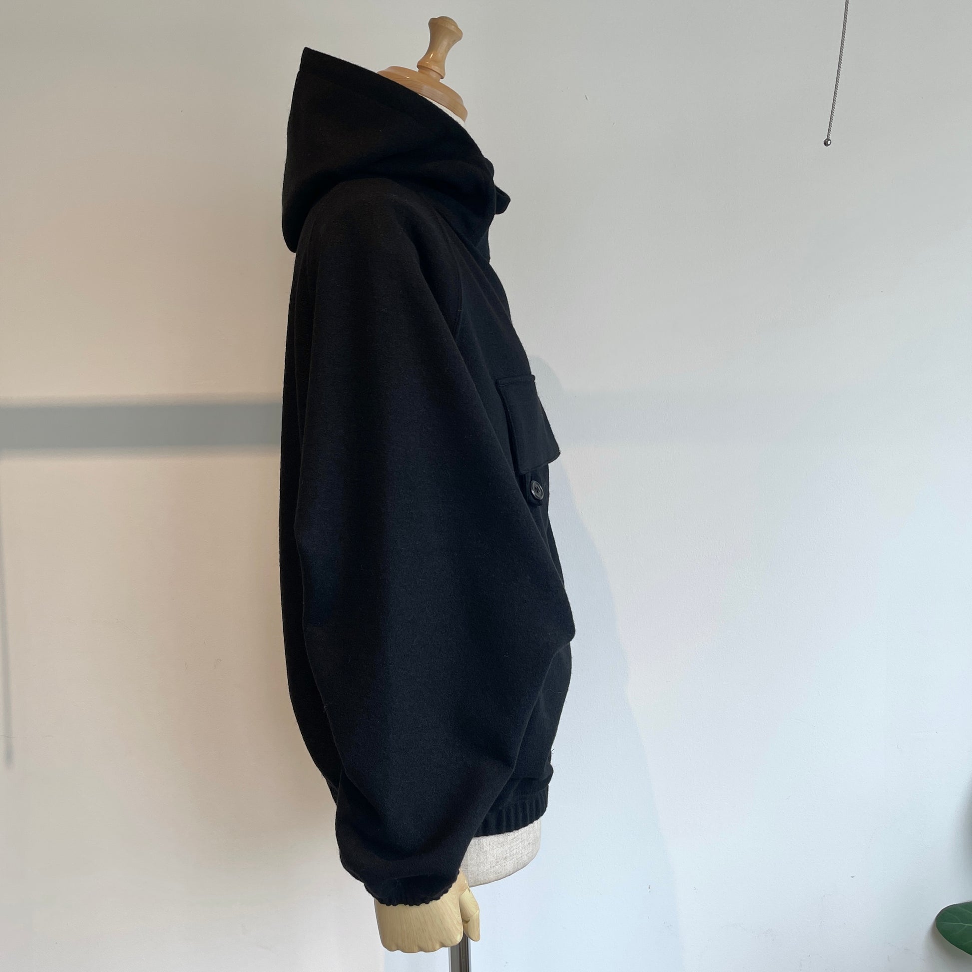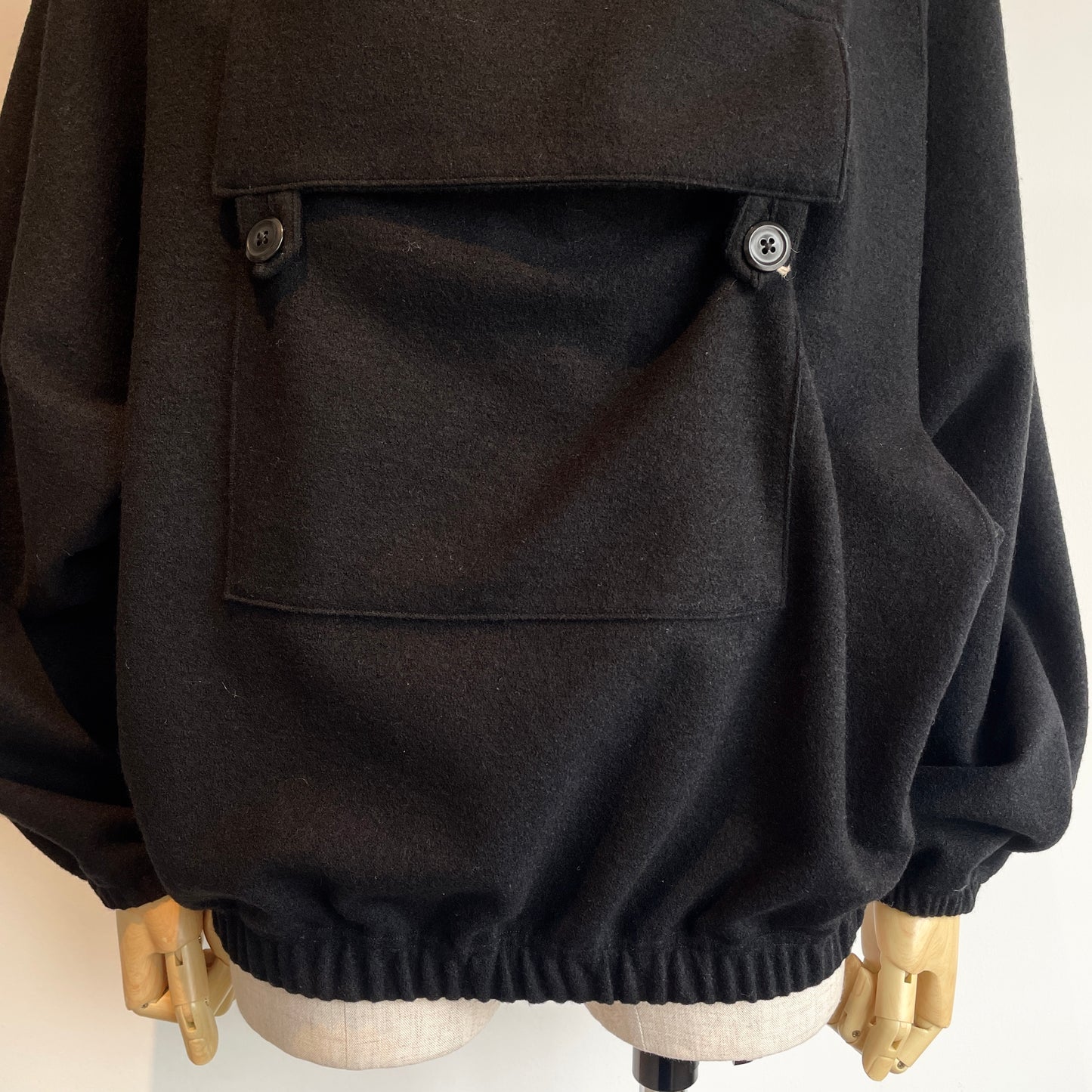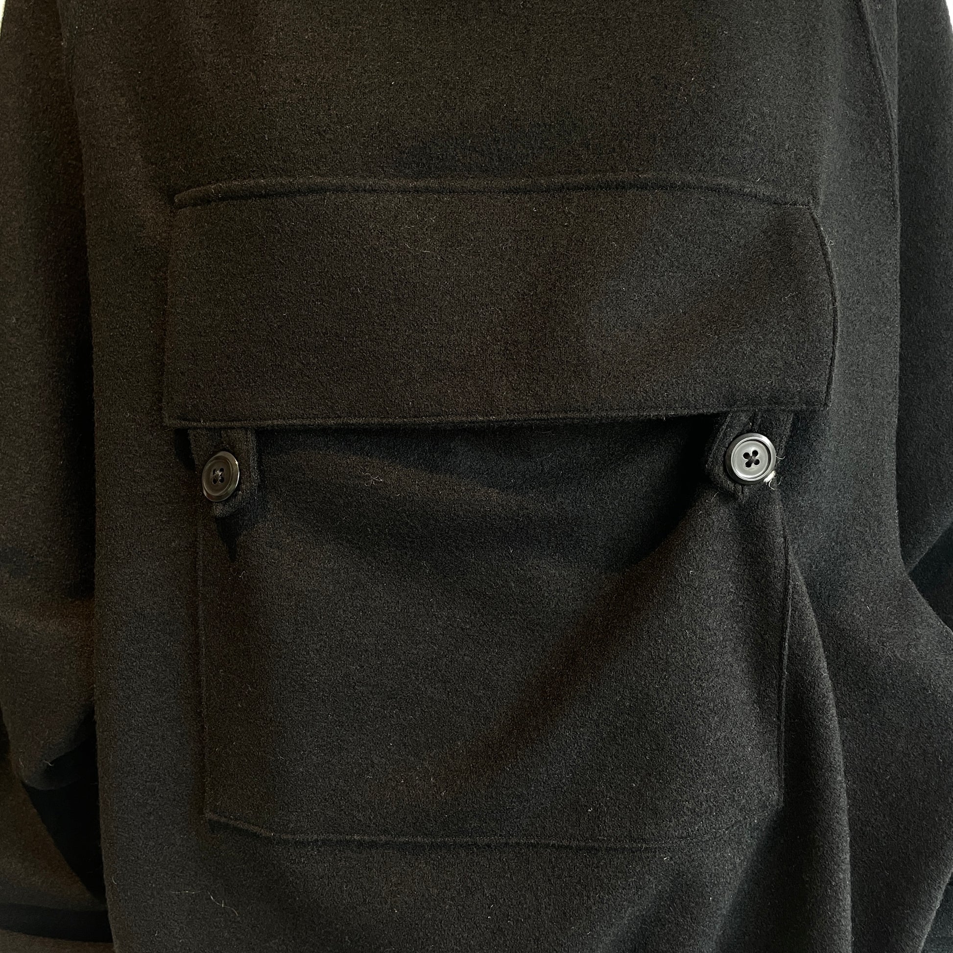 前身の大きなパッチ&フラップポケットと、ルーズフィットの身頃から袖下にかけての大きなマチのついたラグランスリーブが特徴です。