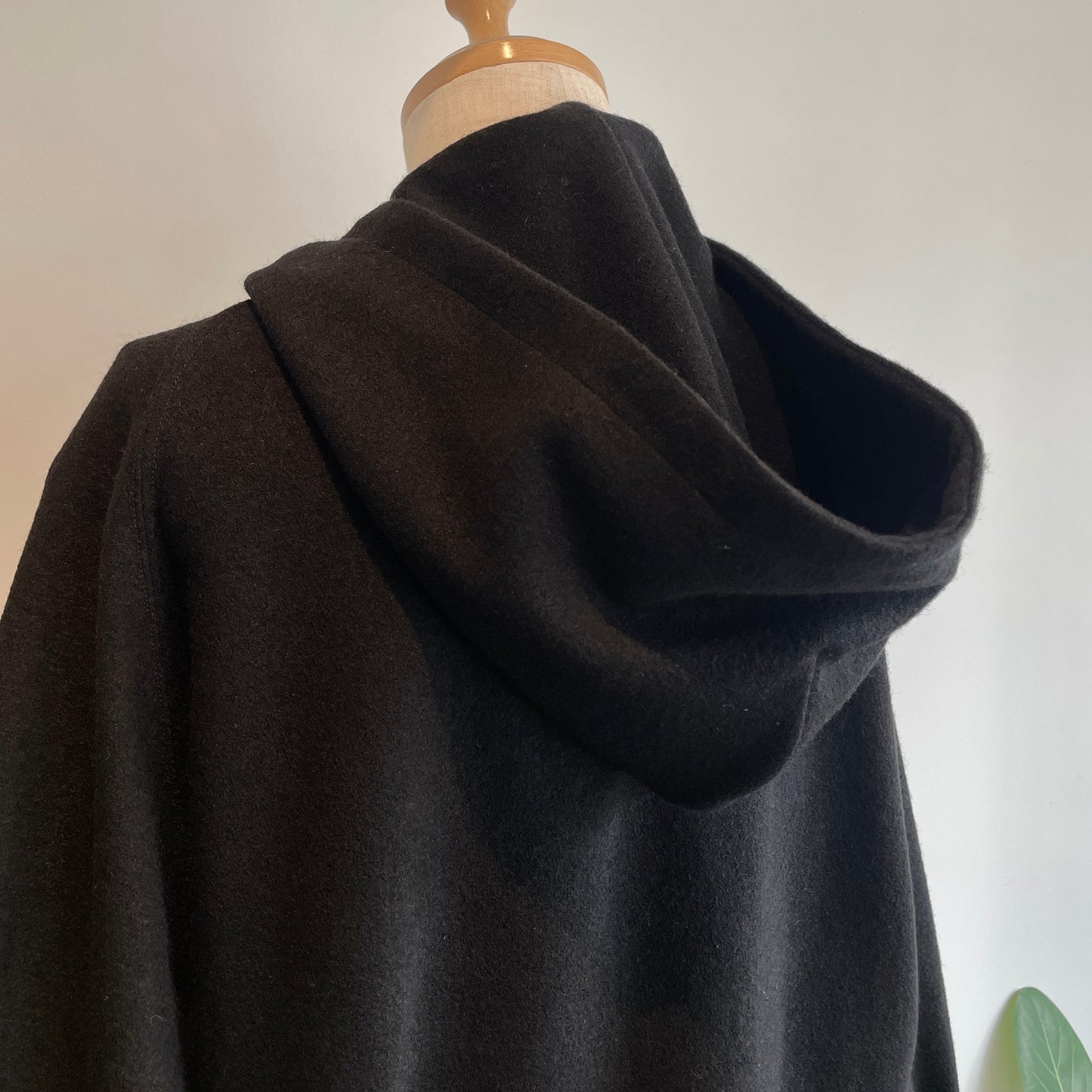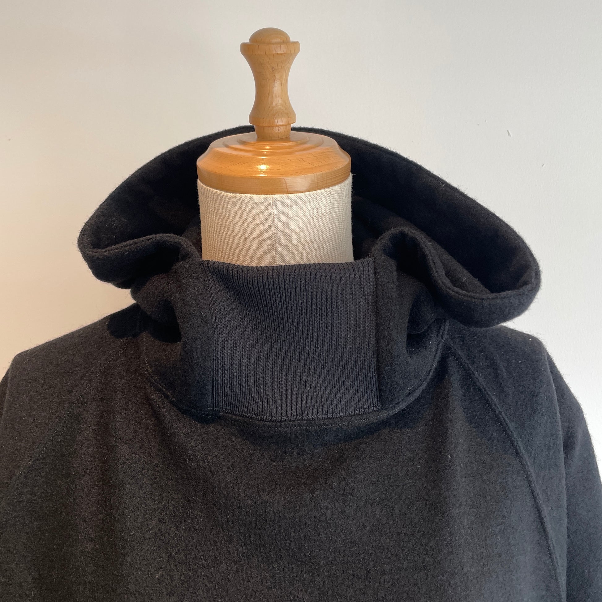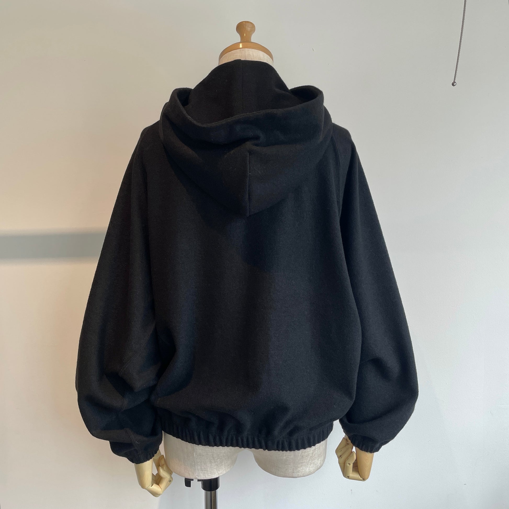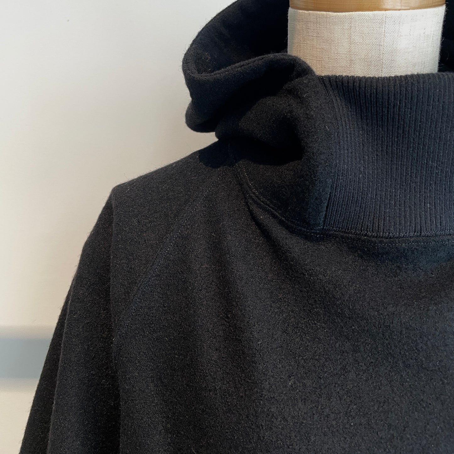 フードの中心をリブで切り替えたラグランフーデットパーカー。
