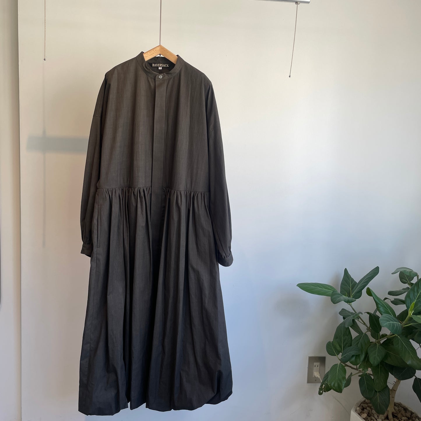 胸下からたっぷりとギャザーを入れバルーンシルエットに仕上げたバンドカラーロングワンピース。