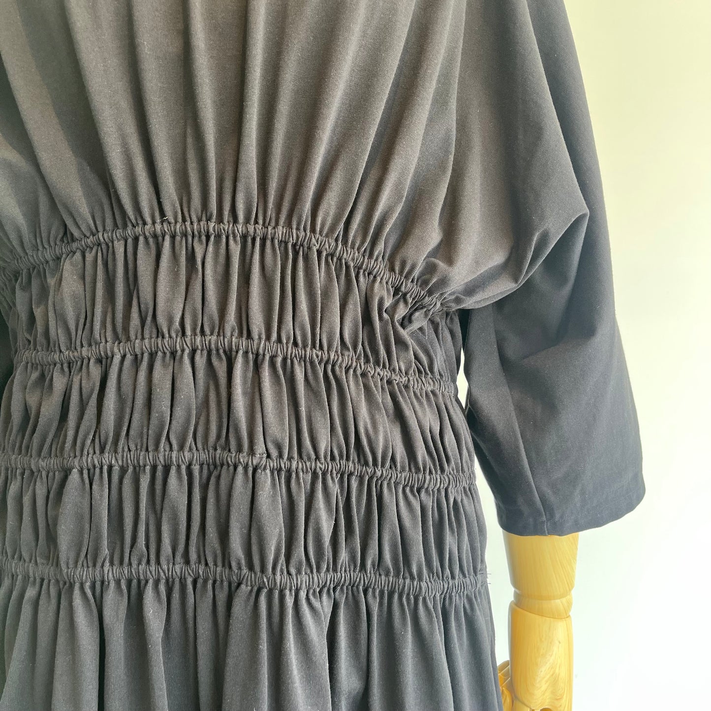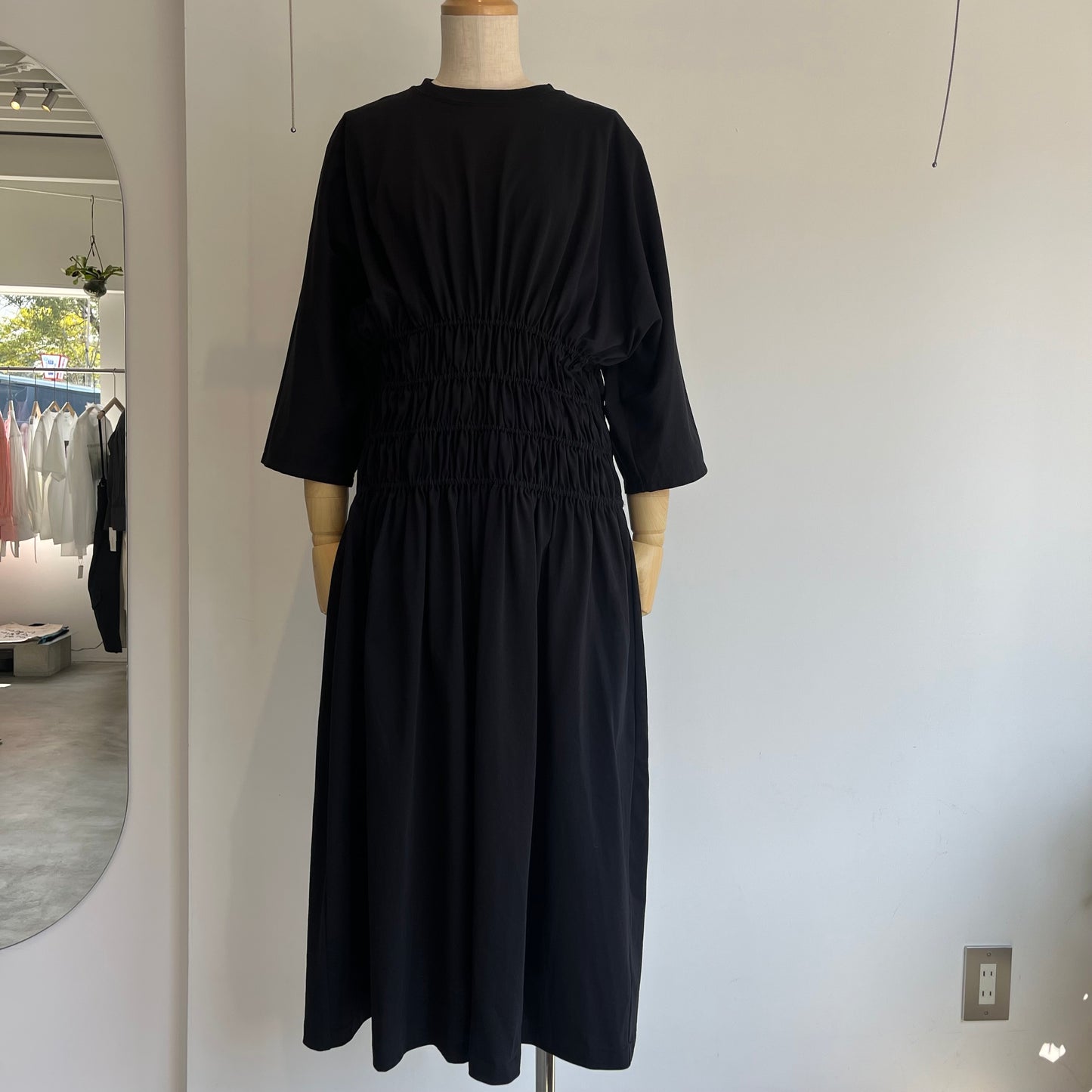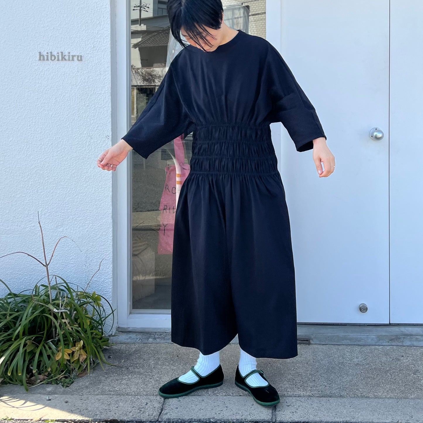太めのドルマンスリーブと胸下のゴムシャーリングが特徴の1枚で様になるクルーネックロングワンピースです