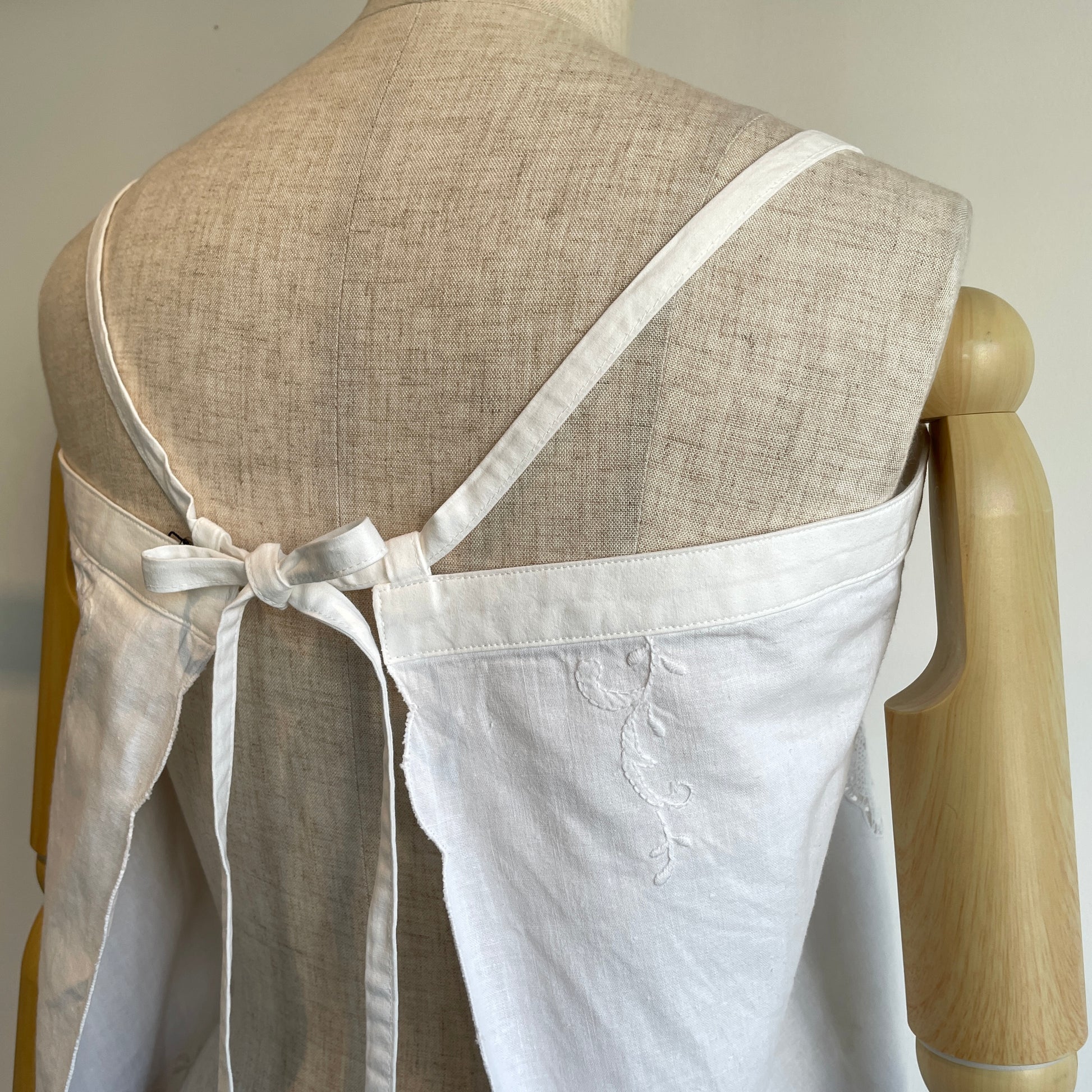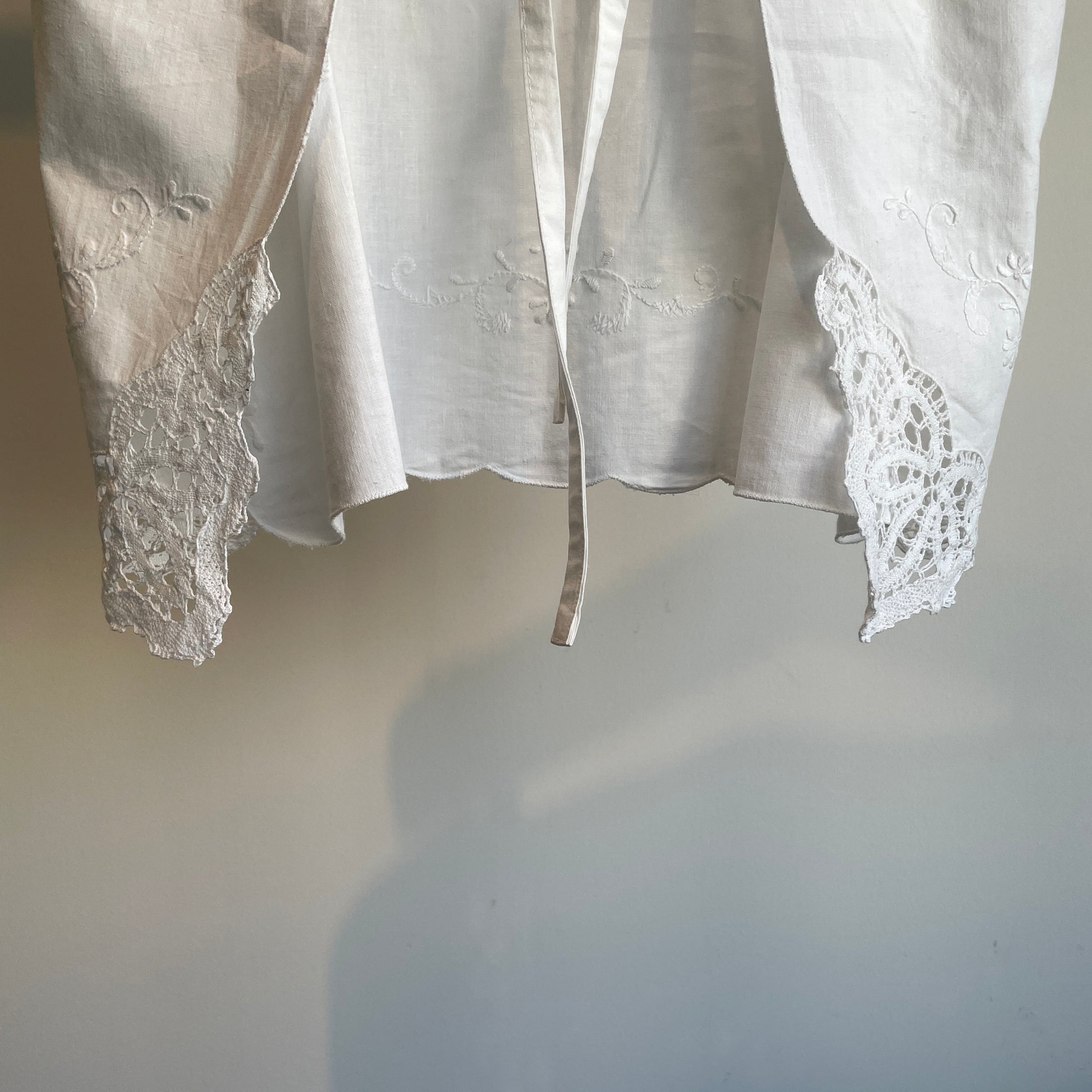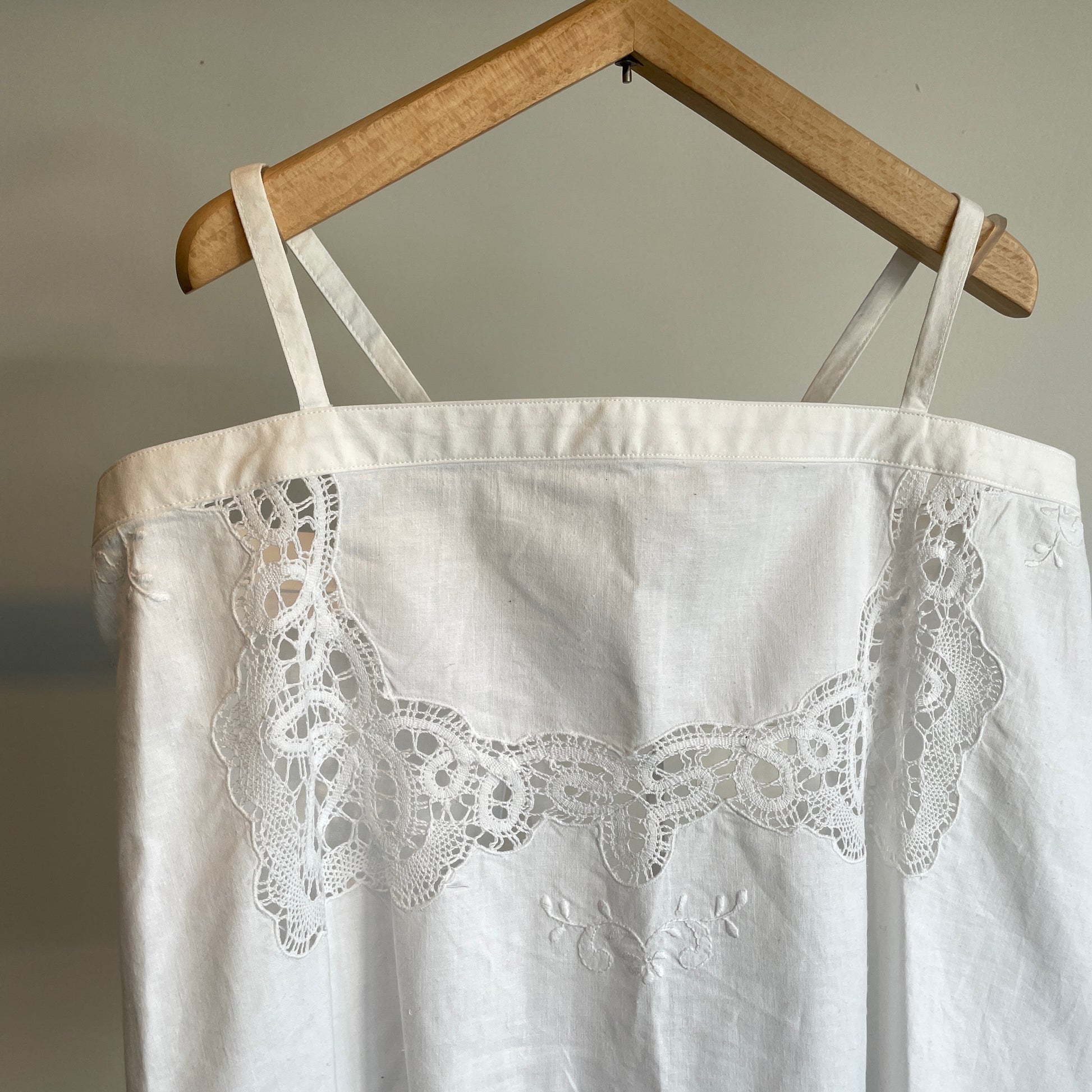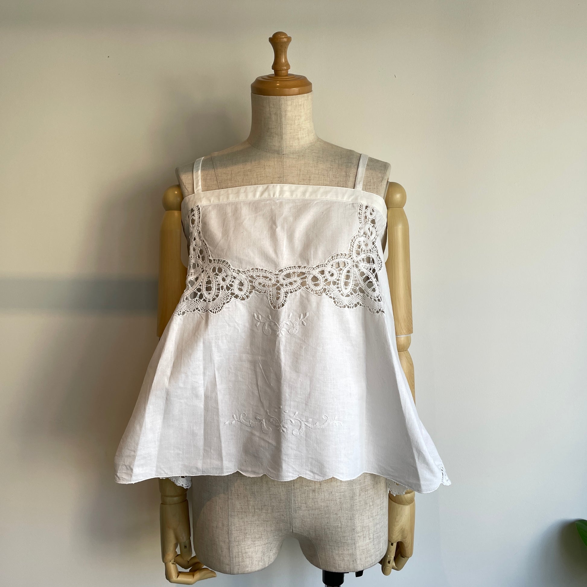 中国汕頭でヨーロッパに向けに作られていた、デッドストックのボビンレースとハンド刺繍のテーブルクロスをリメイクしたキャミソールです。