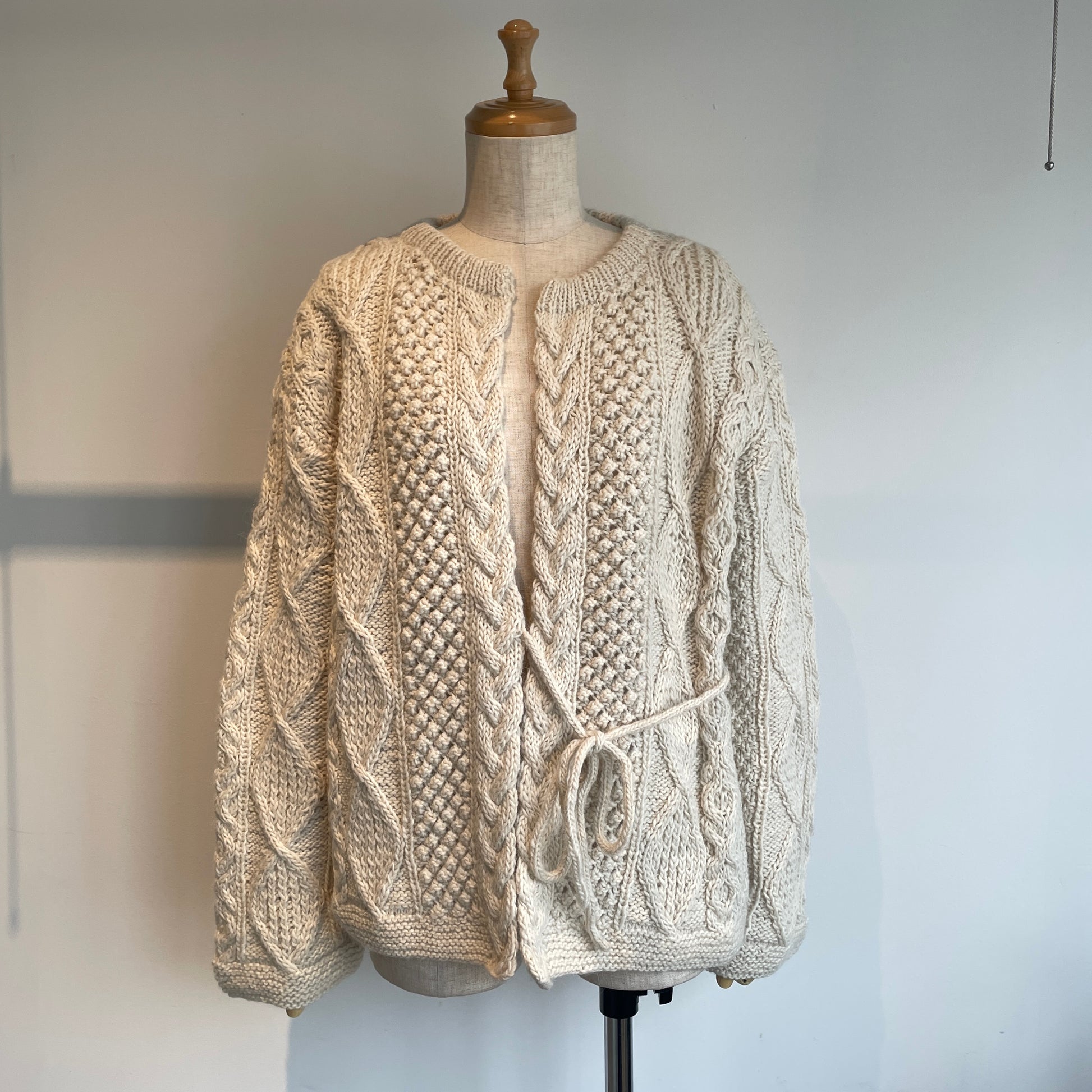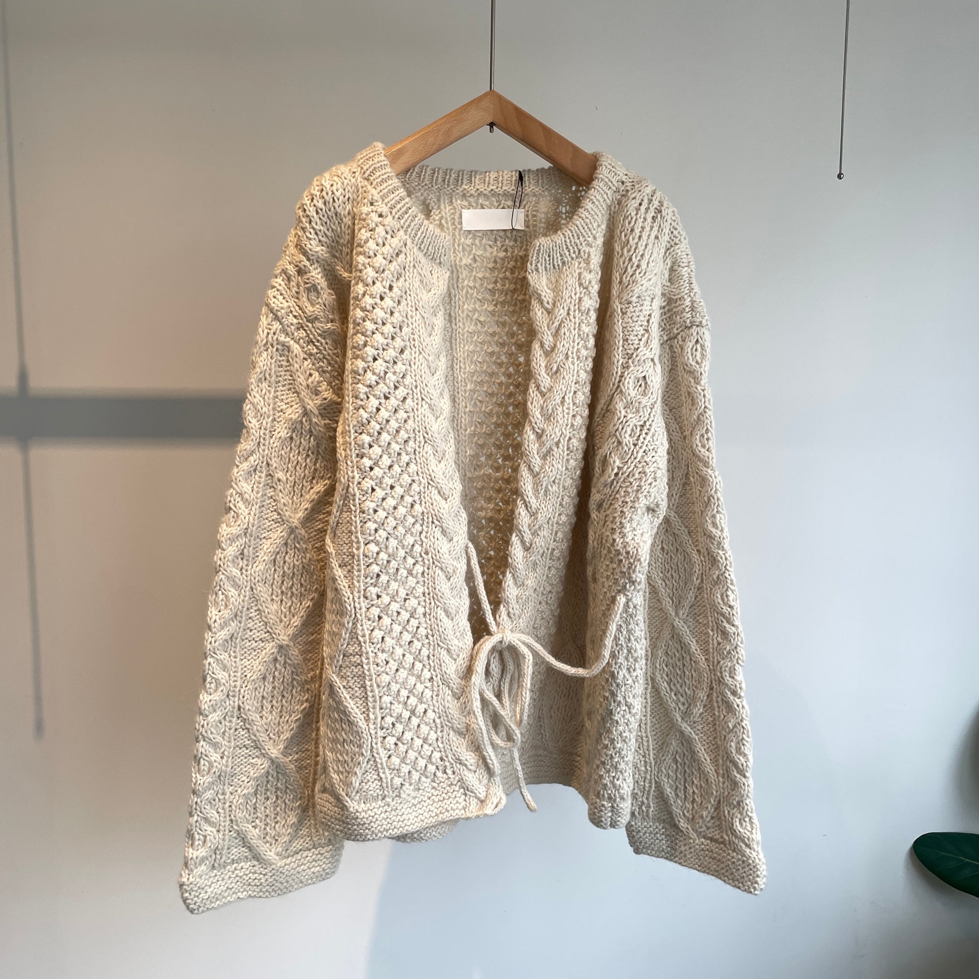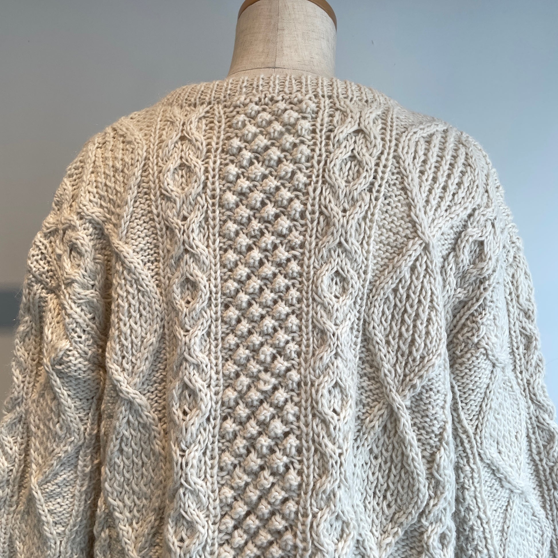 柔らかな肌触りの手紡ぎのアルパカ混糸を使用し、オリジナルのアラン柄で編み上げています。
