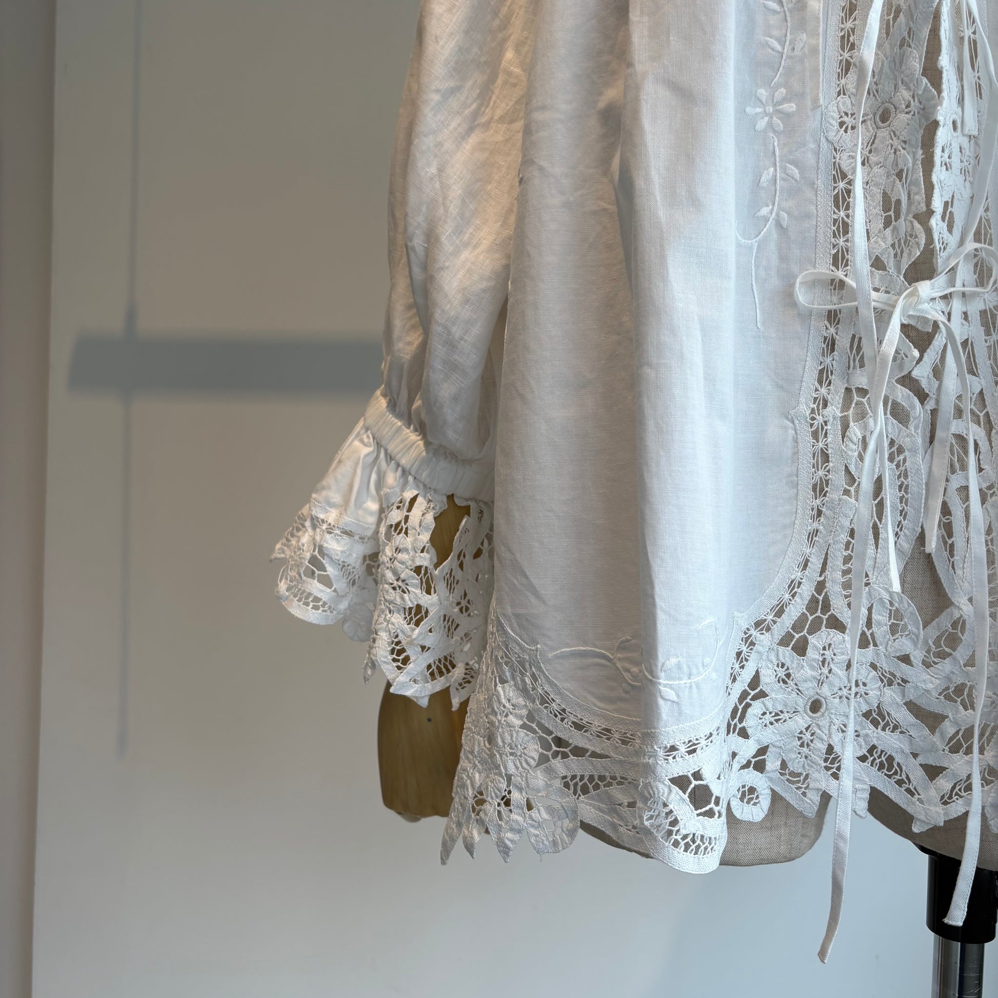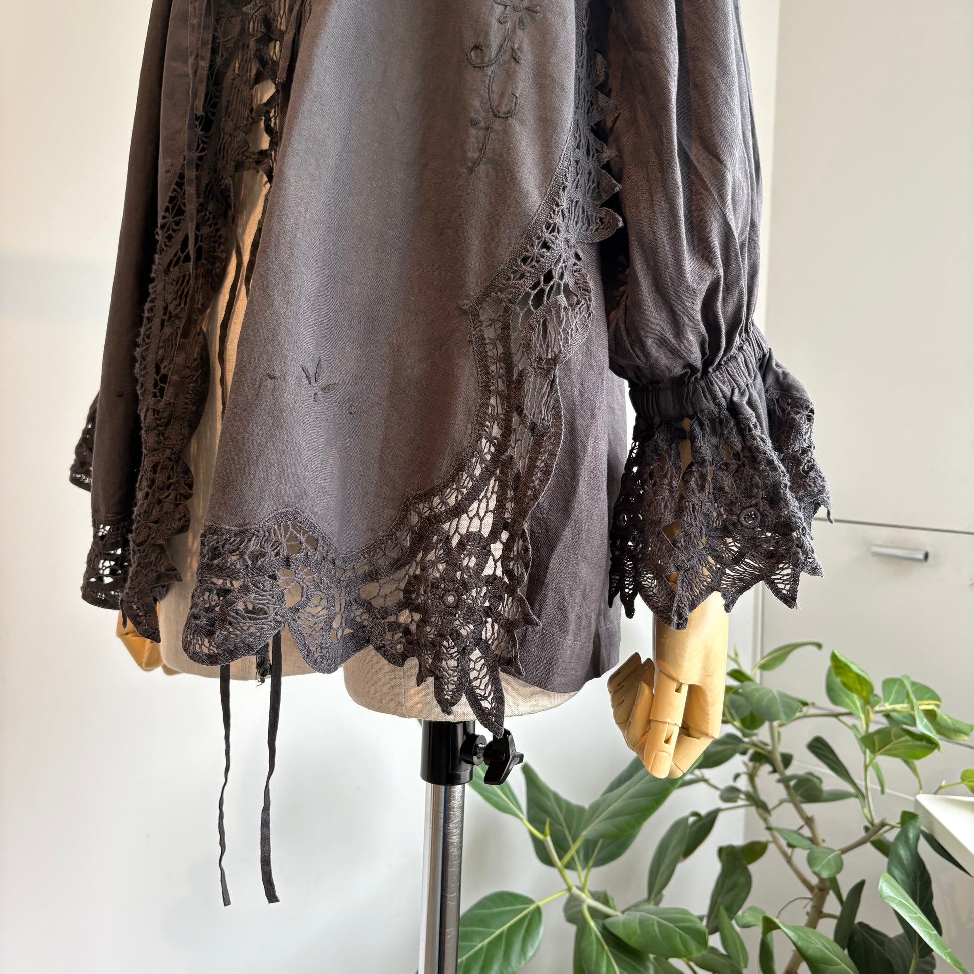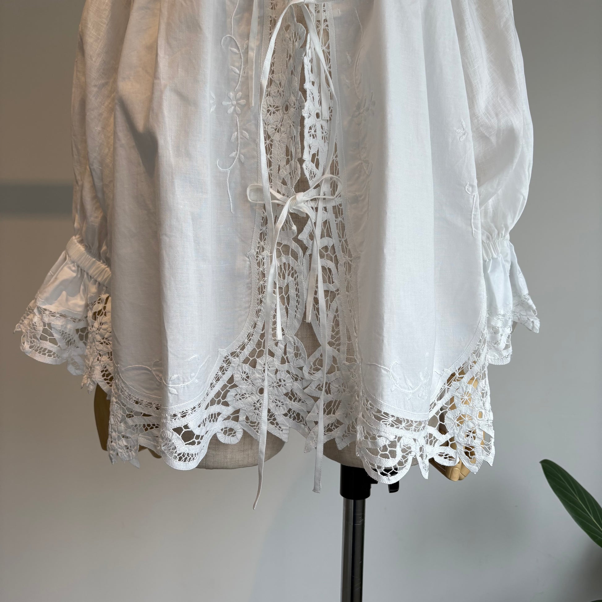 中国汕頭のデットストックのバテンレースパーツをリメイクした前あきのブラウス。