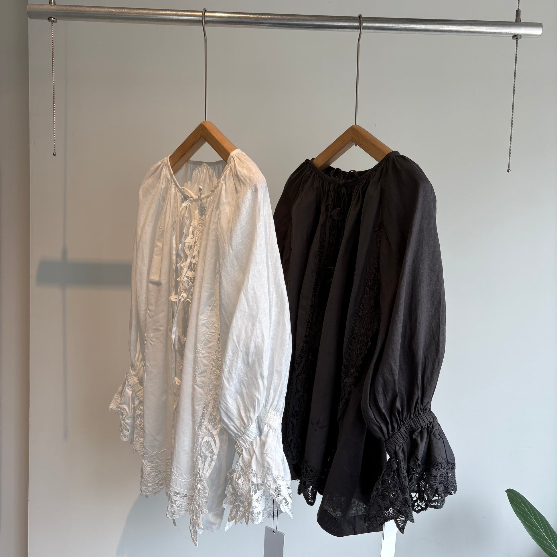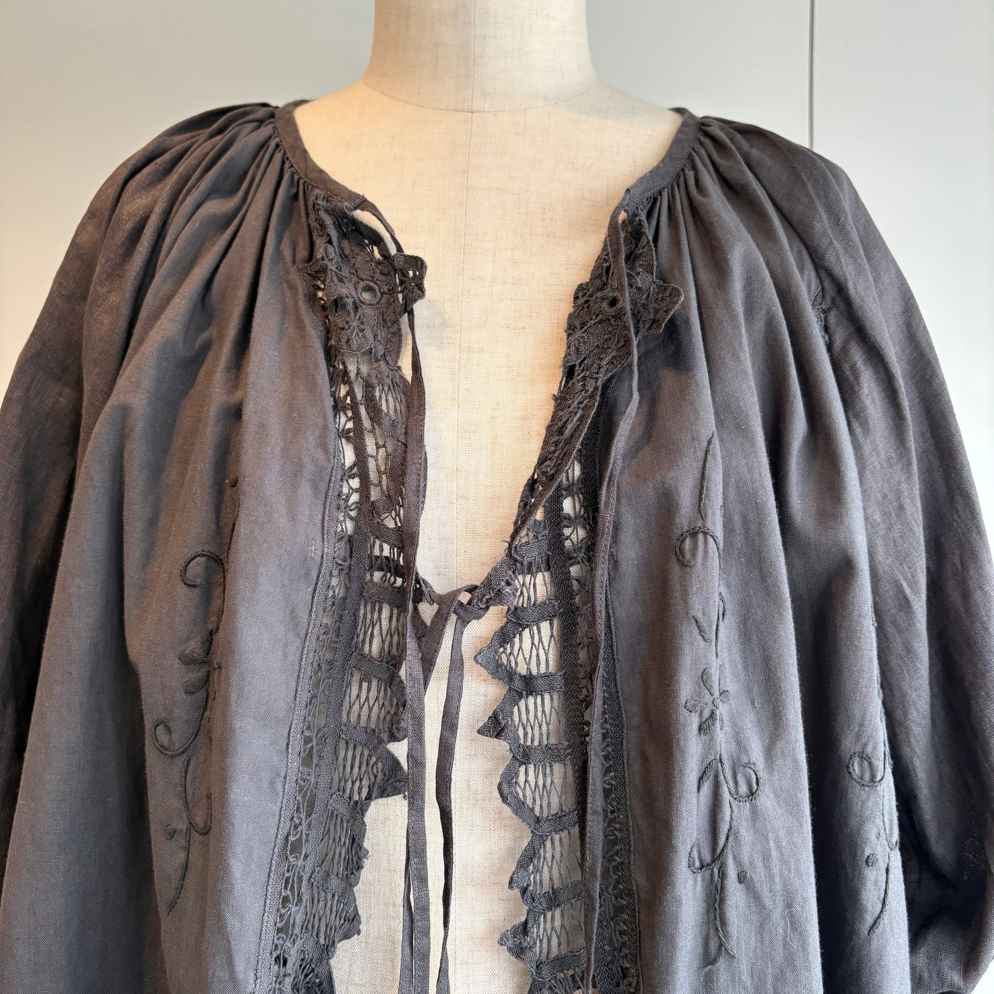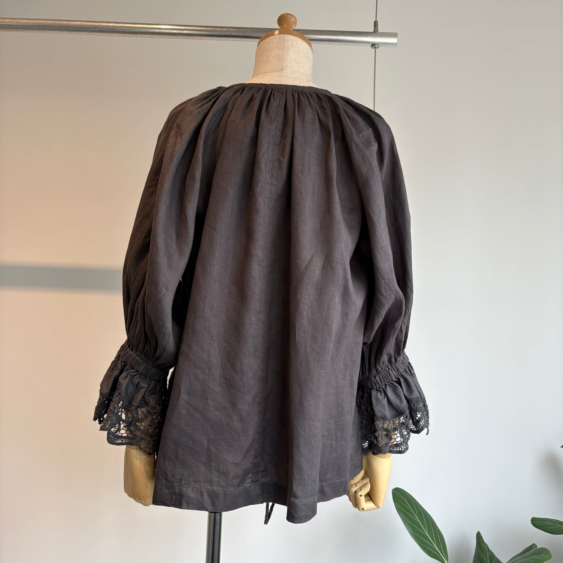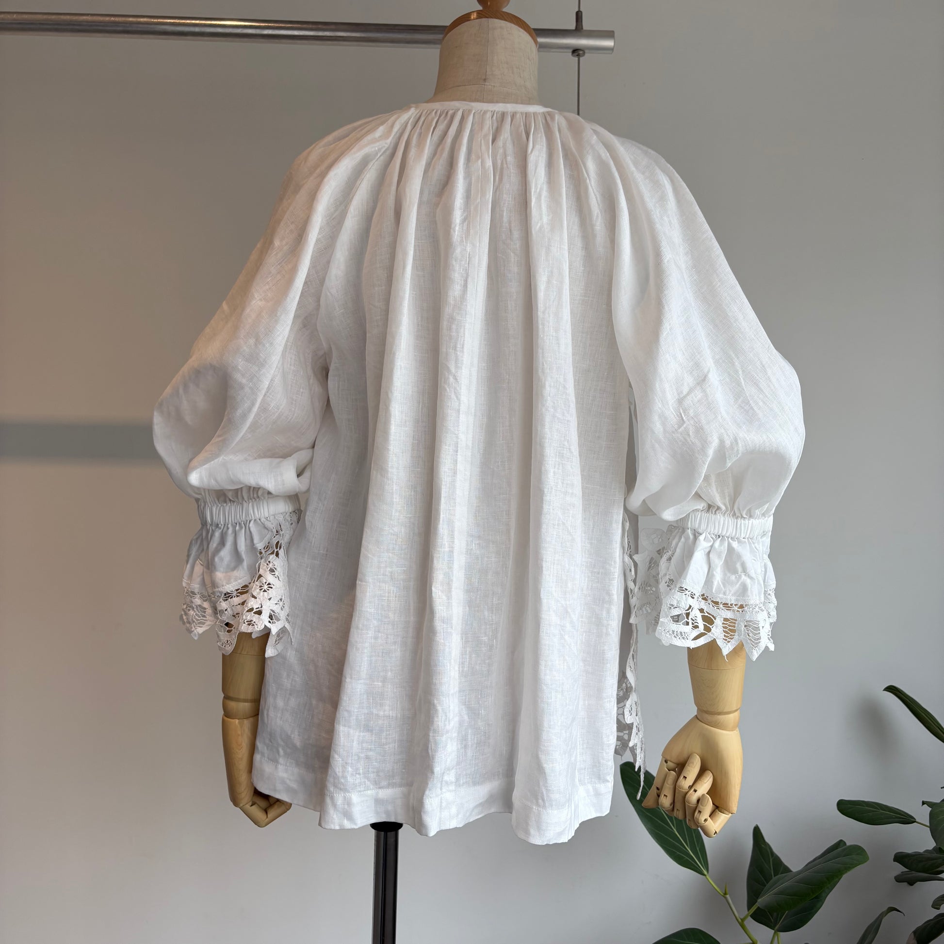 中国汕頭のデットストックのバテンレースパーツをリメイクした前あきのブラウス。