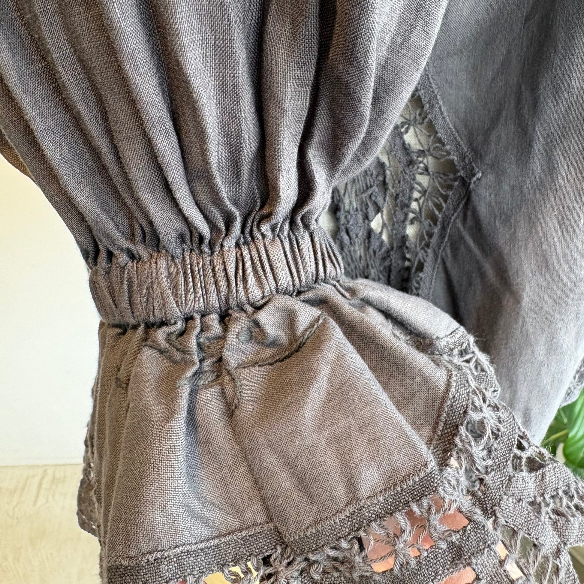 この製品は、中国汕頭(スワトウ)地方のデットストックのバテンレースパーツをリメイクして使用しております。バテンレースパーツのかがりは、全て手仕事で作られています。ほつれ・傷や小さな穴・汚れ・色ムラがある場合がございます。デットストックならではの風合いをお楽しみください。