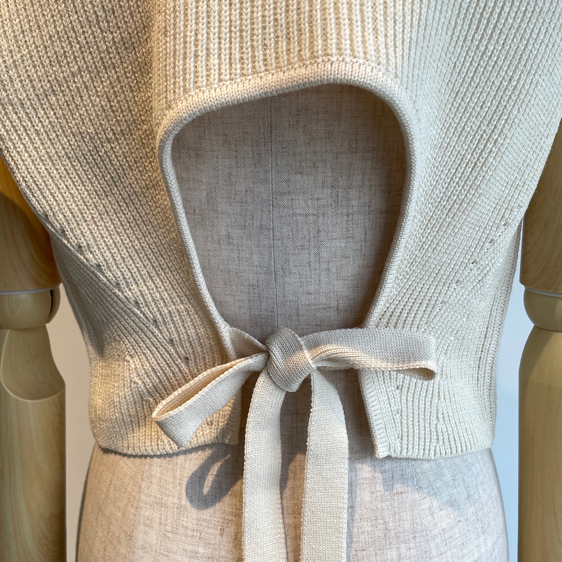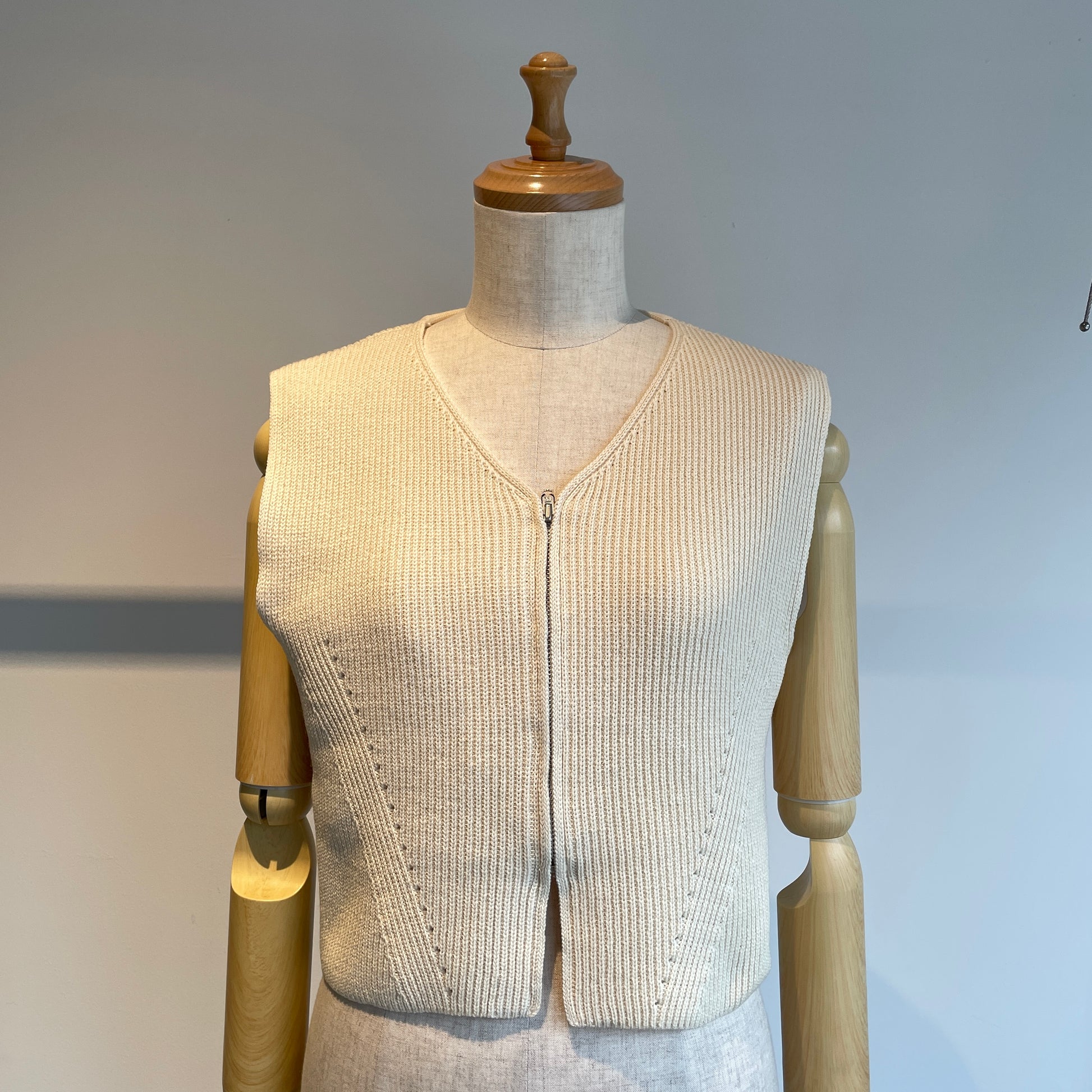 シンプルなデザイン、片畦編みで表情をプラスしたショート丈ベスト。