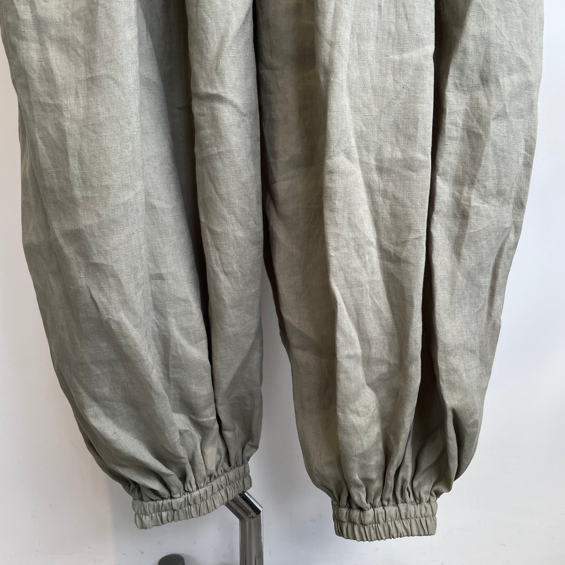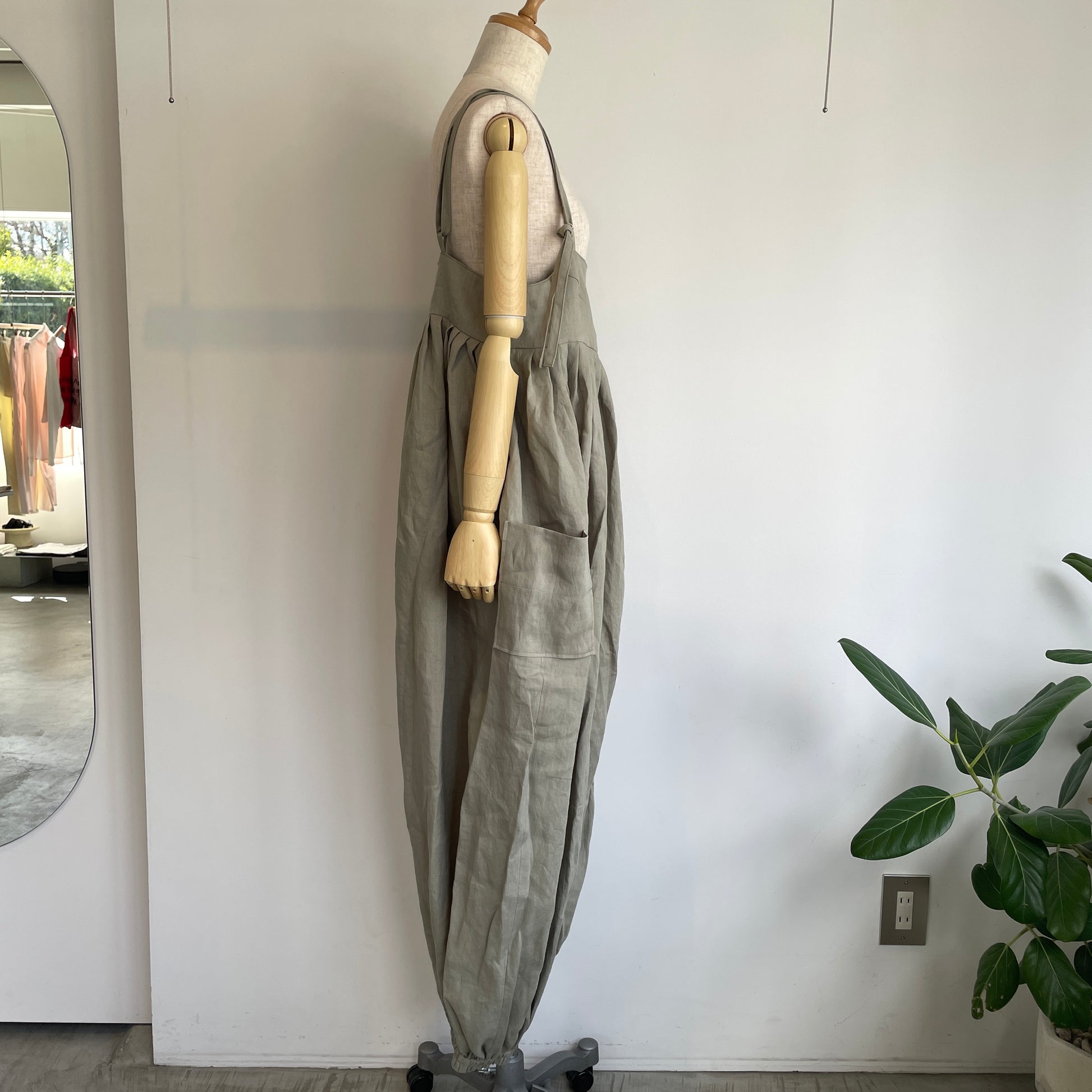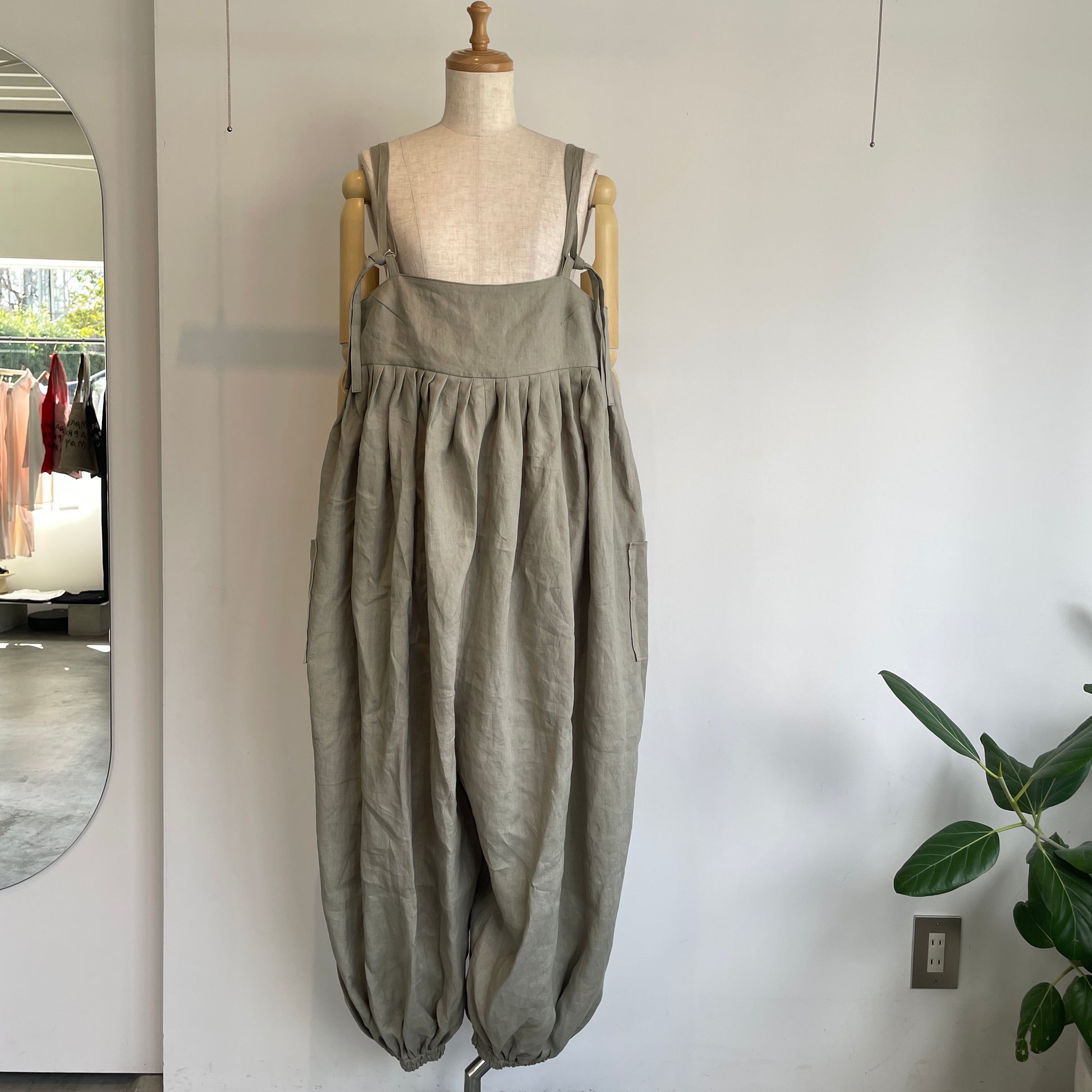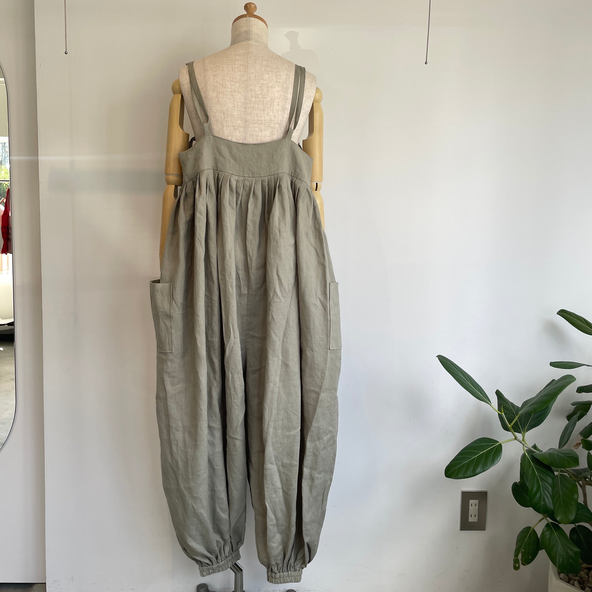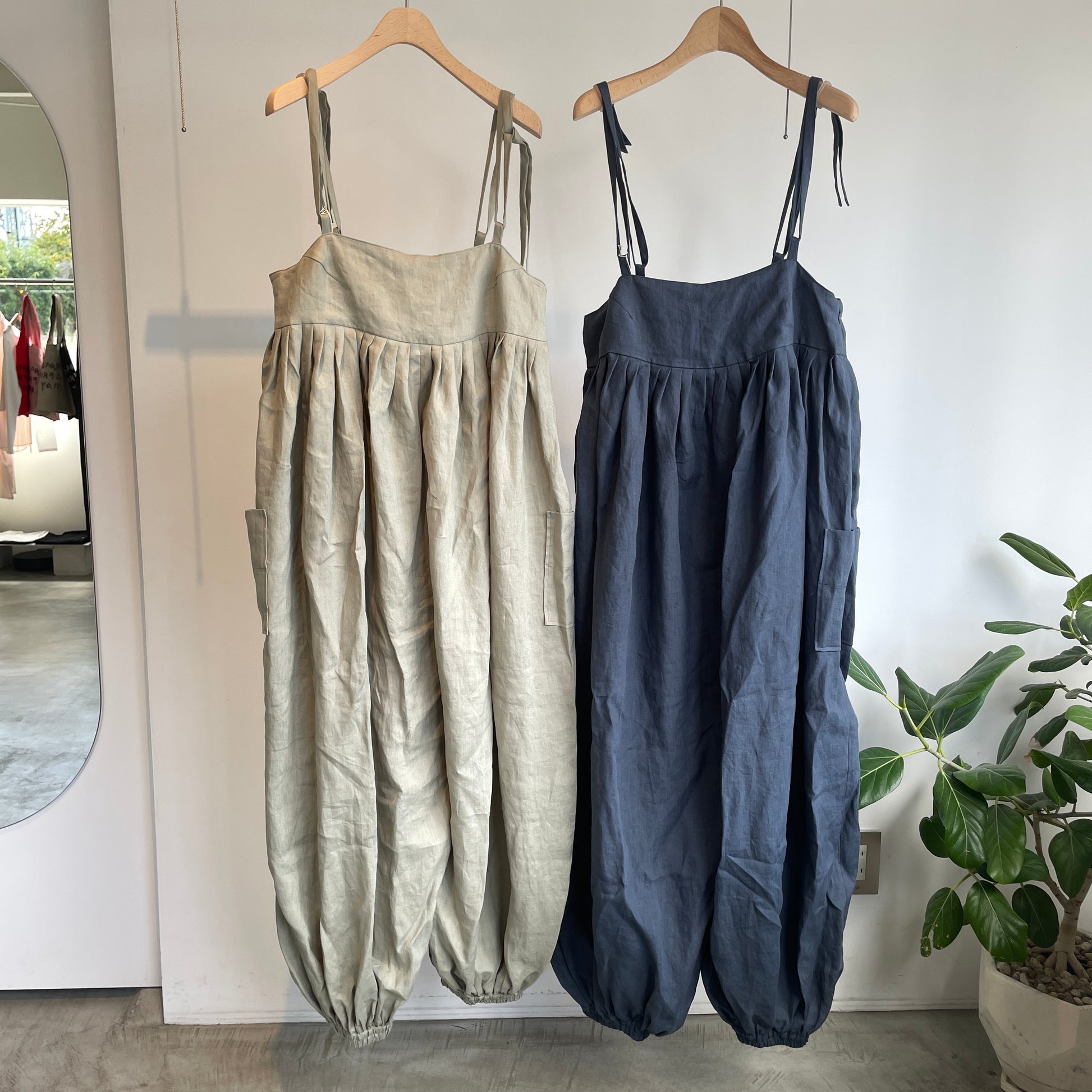 ワイドシルエットのパンツ裾にゴムを入れたサロペット。