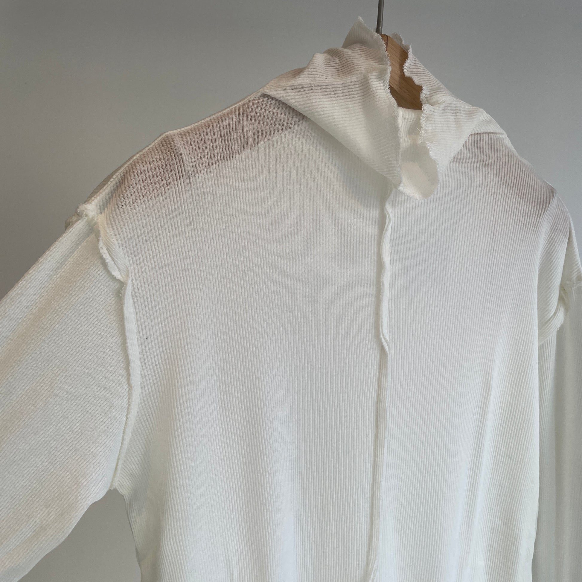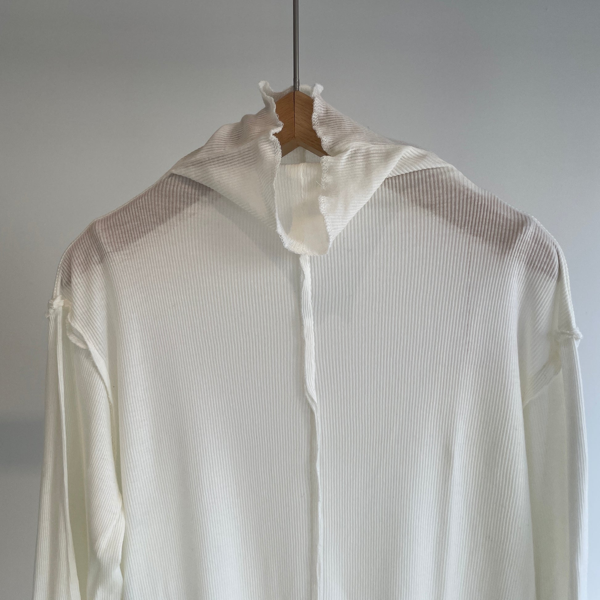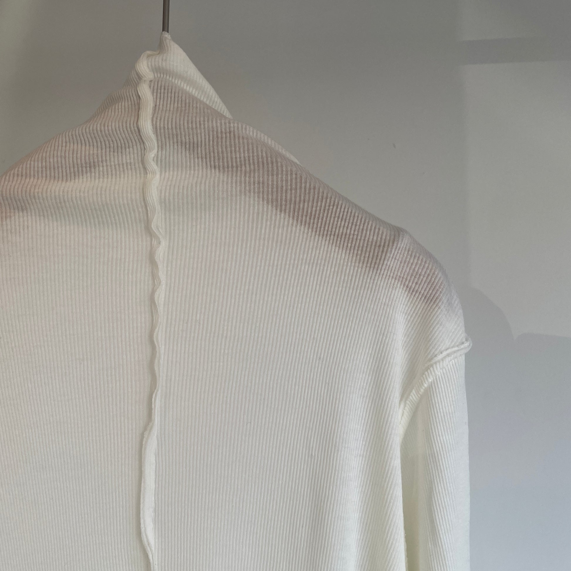 霧のようにやわらかく、 肌と心に、そっと寄り添うハイネック。 ふわっと軽く、心地よい肌触りの繊細なリブ素材。 デリケートな透け感とパウダリーなタッチで、肌に優しくフィット。 一枚でもレイヤードでも美しく、着心地ばつぐんの万能トップス。