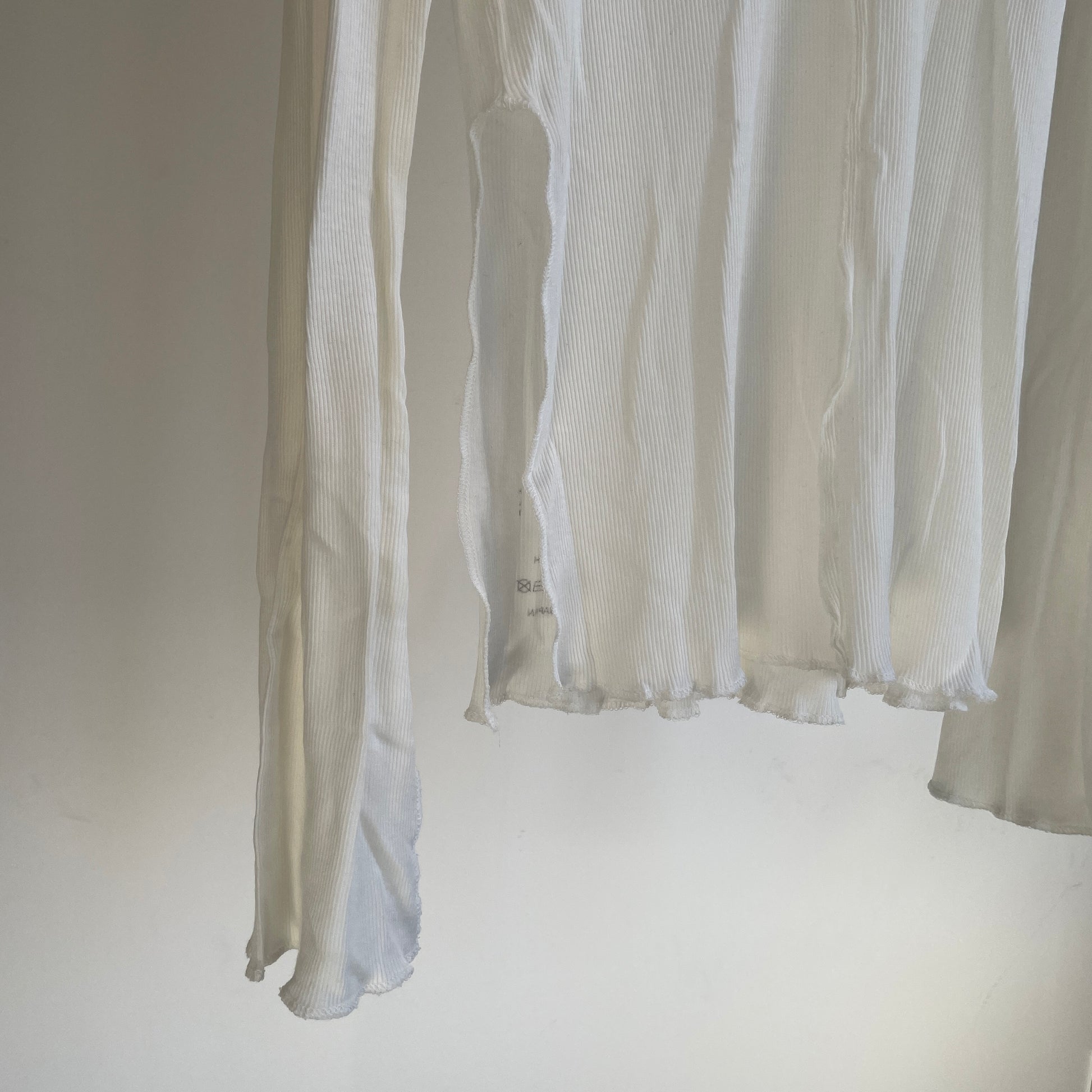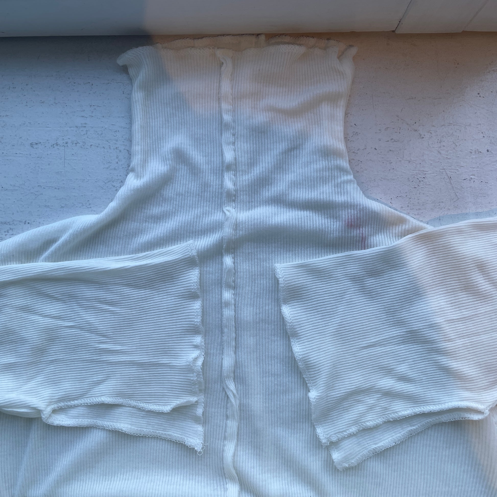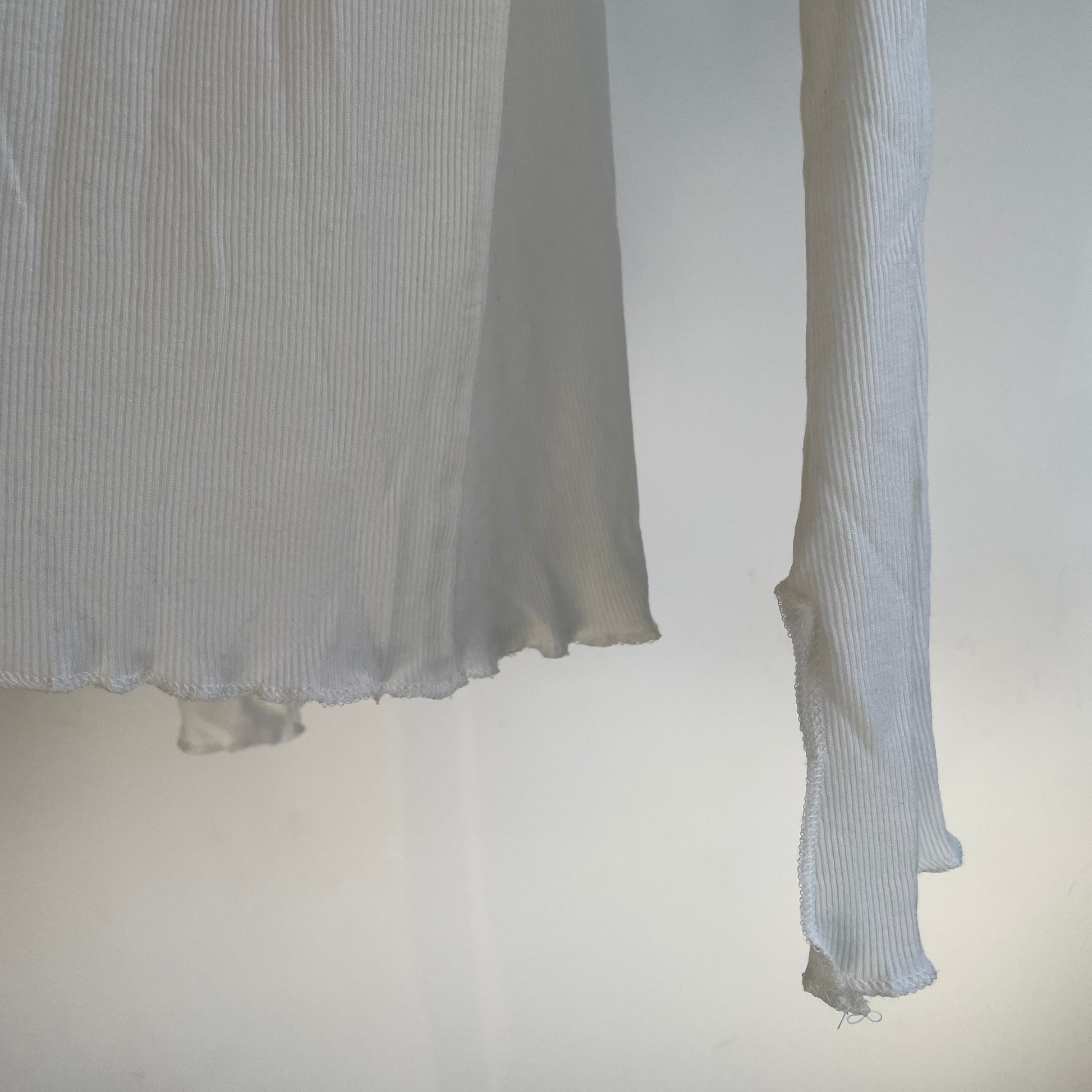 霧のようにやわらかく、 肌と心に、そっと寄り添うハイネック。 ふわっと軽く、心地よい肌触りの繊細なリブ素材。 デリケートな透け感とパウダリーなタッチで、肌に優しくフィット。 一枚でもレイヤードでも美しく、着心地ばつぐんの万能トップス。