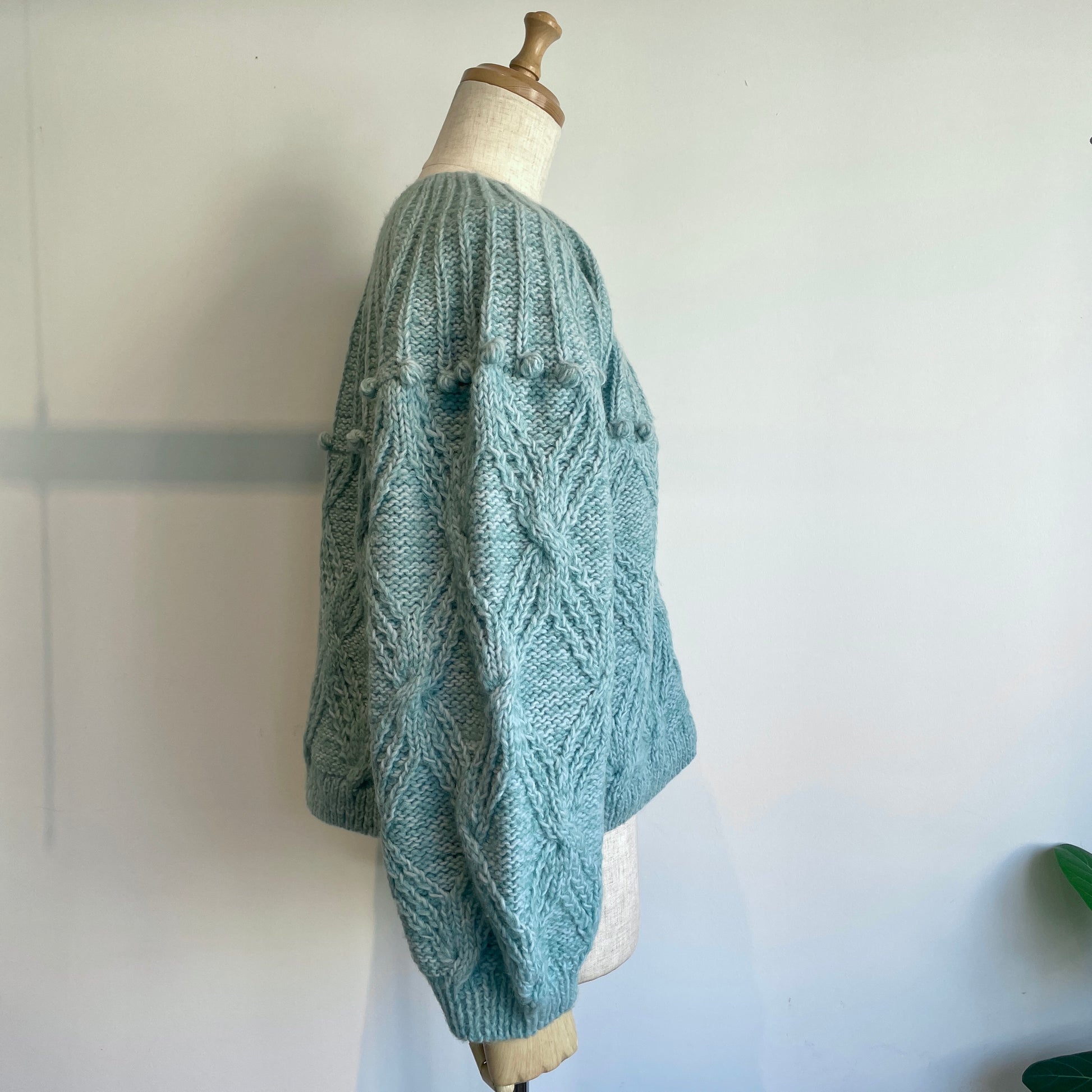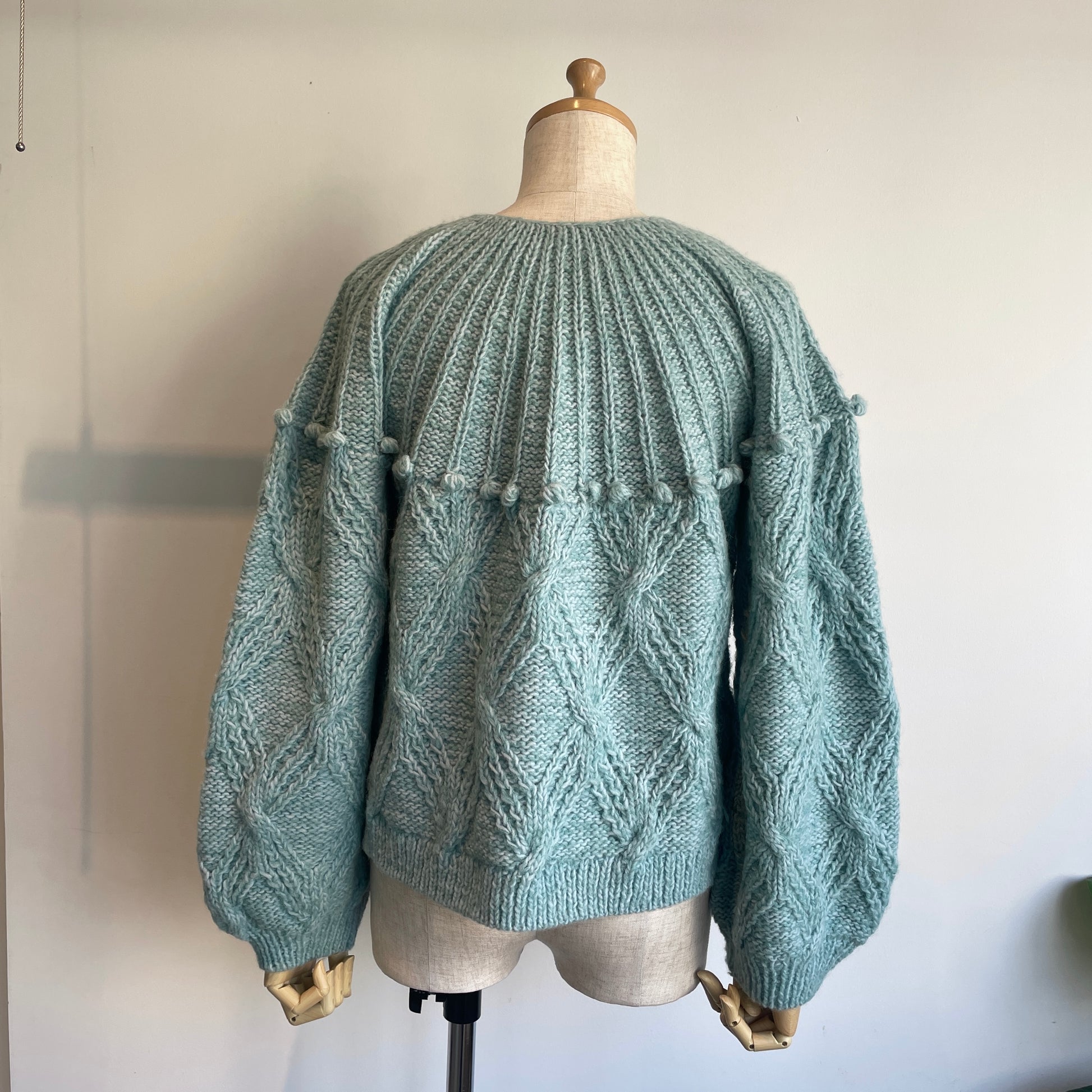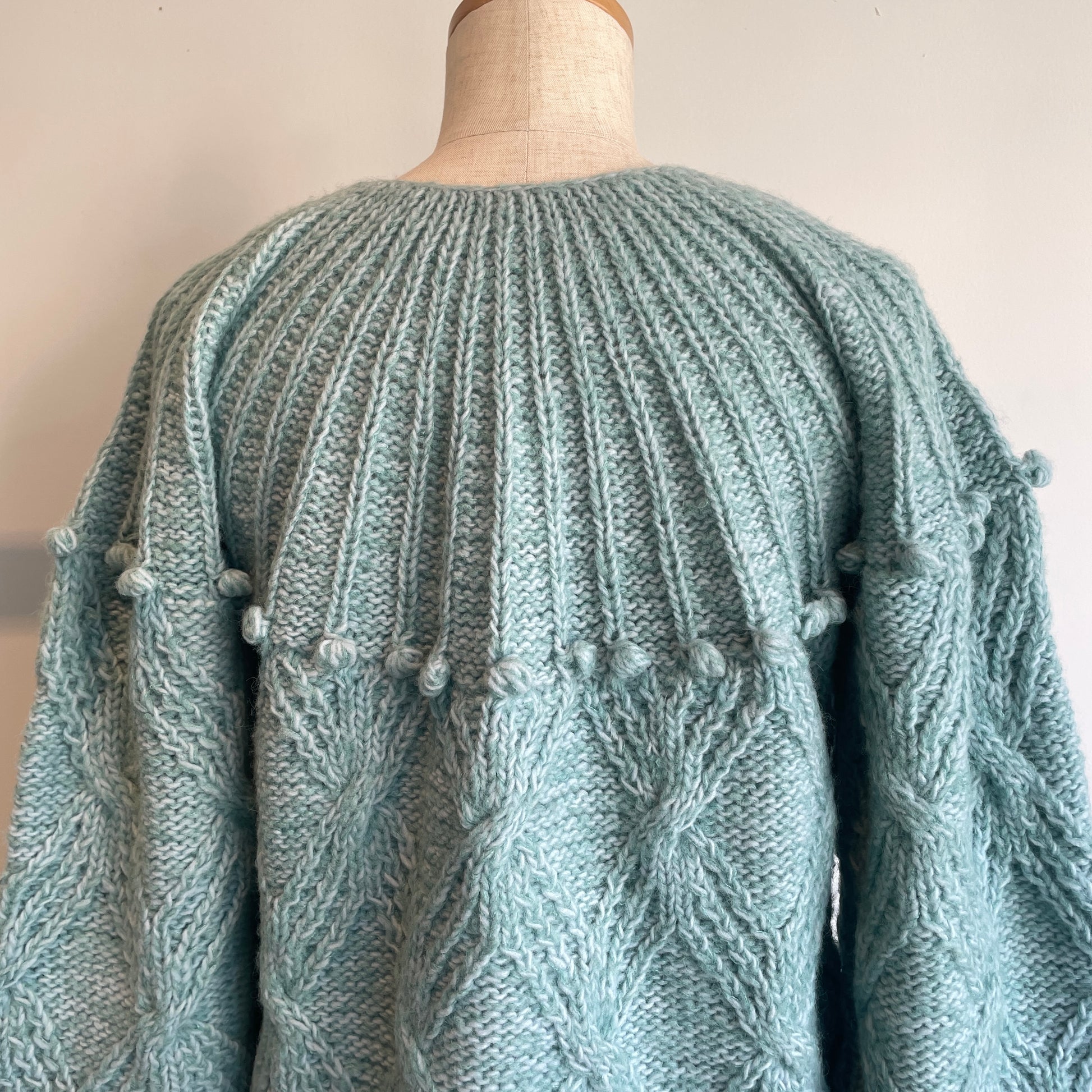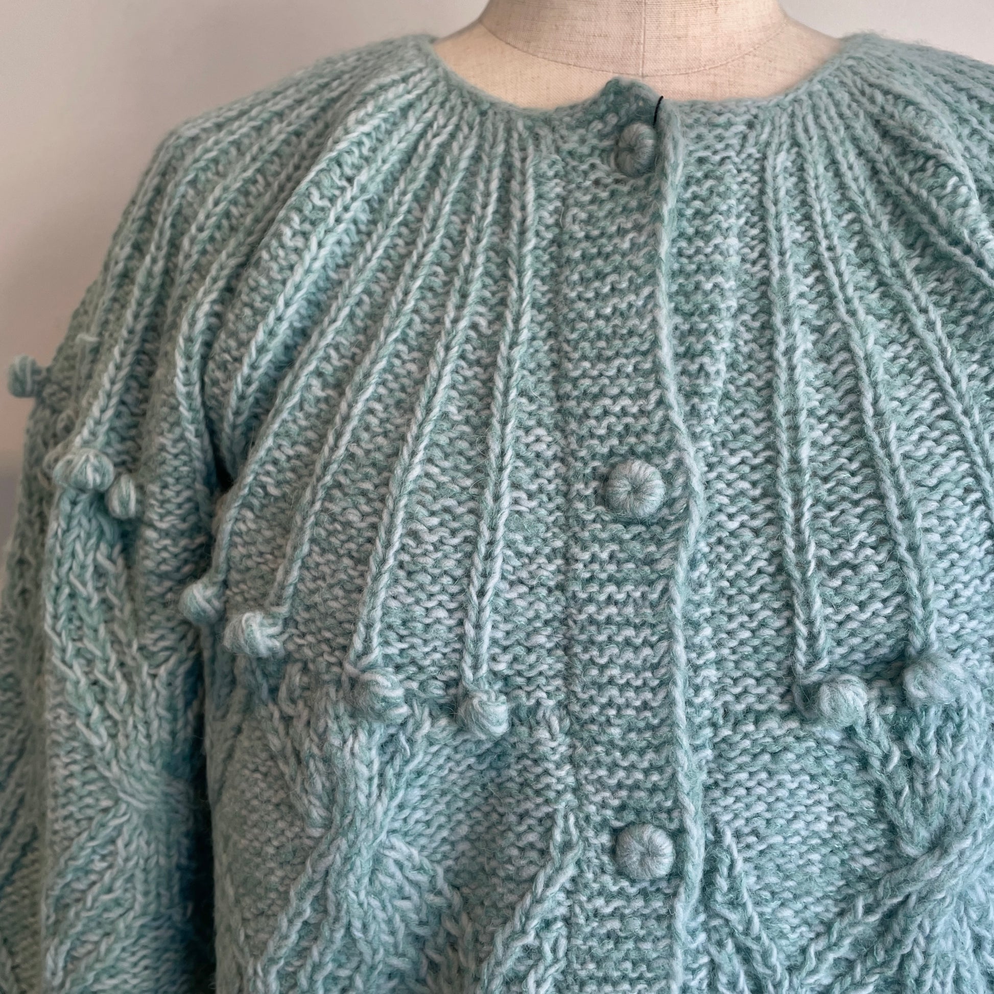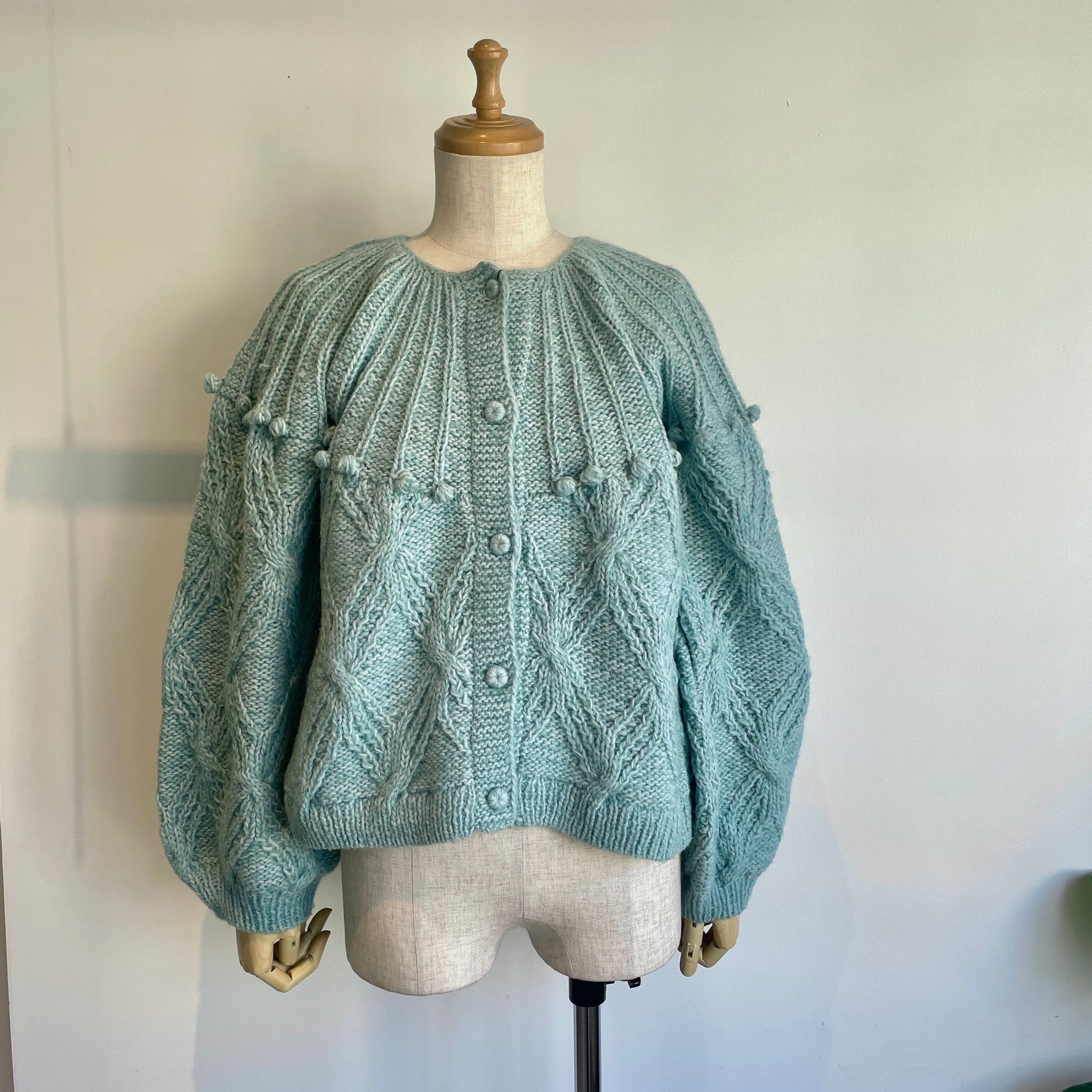 手編みならではのぬくもりと、毛糸の太さに現れる味わい、そして編み目の表情豊かな温かみが魅力です。
