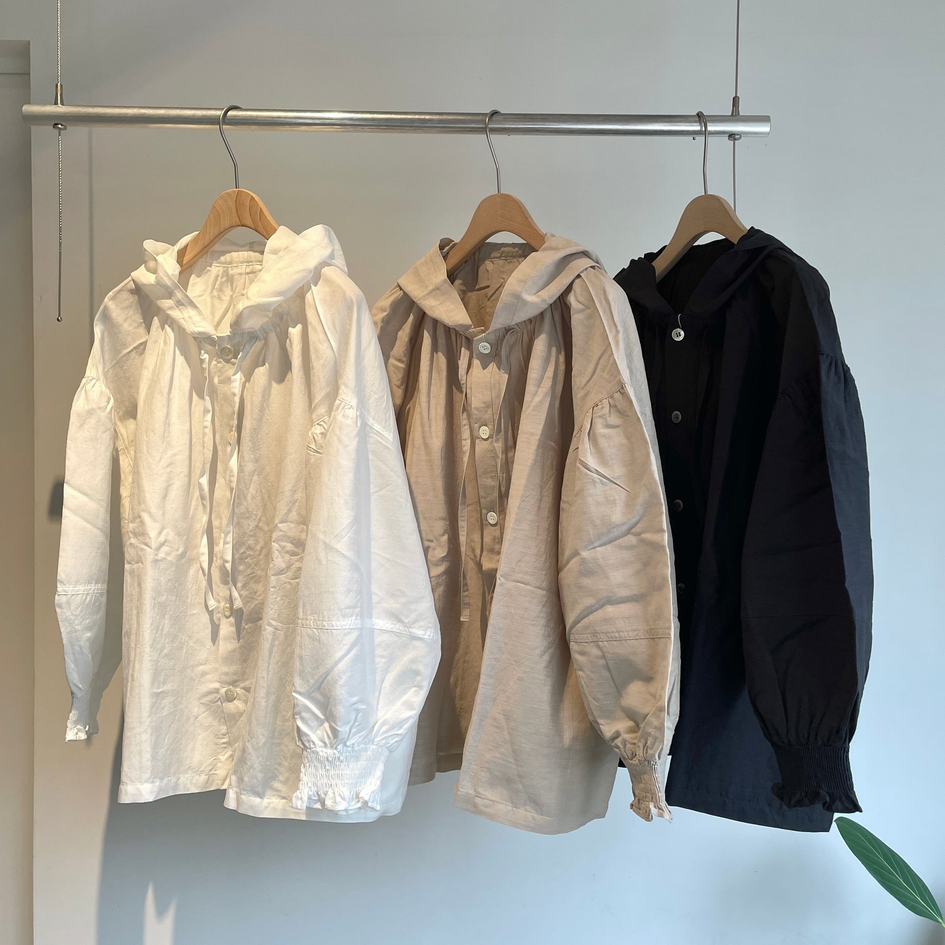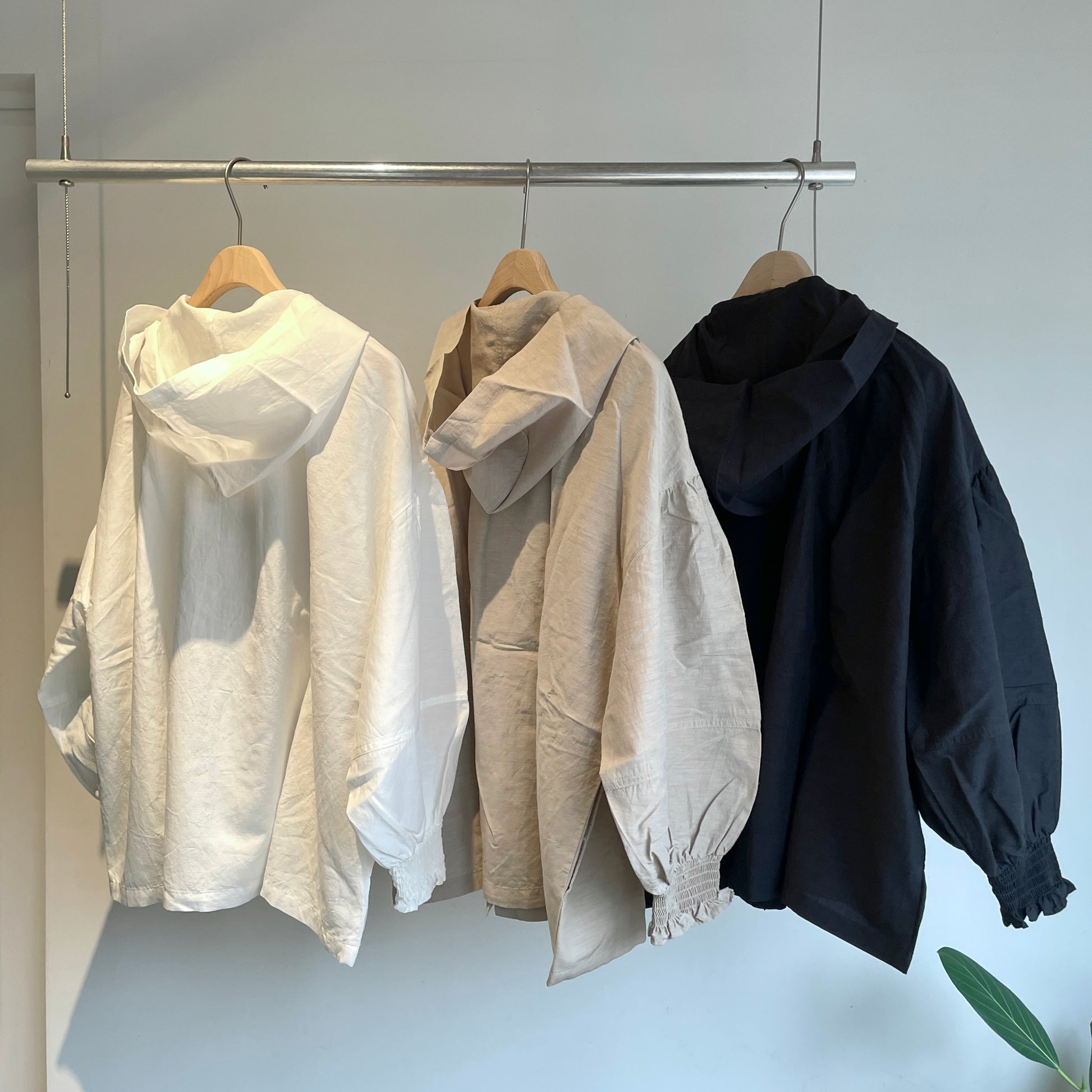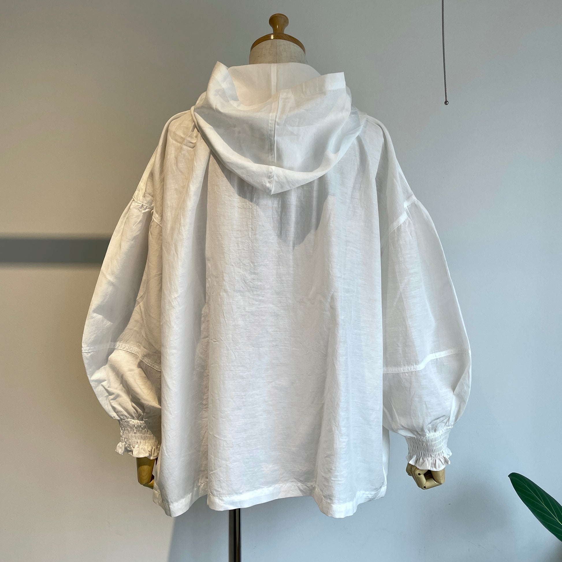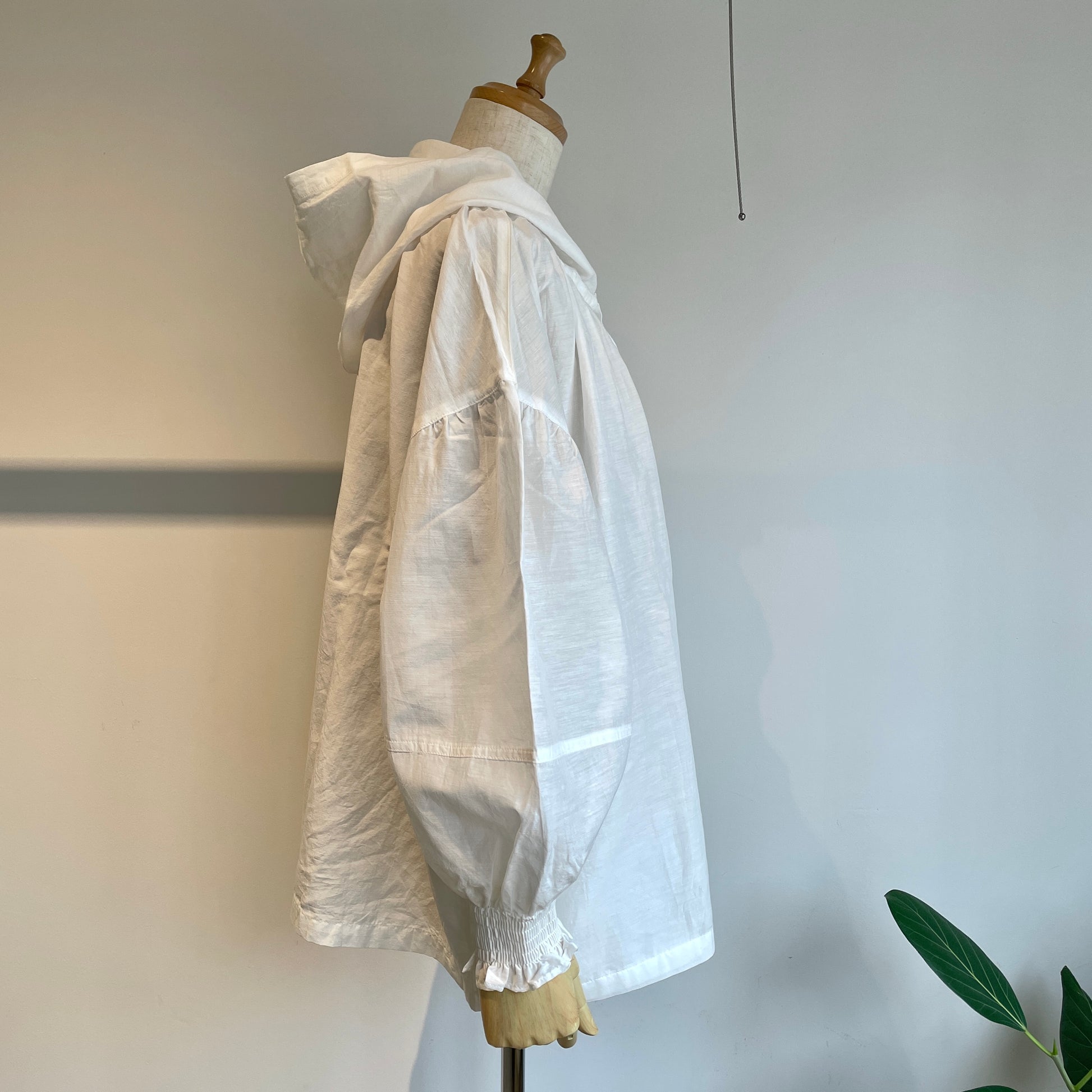 両脇スラッシュポケット、袖口シャーリング、フード部