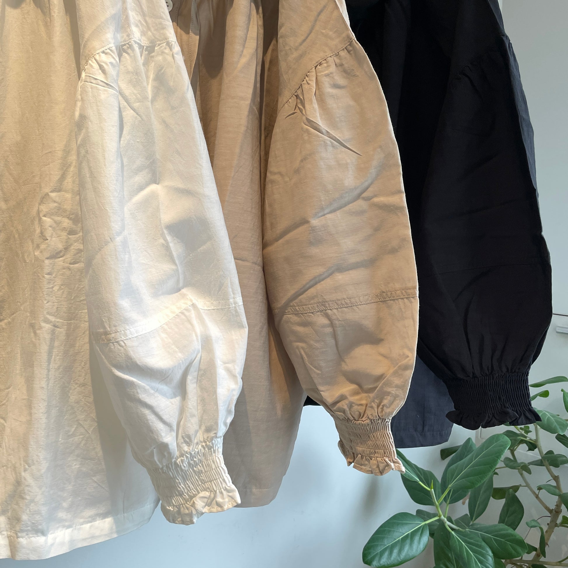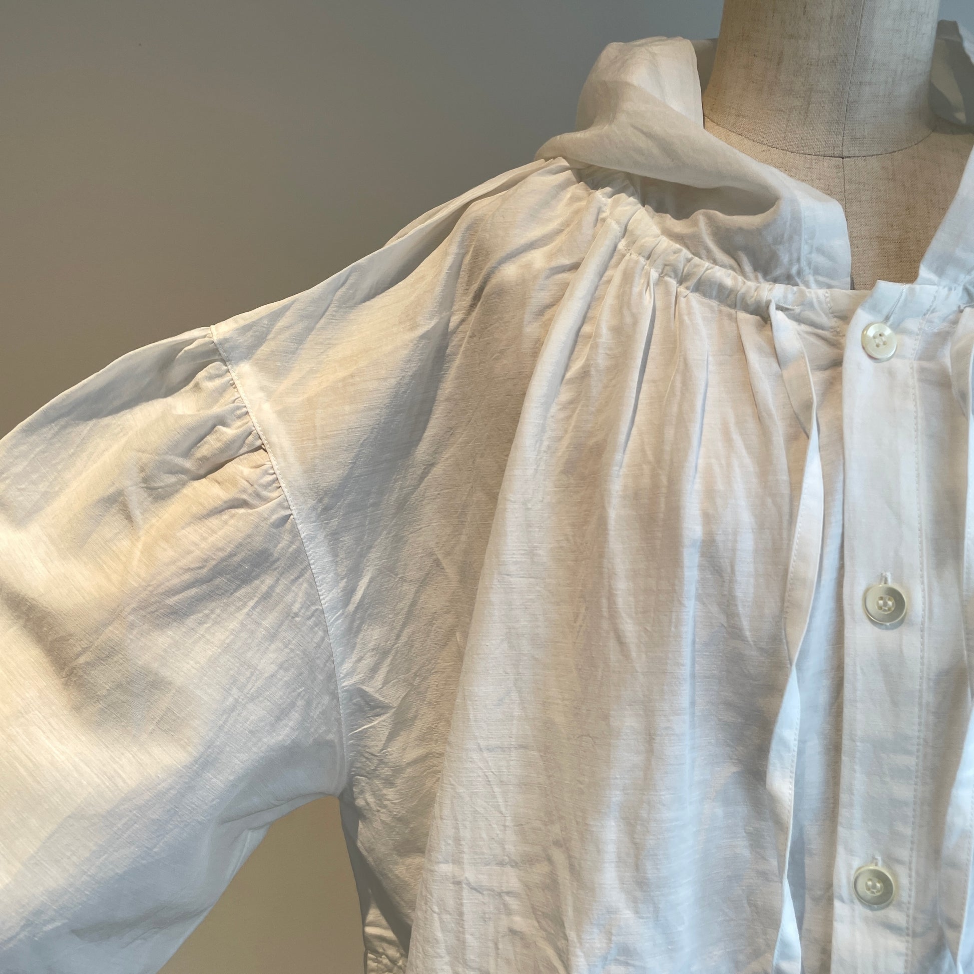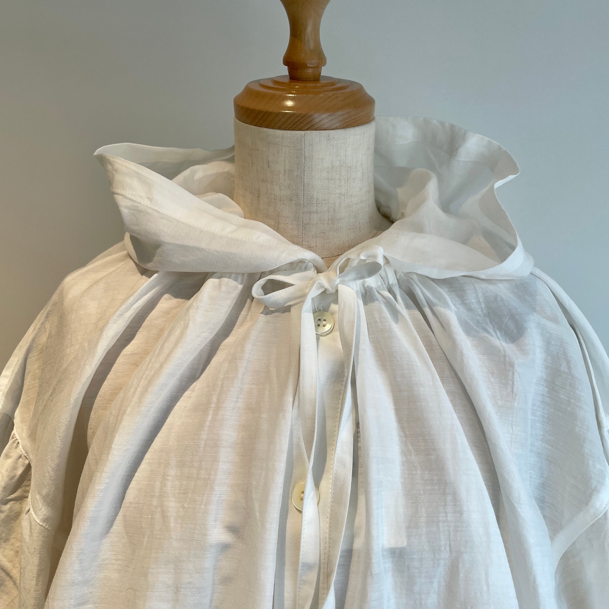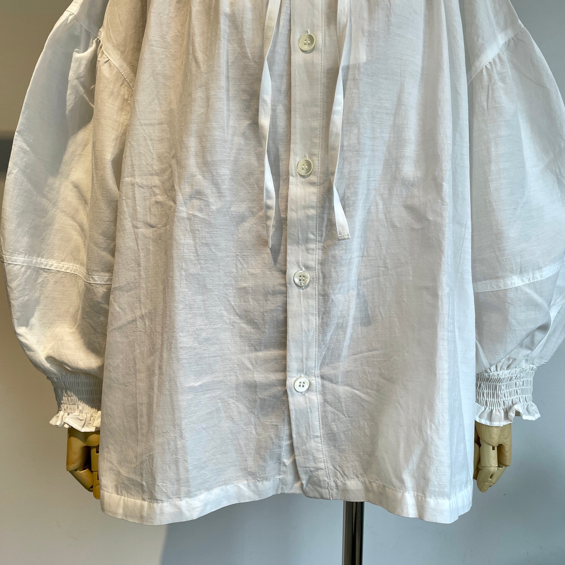 お袖のシャーリングは立体感が出せて、首元のリボンはしめかたで印象を変えて頂けます。
