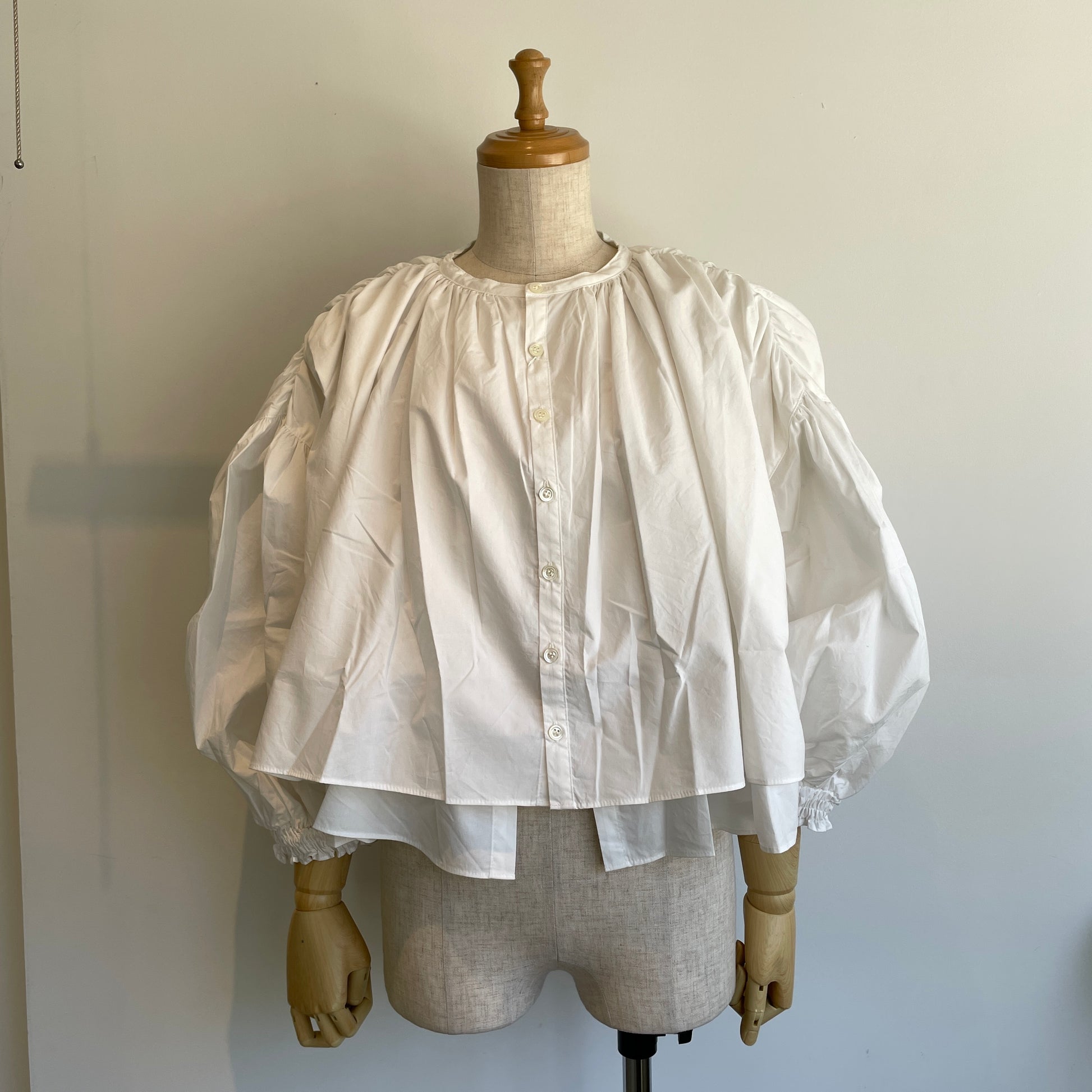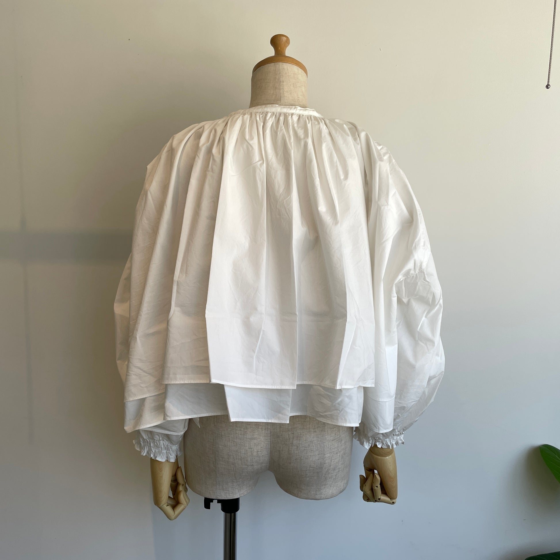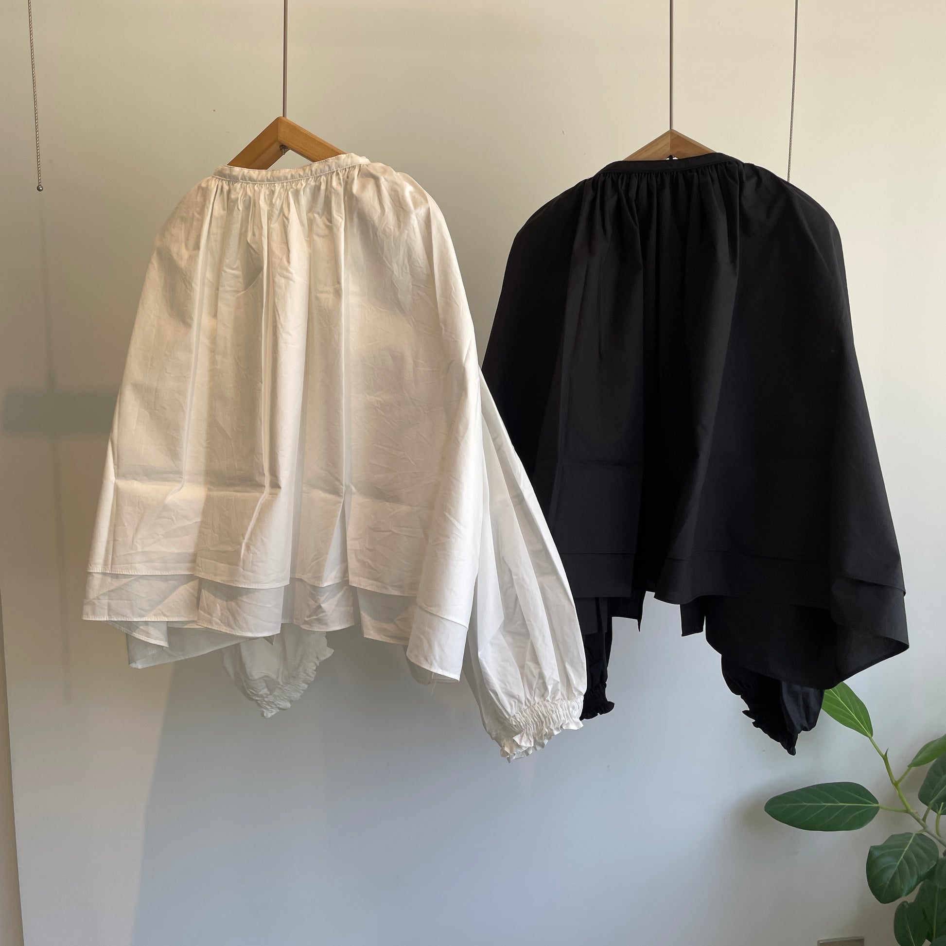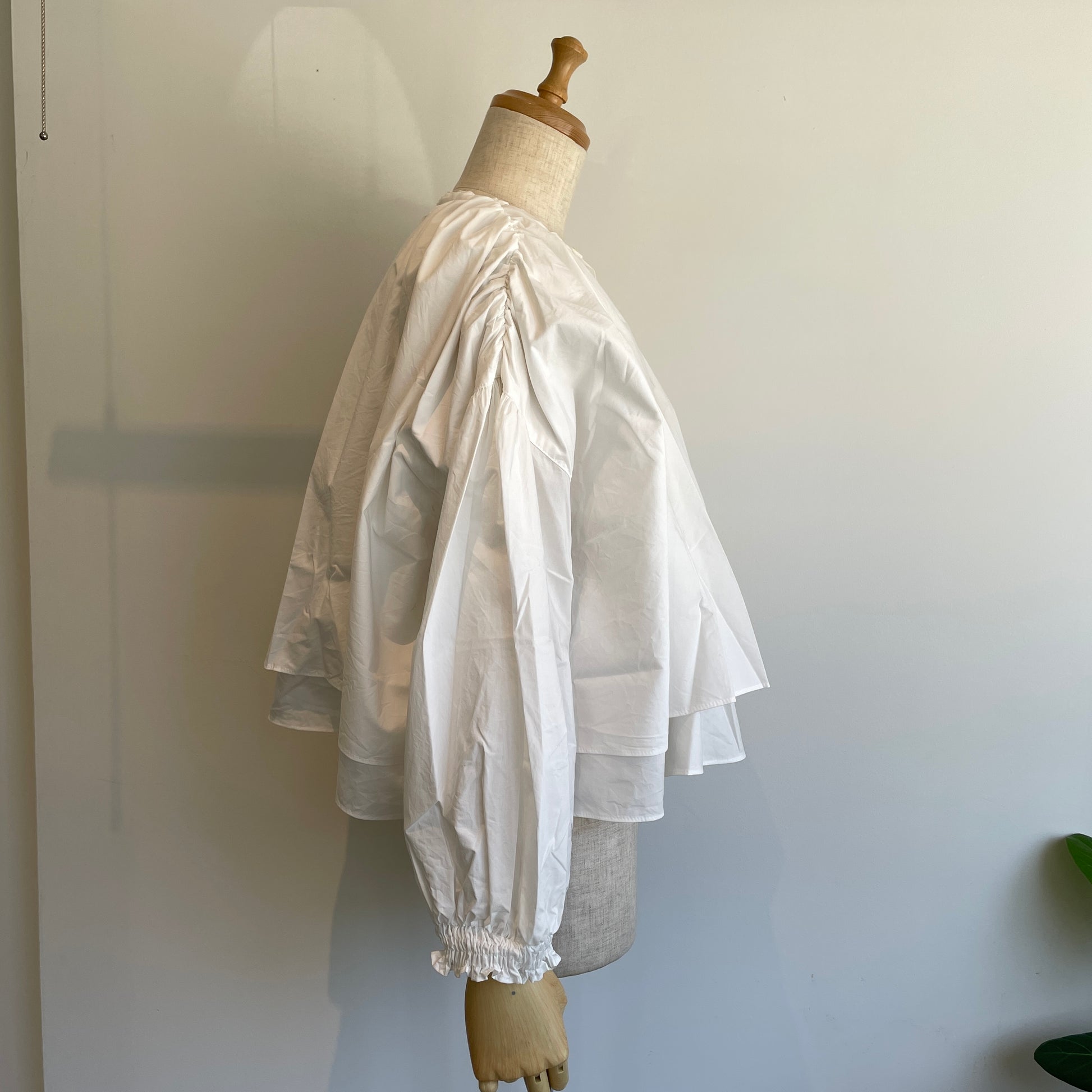 袖口シャーリング、ボートネック、身頃にたっぷりギャザーが入ったデザインです。
