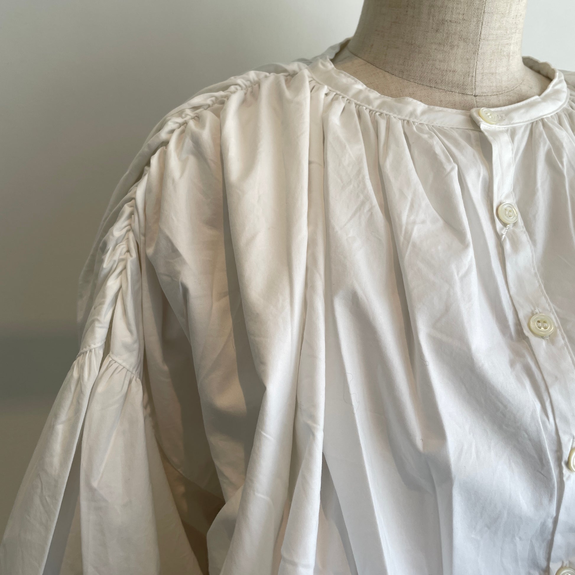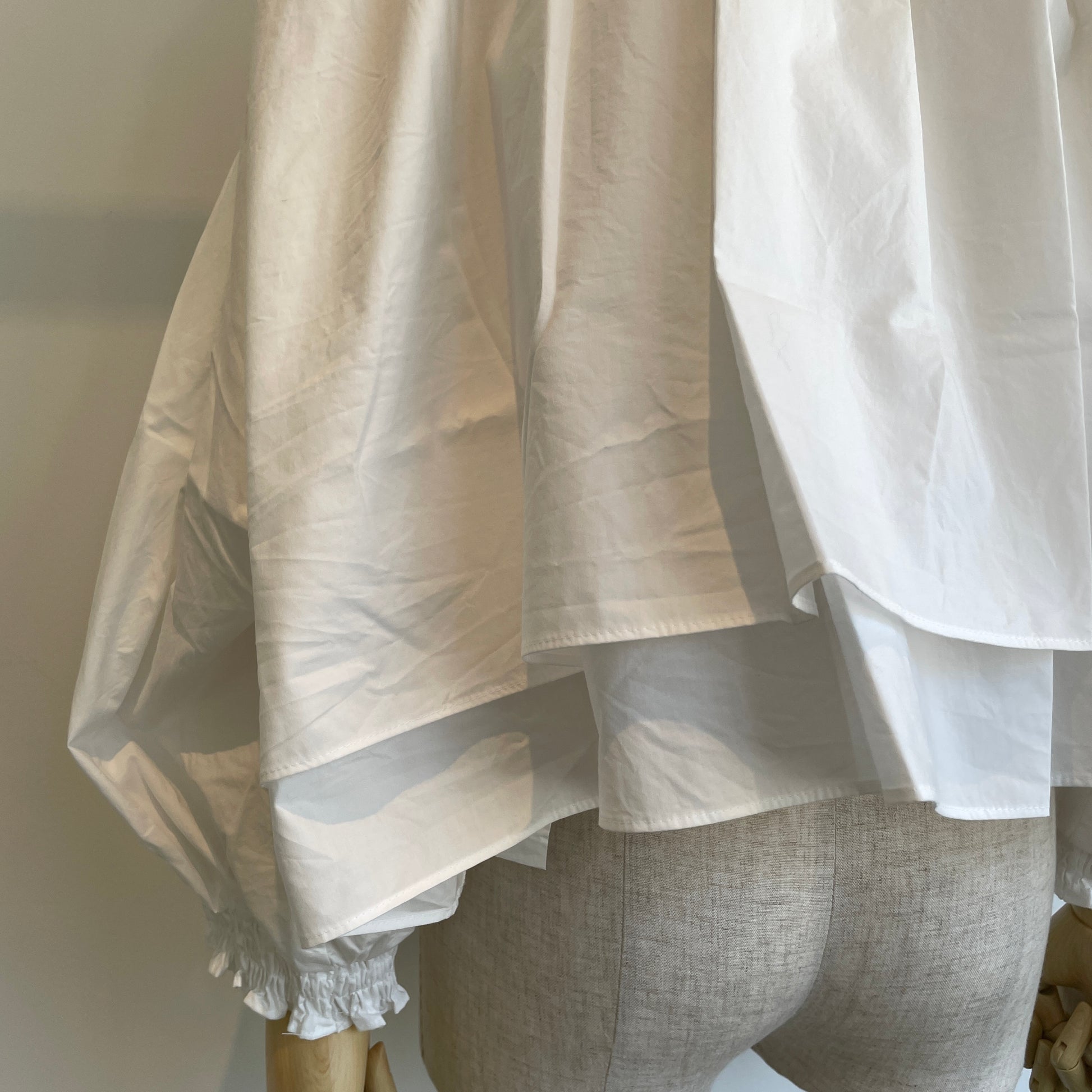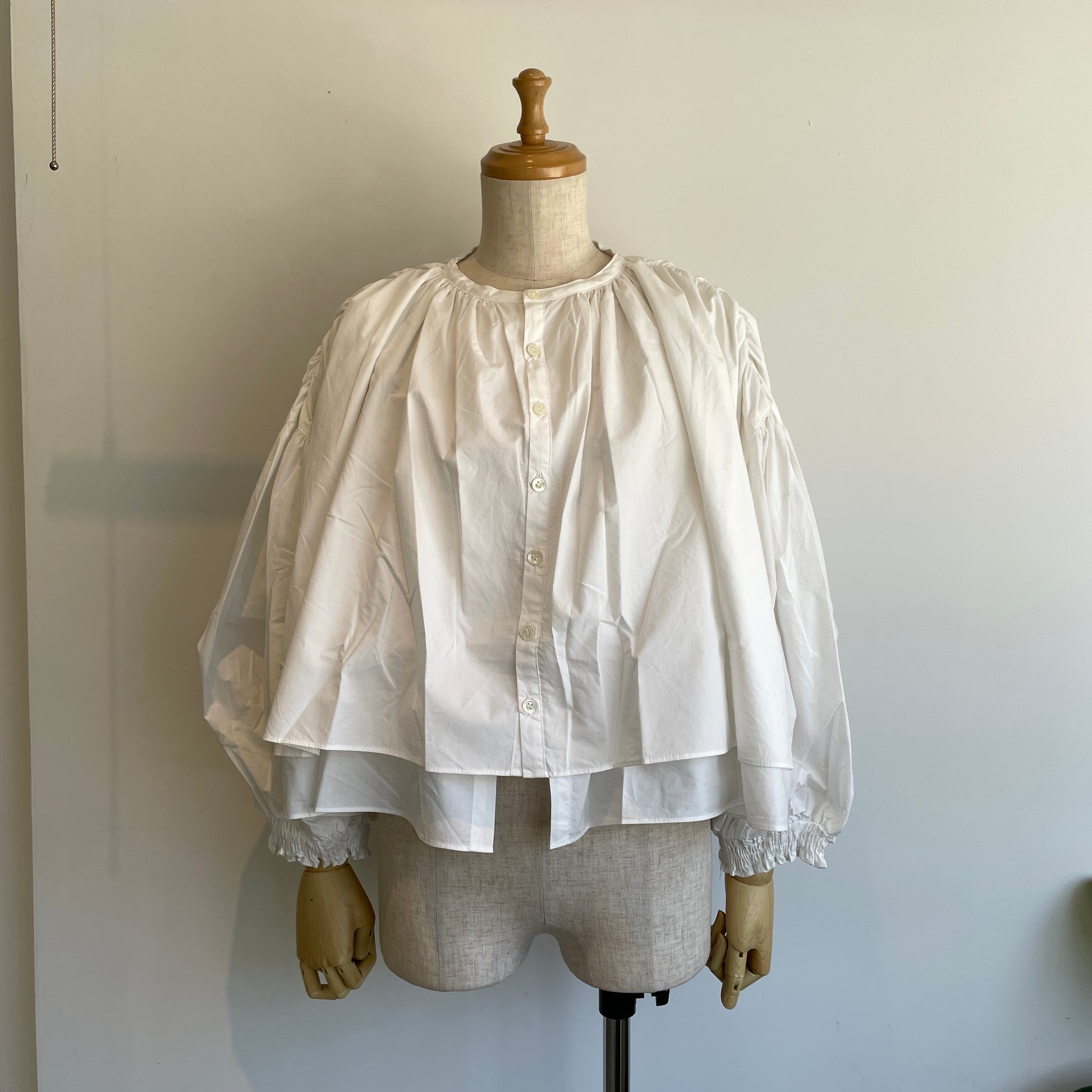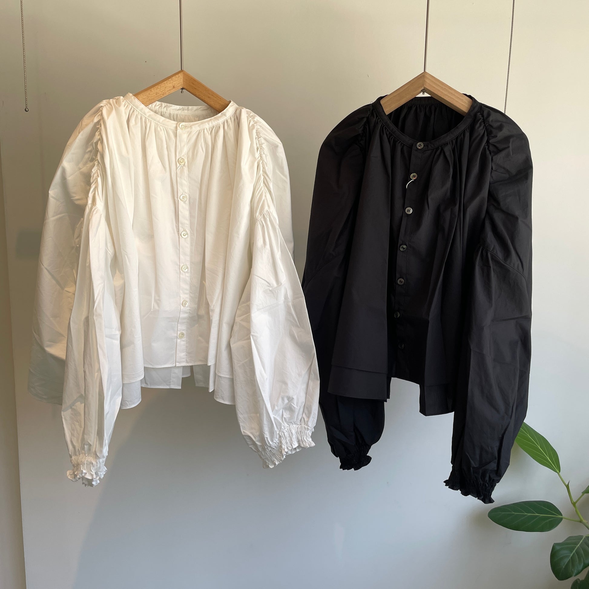 袖口シャーリング、ボートネック、身頃にたっぷりギャザーが入ったデザインです。
