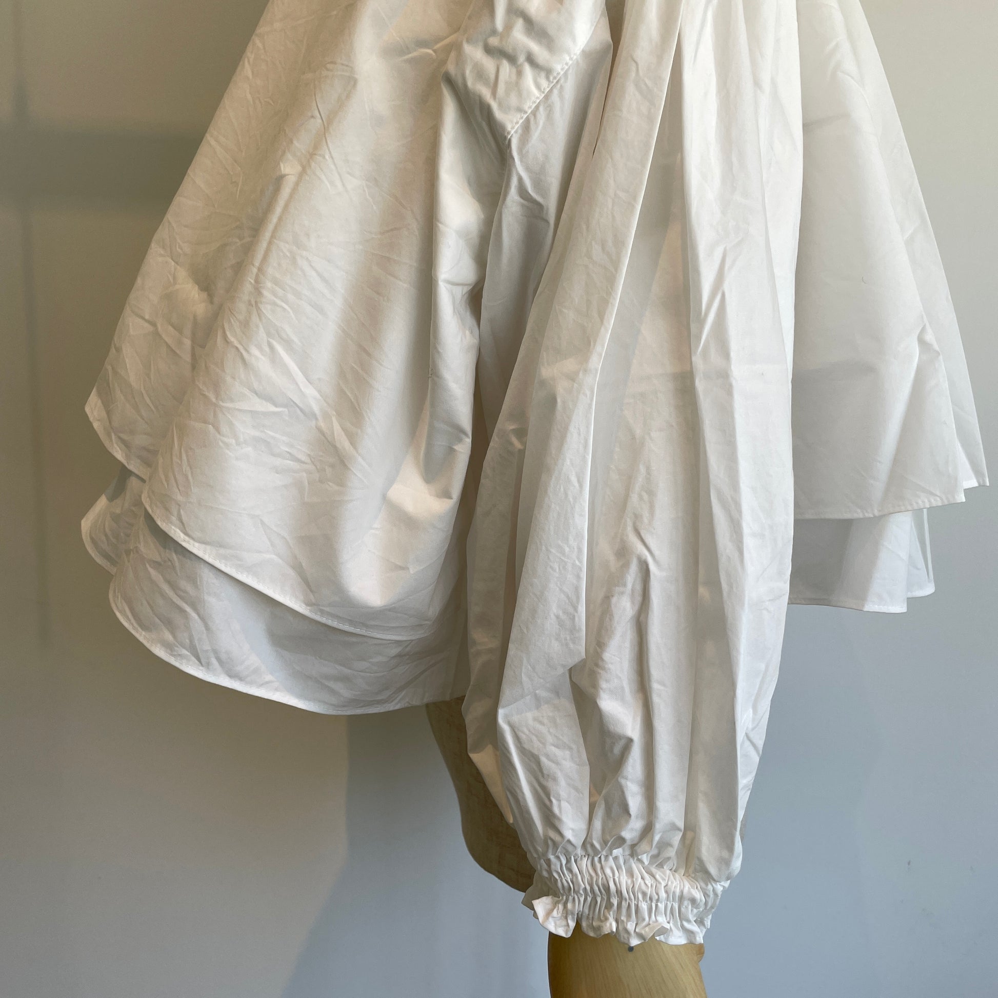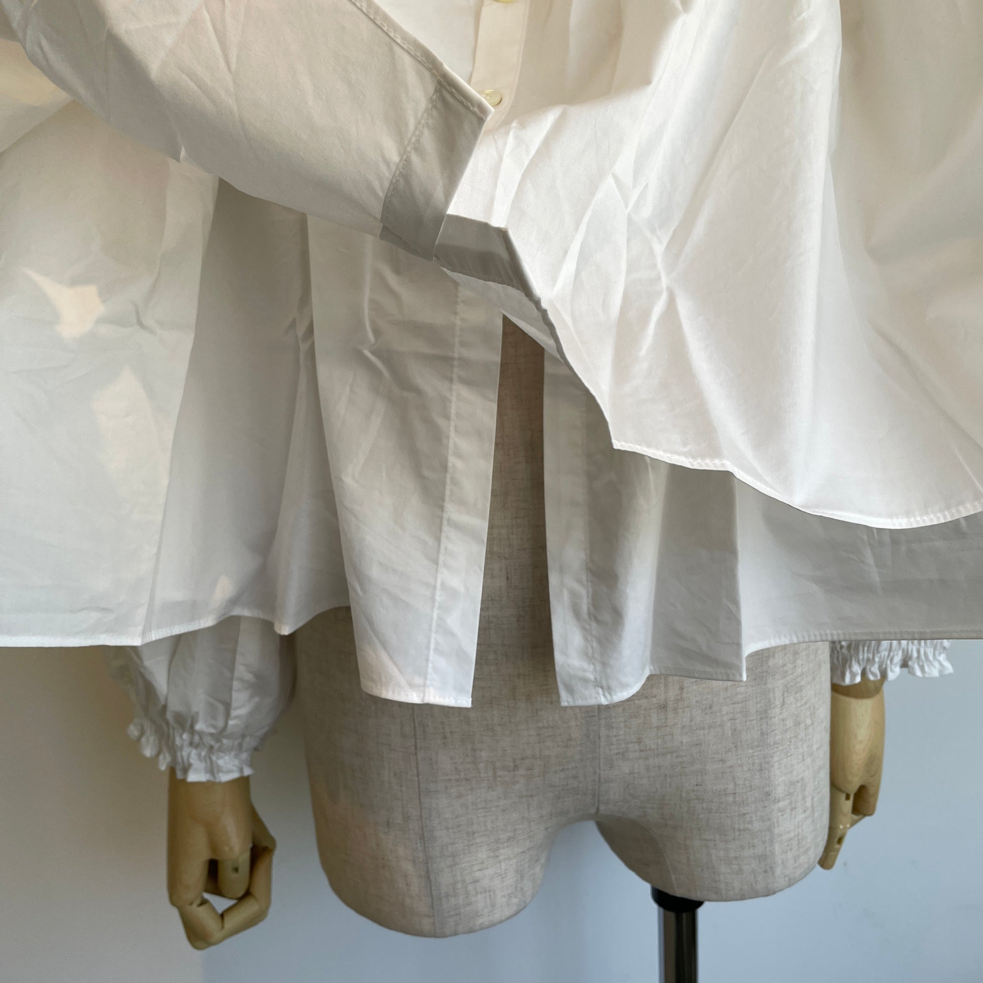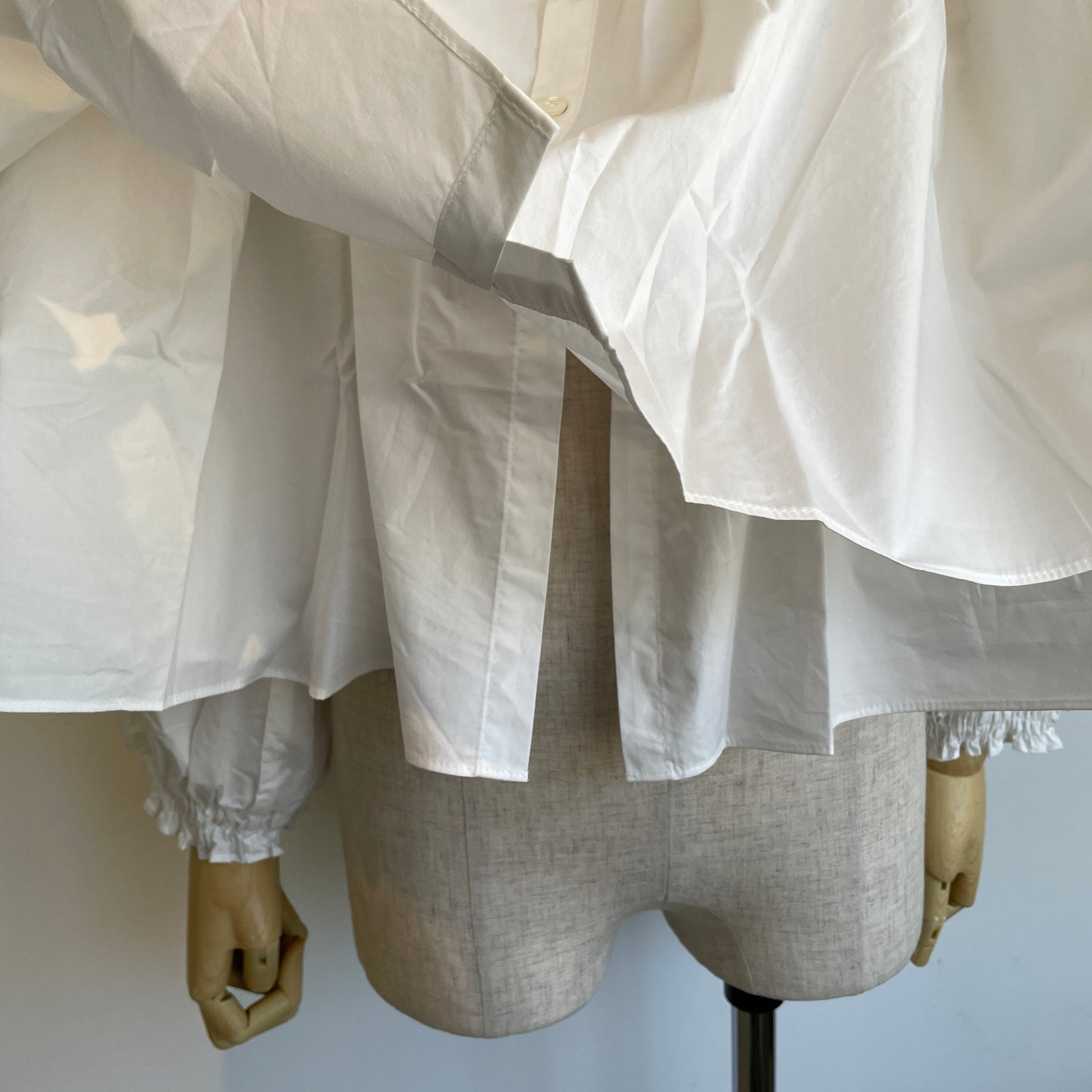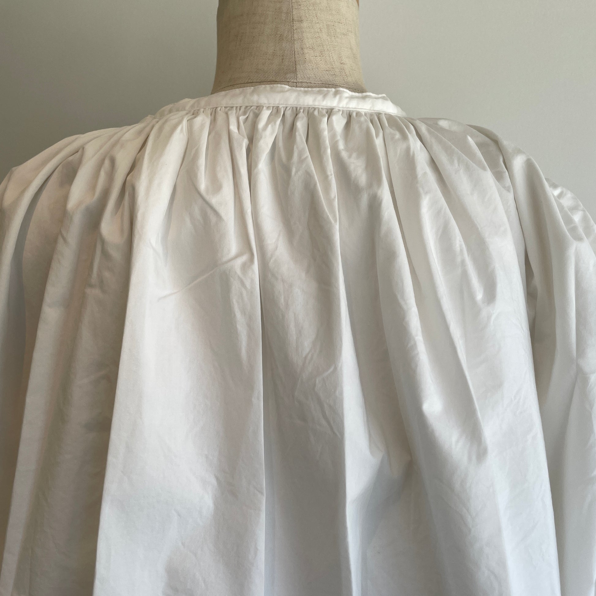 袖口シャーリング、ボートネック、身頃にたっぷりギャザーが入ったデザインです。