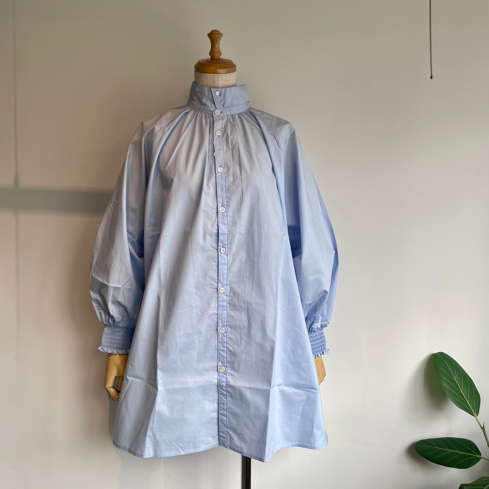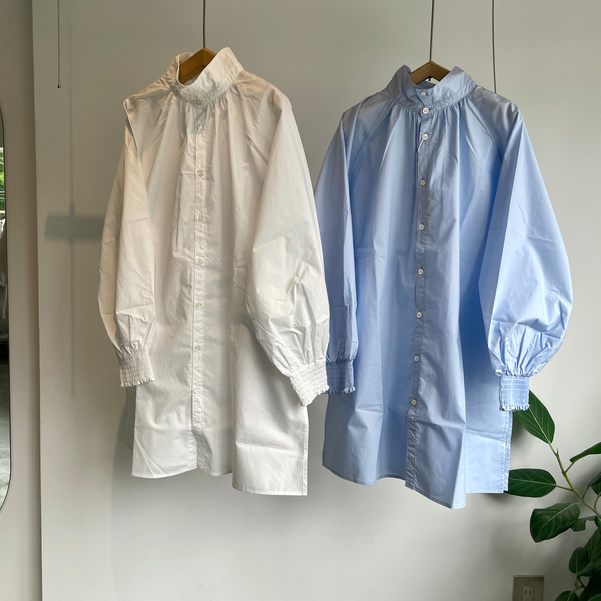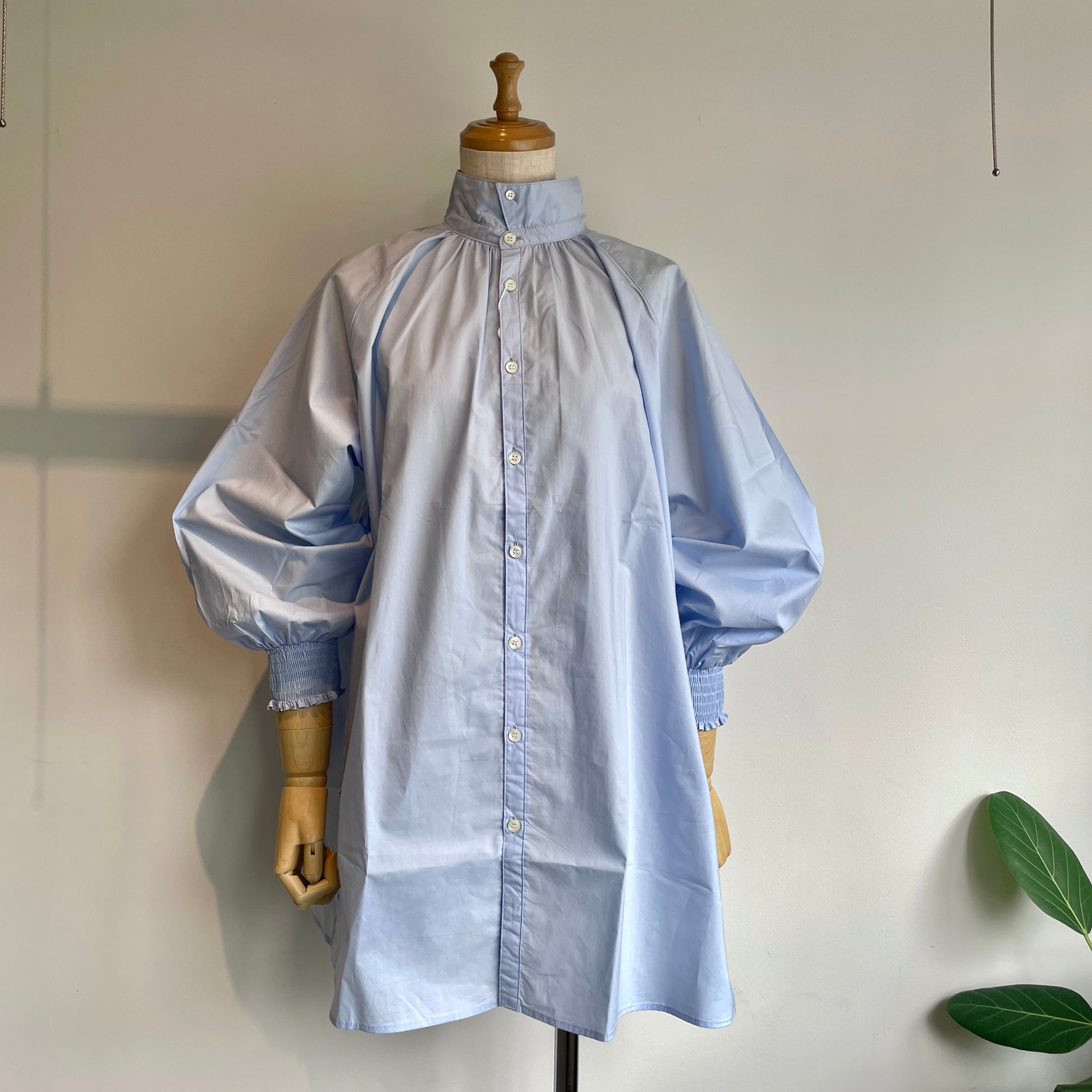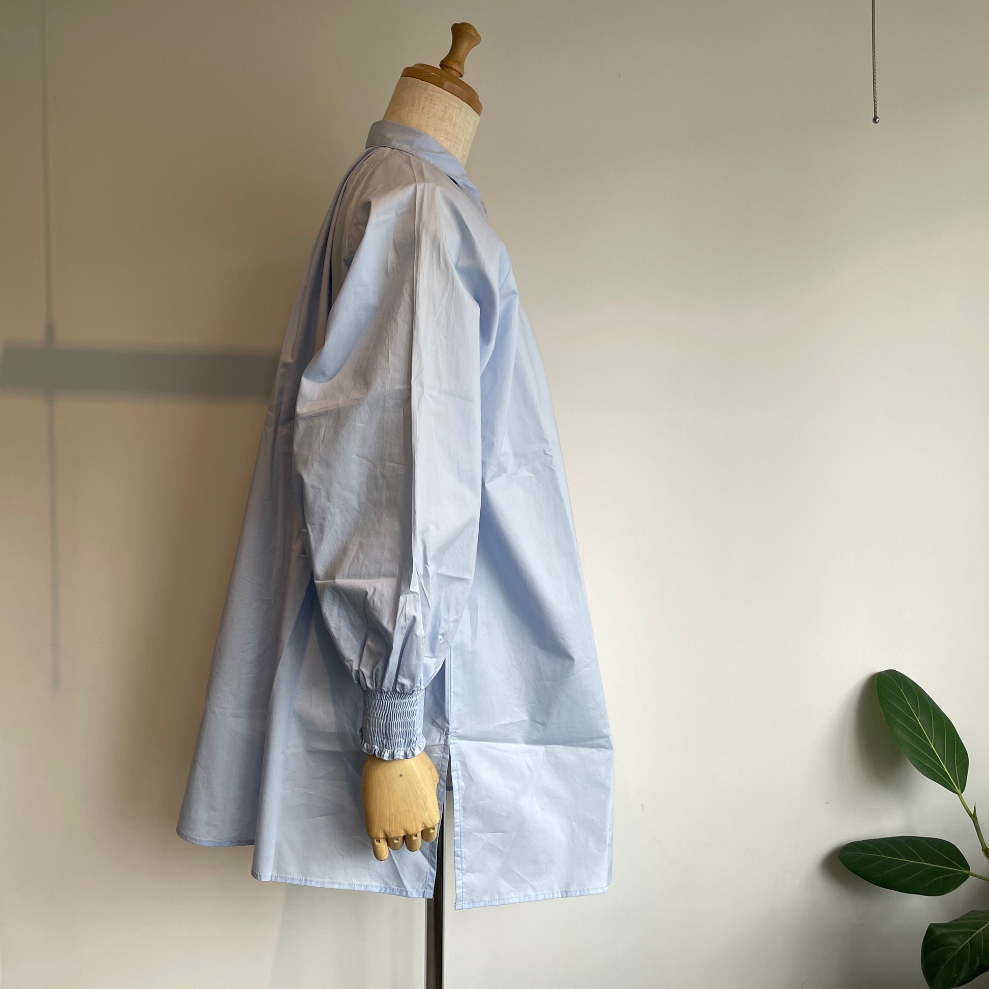 定番素材のシルキーな手触りのオリジナルタイプライターを使用した丈のあるブラウス。