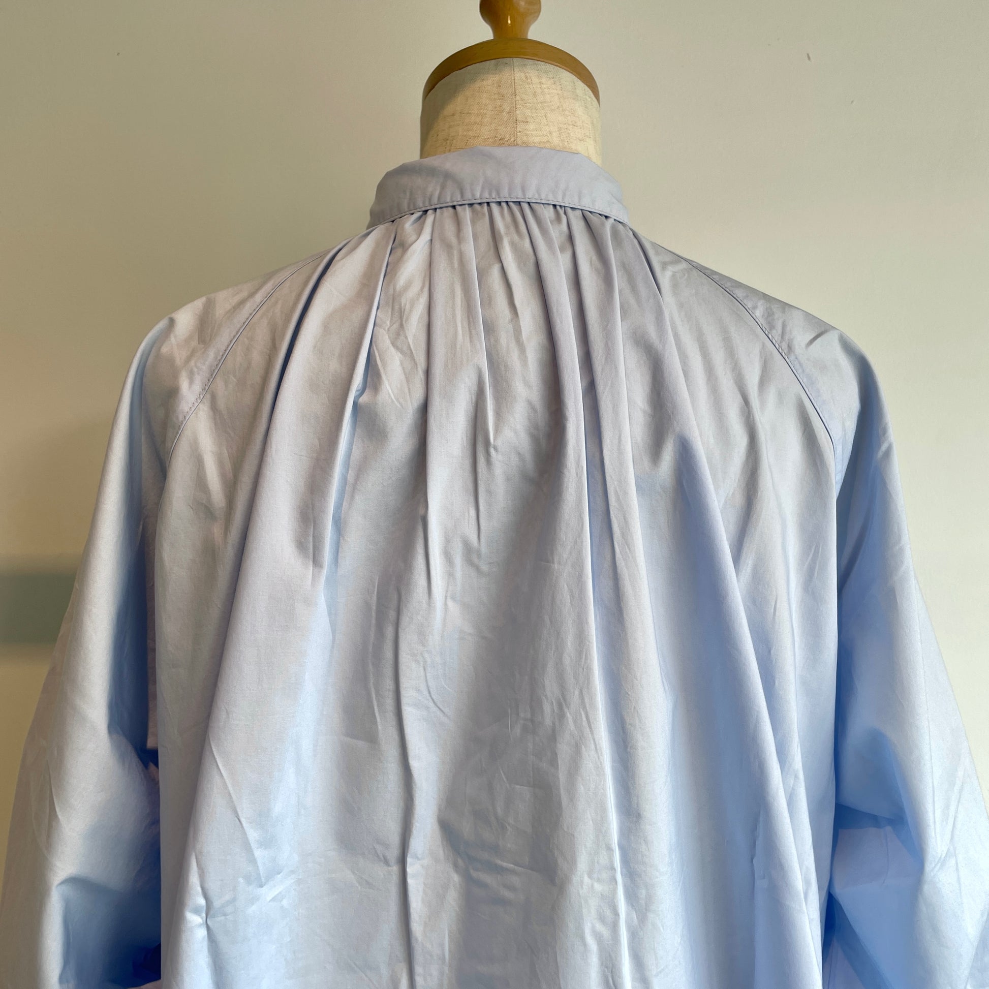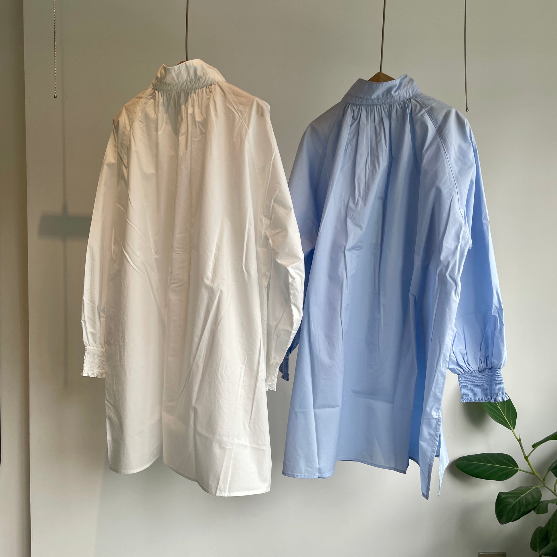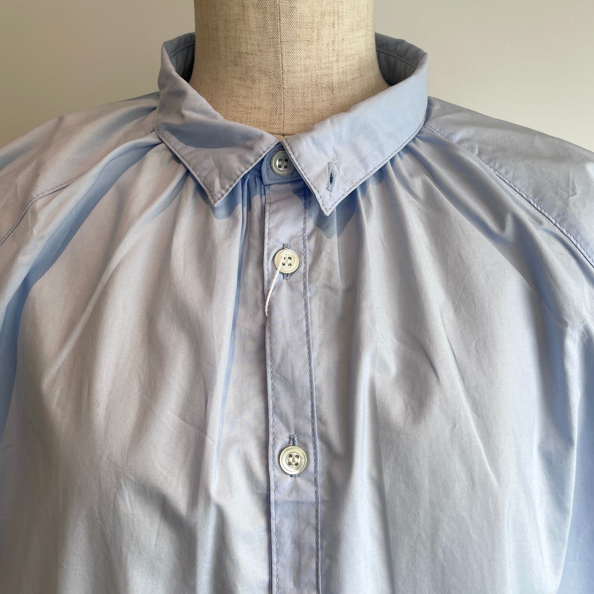 定番素材のシルキーな手触りのオリジナルタイプライターを使用した丈のあるブラウス。