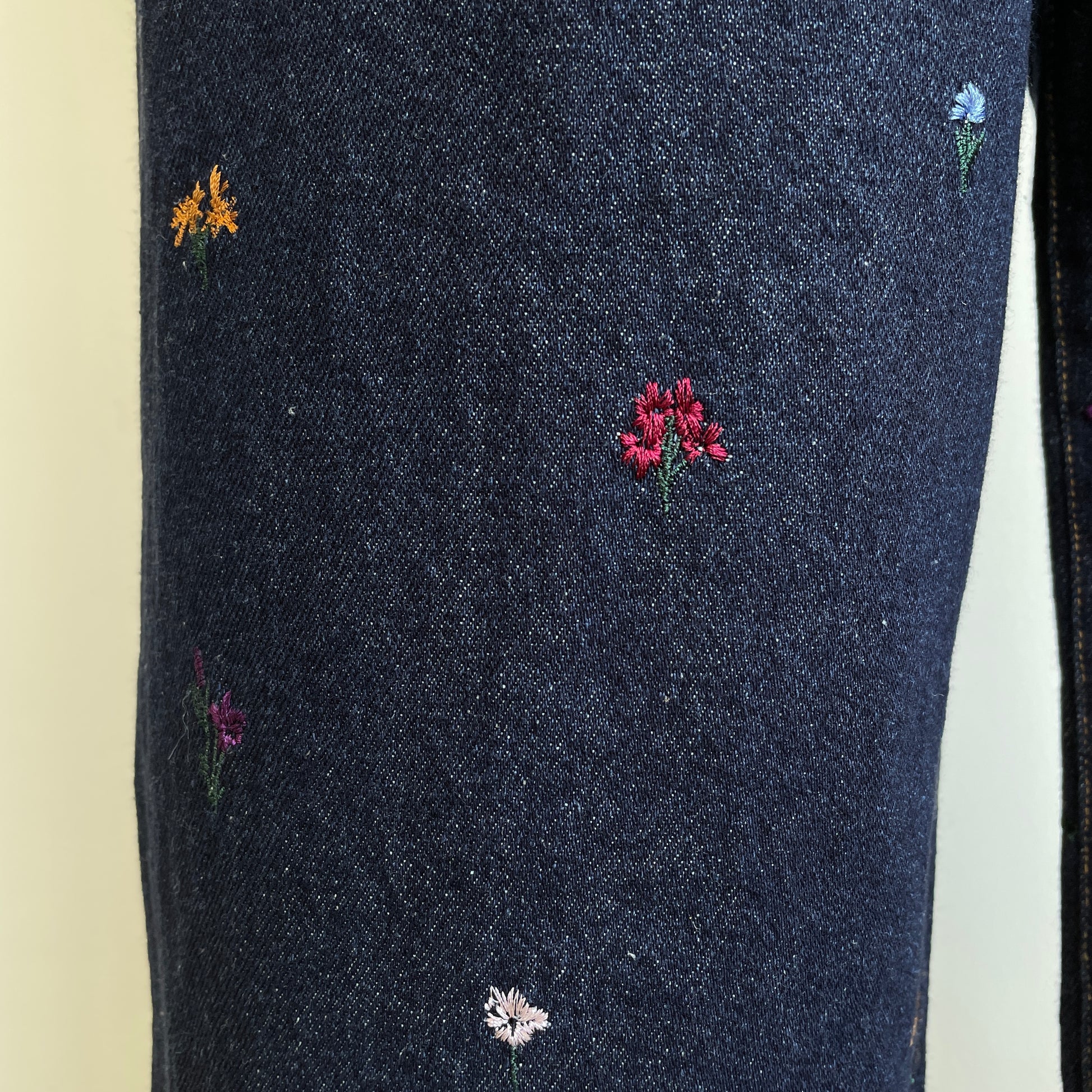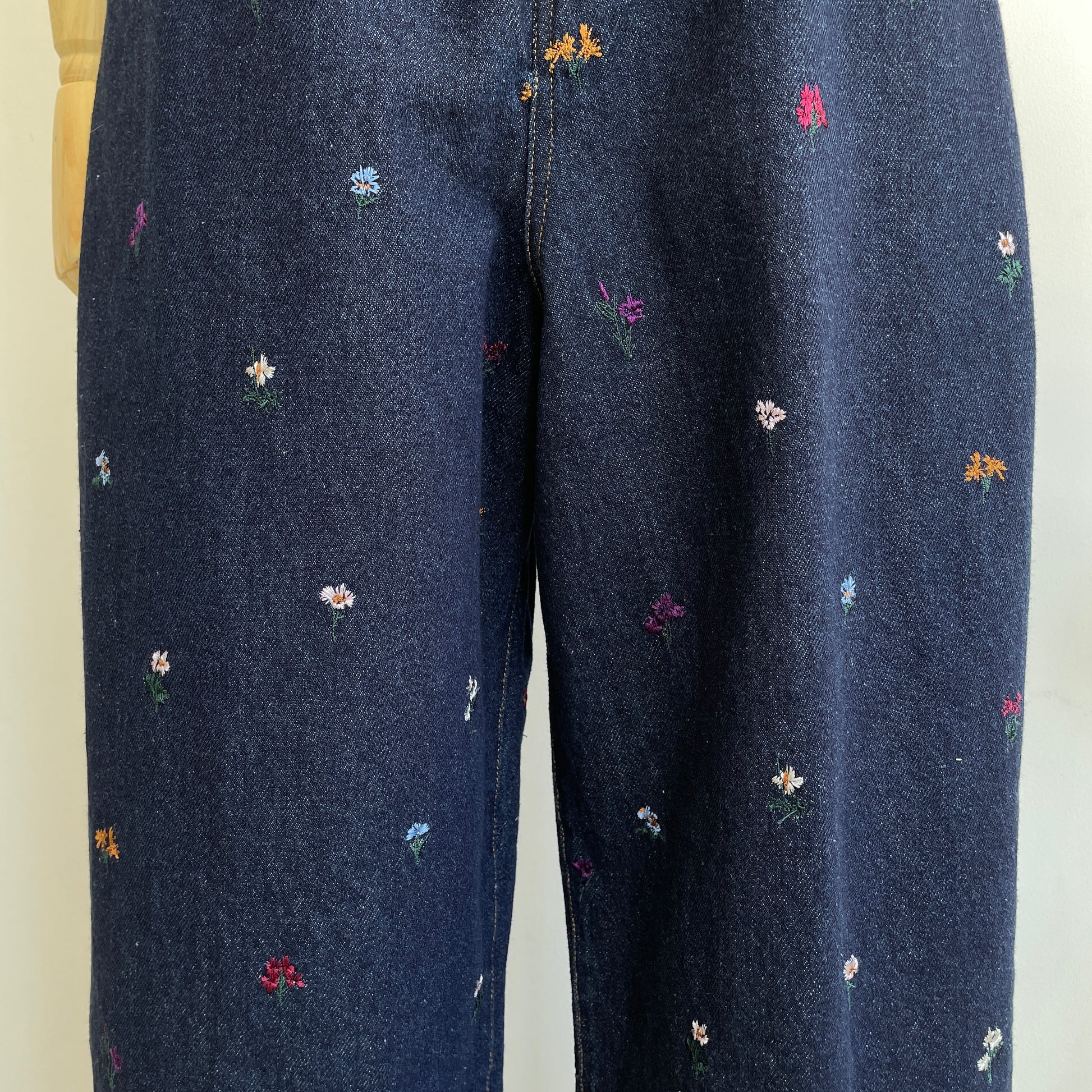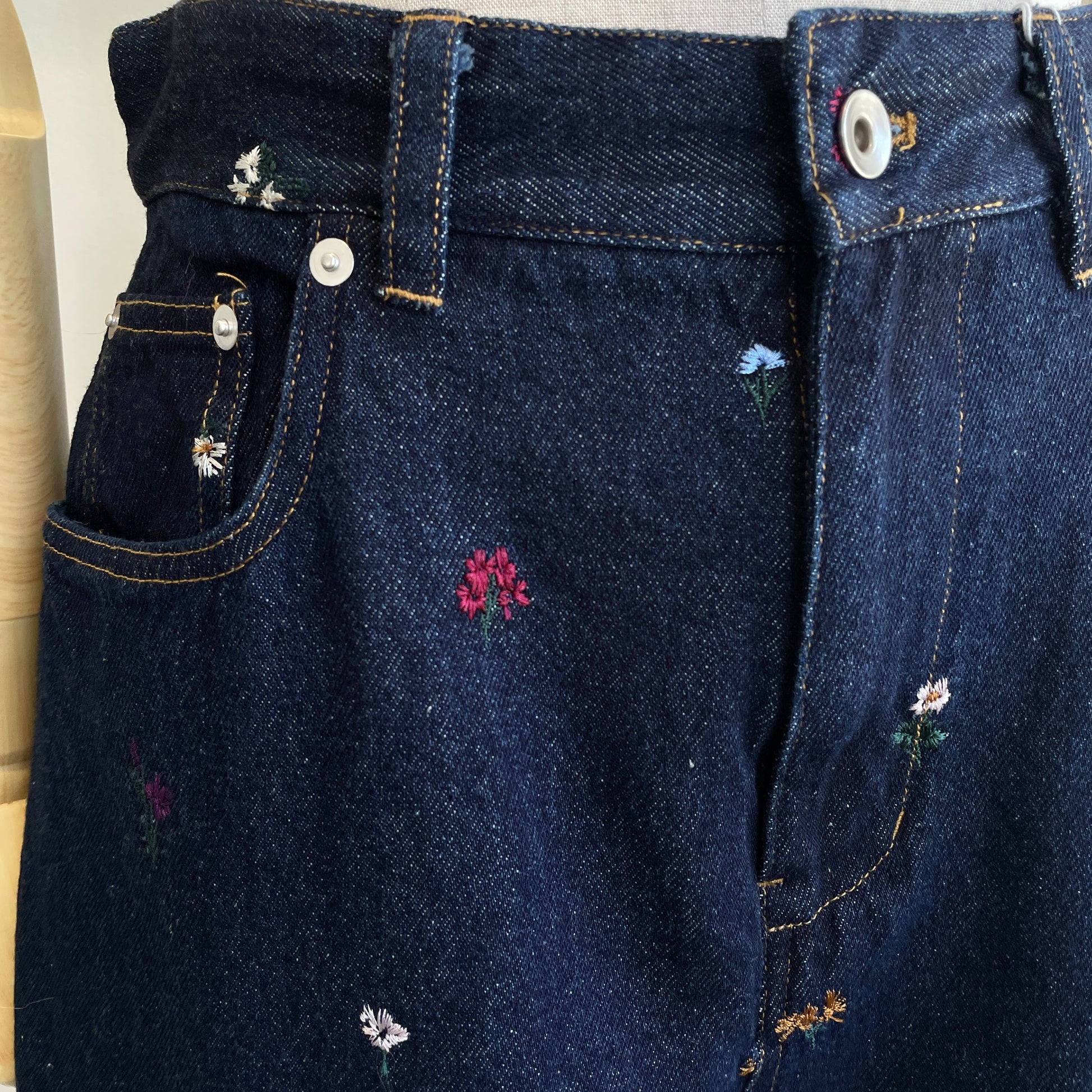 深みのあるインディゴデニム生地に、カラフルな小花刺繍を丁寧に施した特別なテキスタイルです。