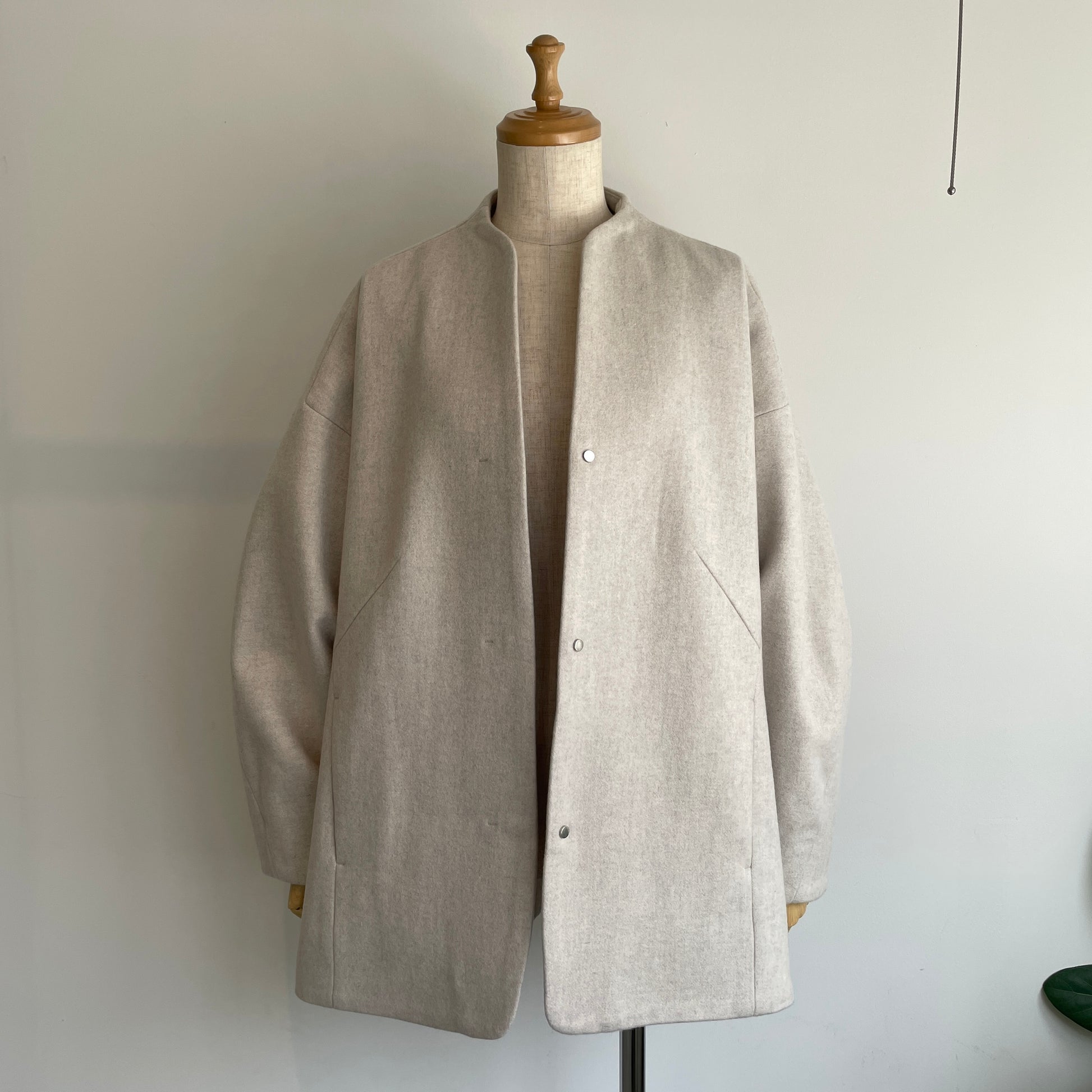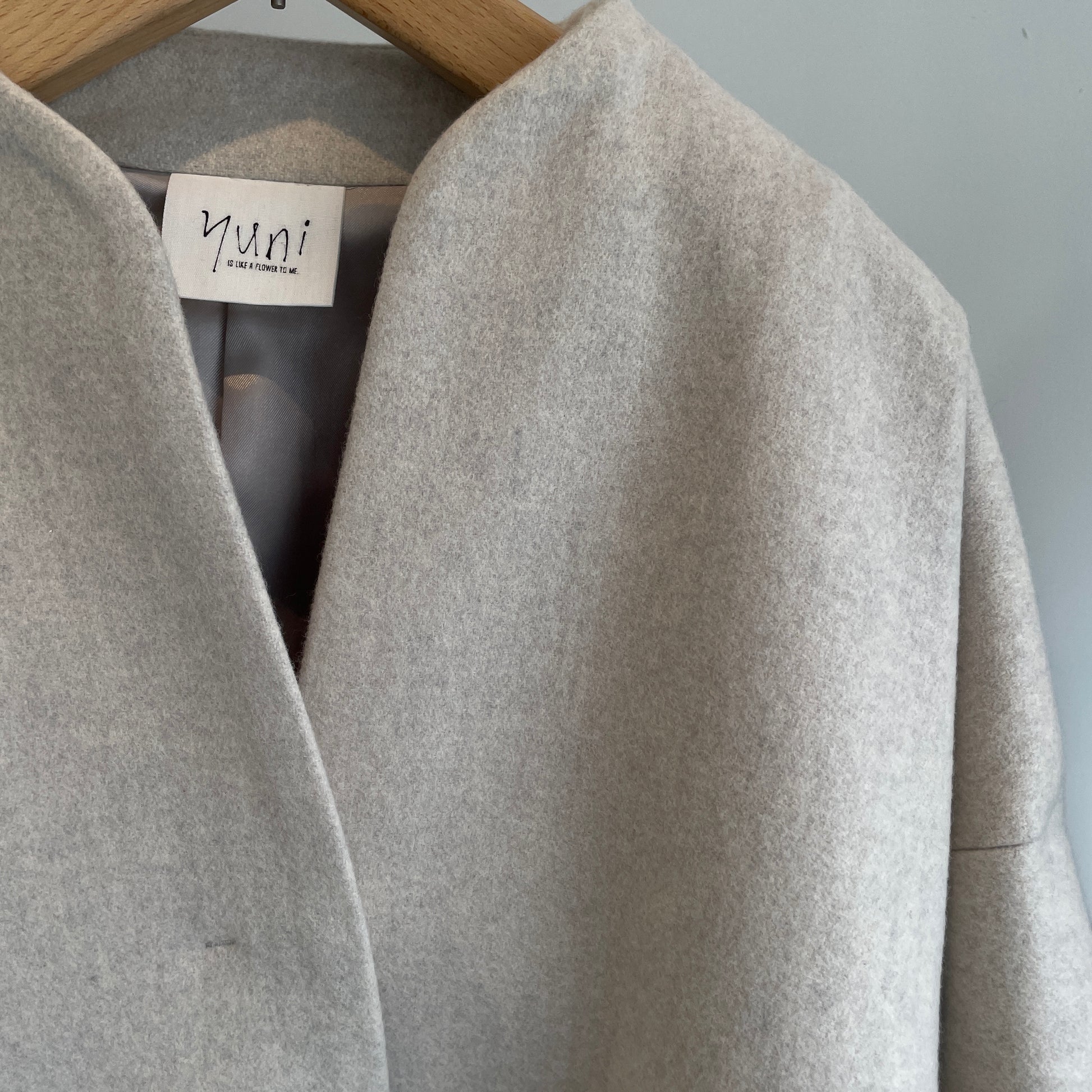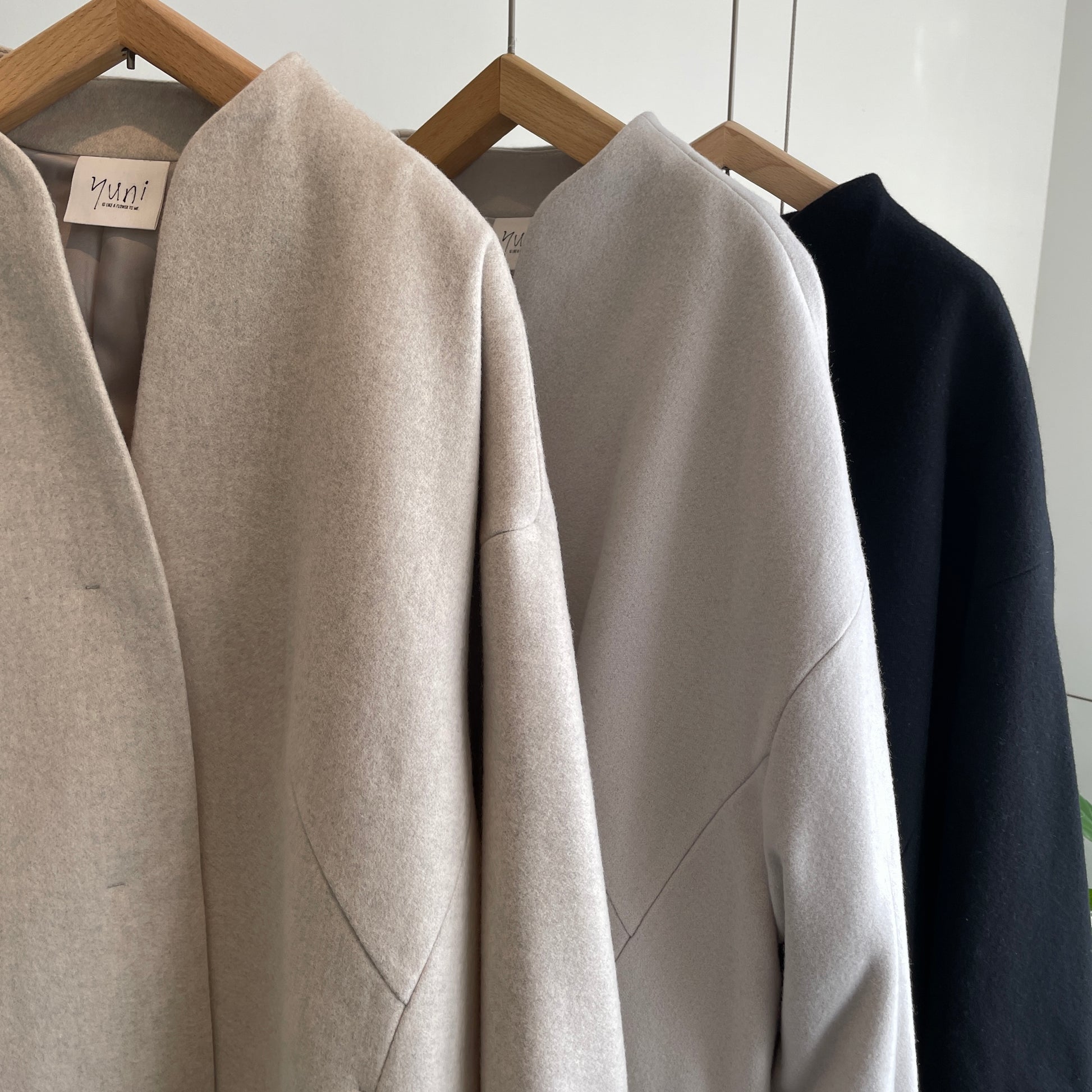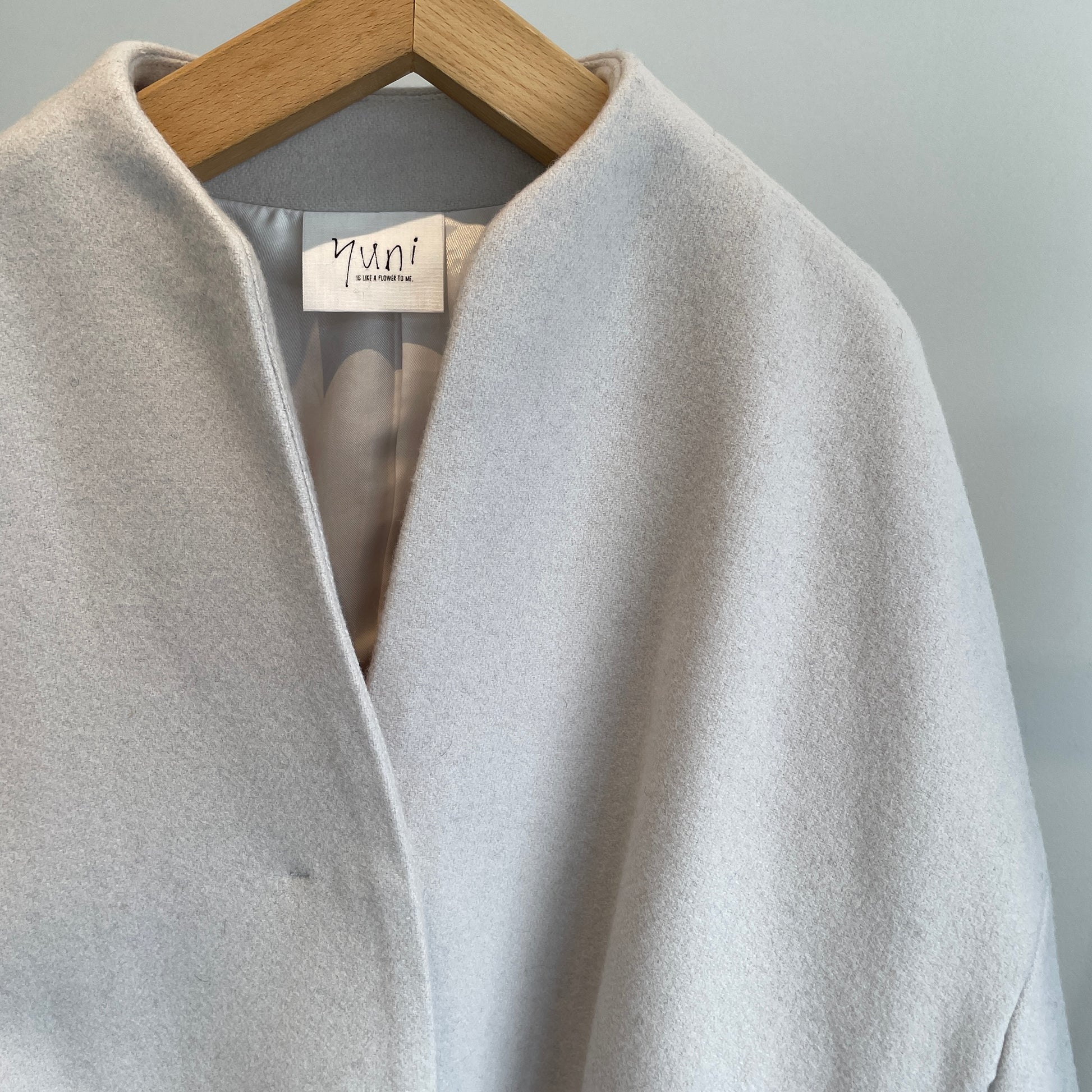 繊維の長いウールを贅沢に使用し、尾州で丁寧に織り上げたyuni定番のスーパー100素材のノーカラーコート 。
