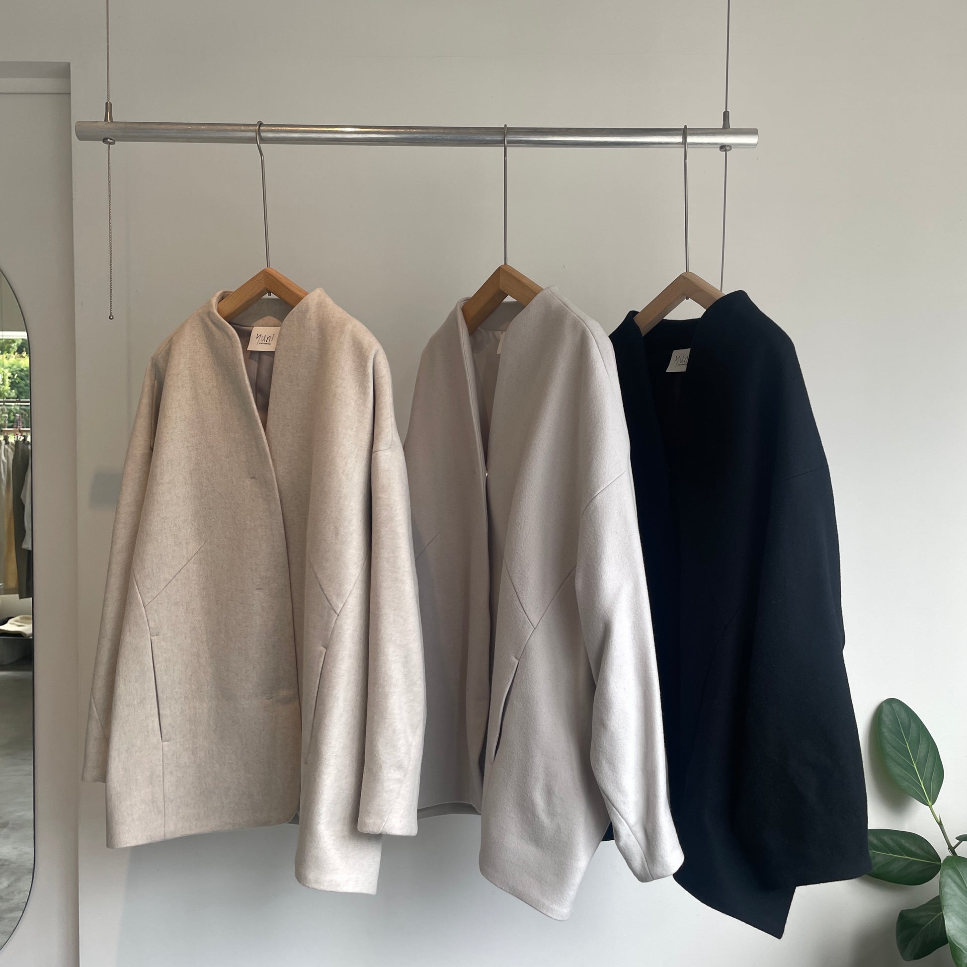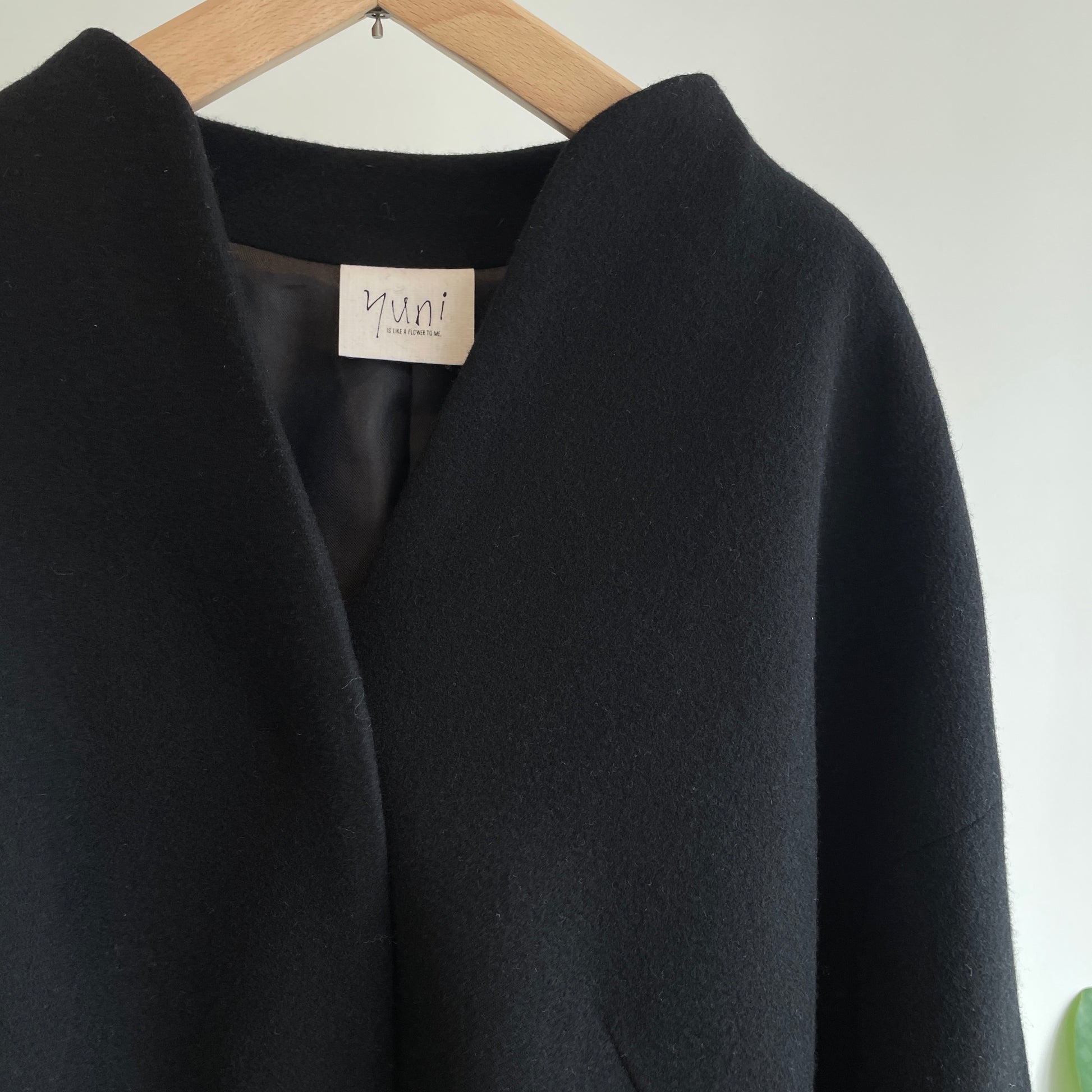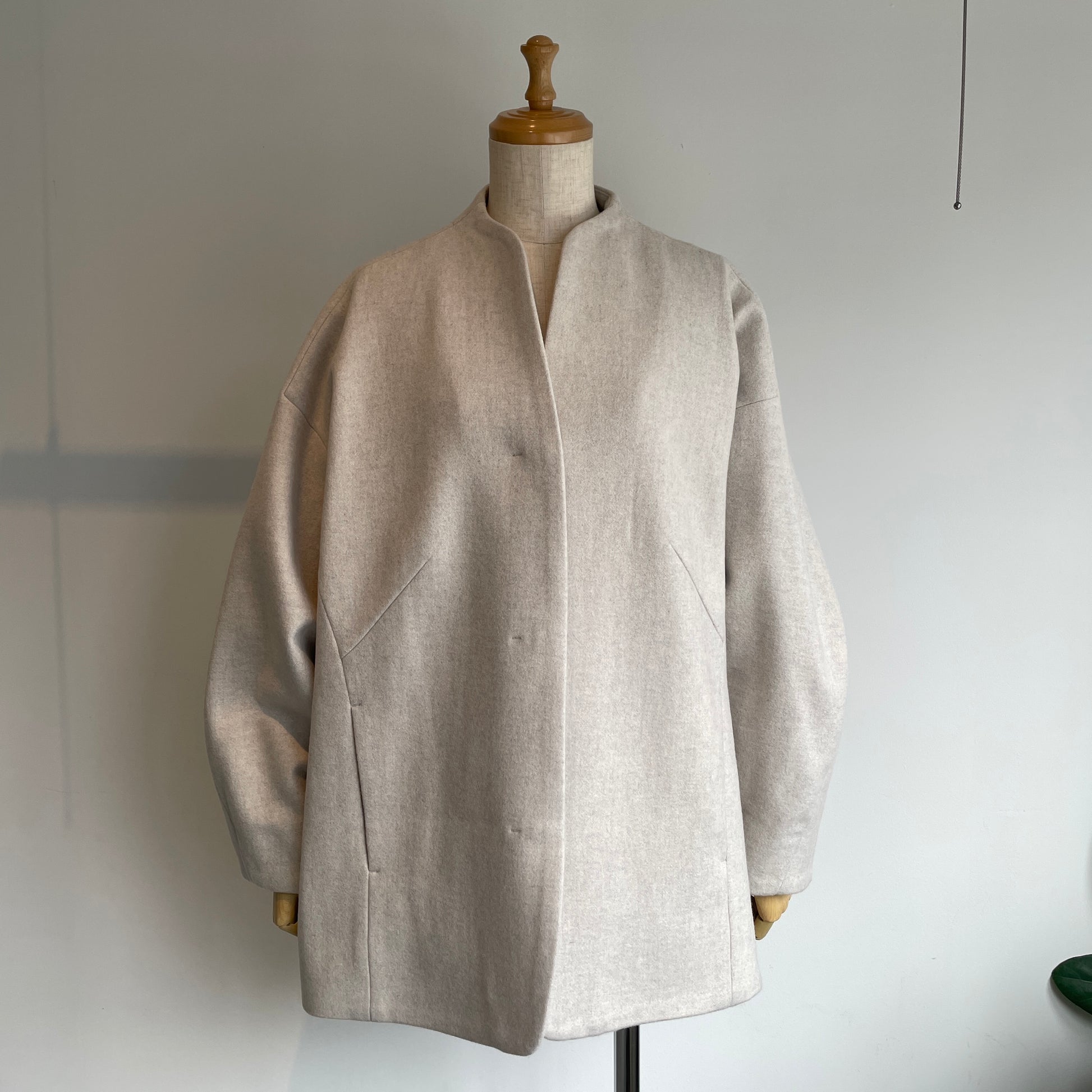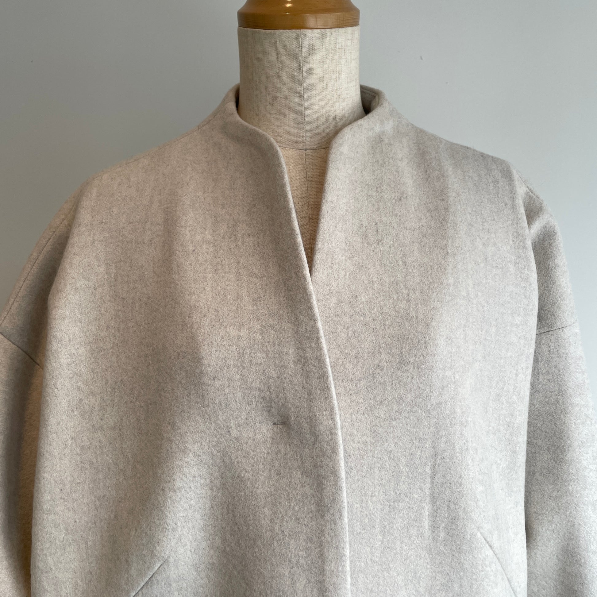 繊維の長いウールを贅沢に使用し、尾州で丁寧に織り上げたyuni定番のスーパー100素材のノーカラーコート 。