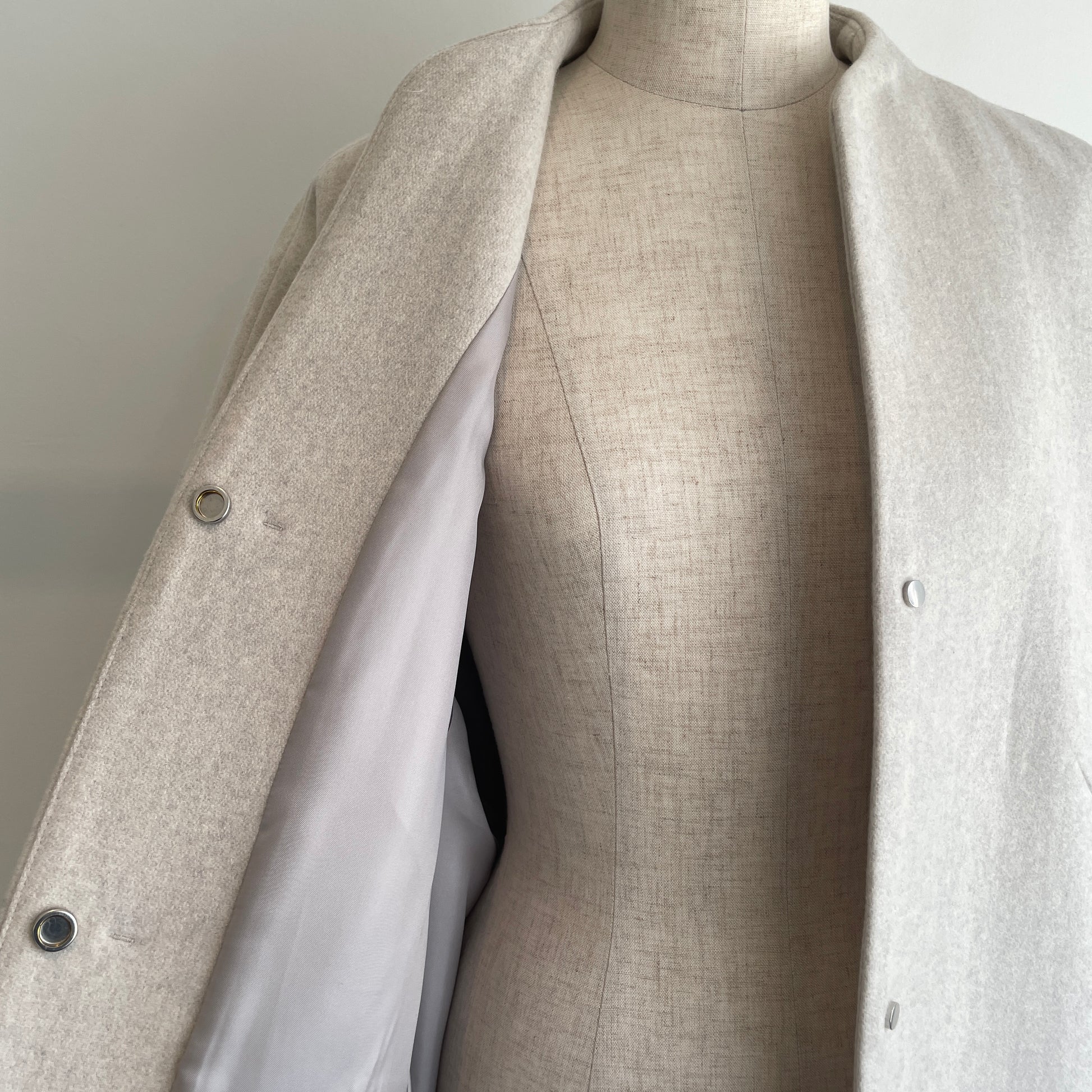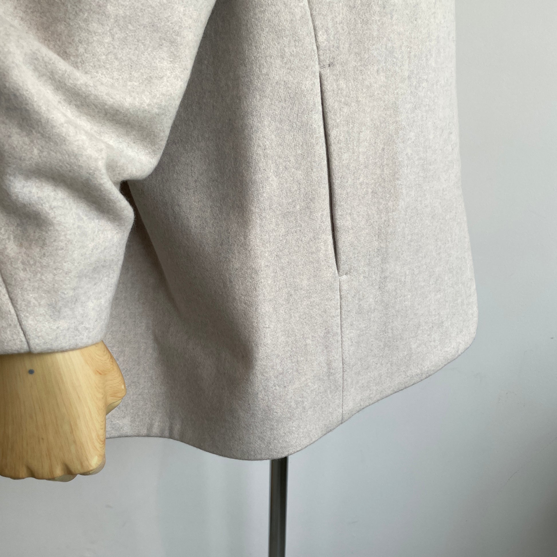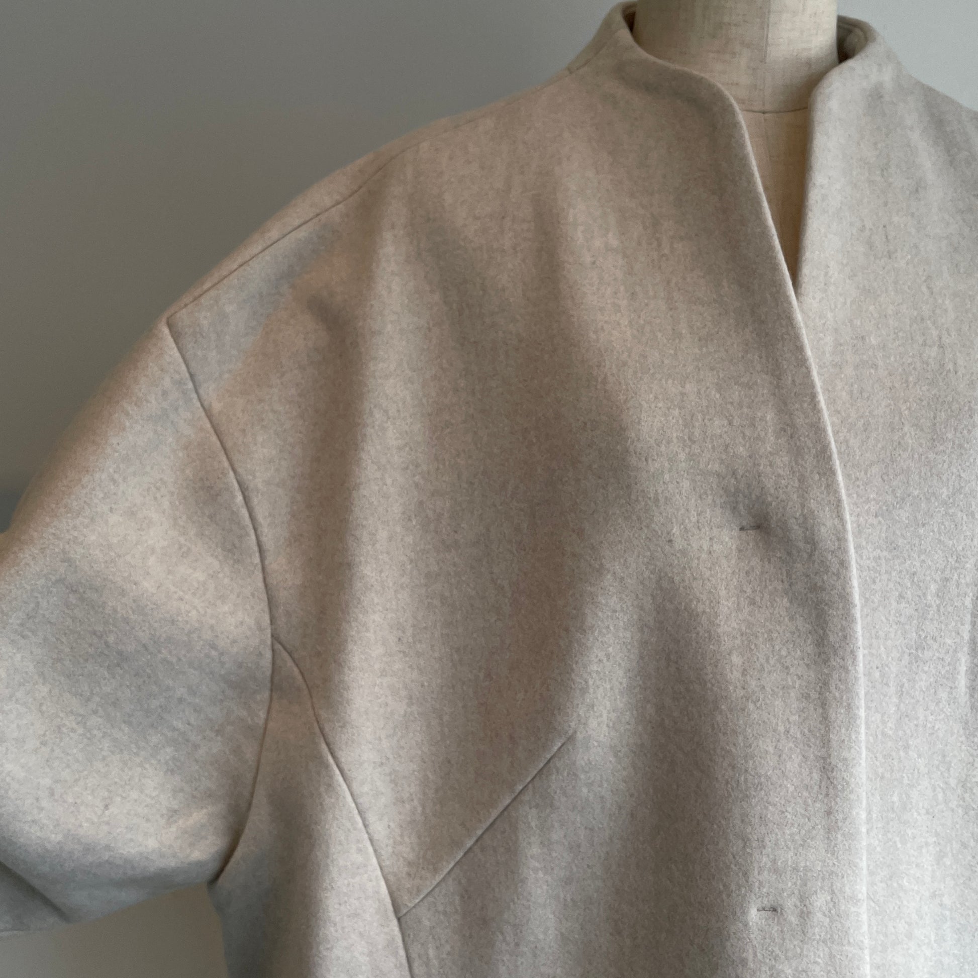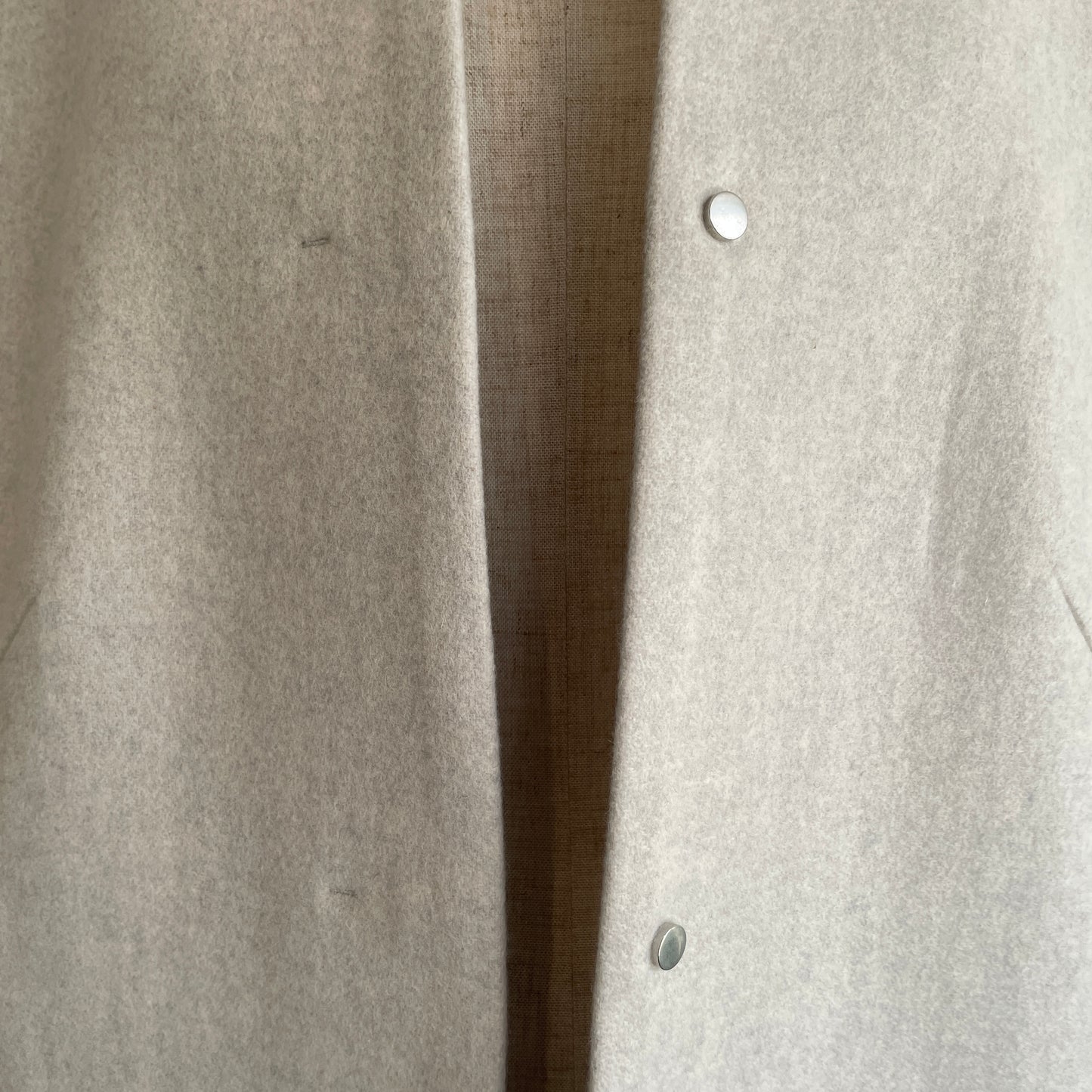 繊維の長いウールを贅沢に使用し、尾州で丁寧に織り上げたyuni定番のスーパー100素材のノーカラーコート 。