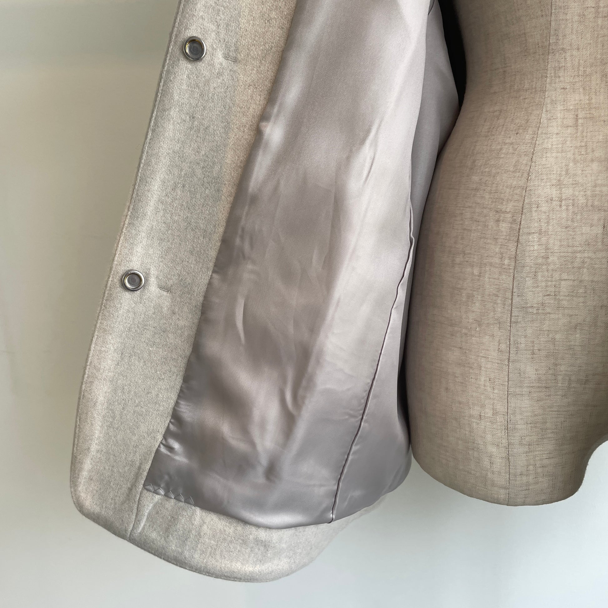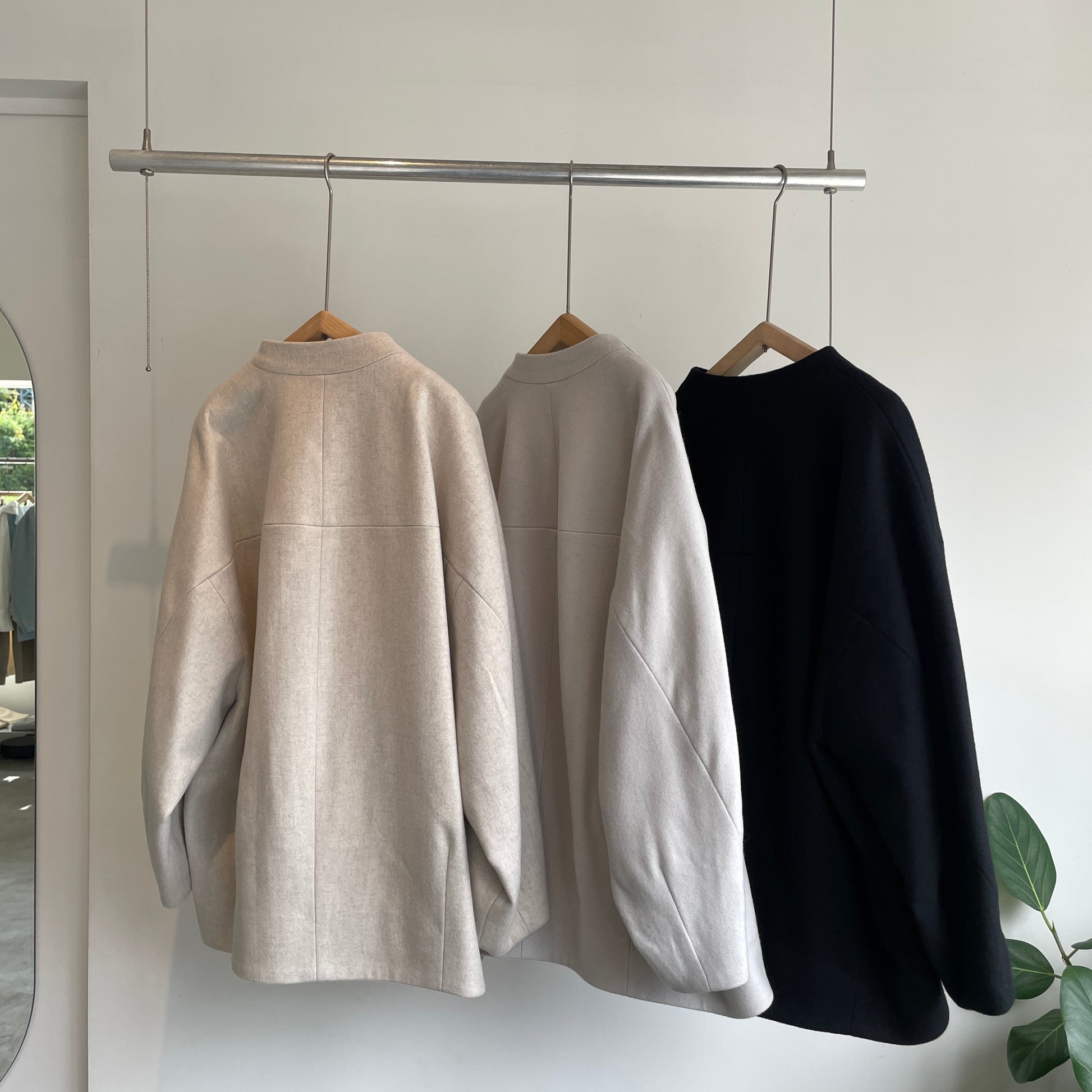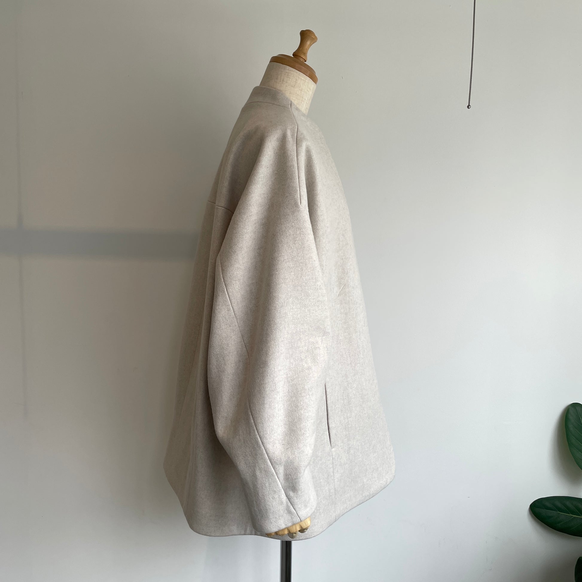 少し立ち上がった後ろ衿のノーカラーデザインが、顔まわりをすっきり見せてくれます。